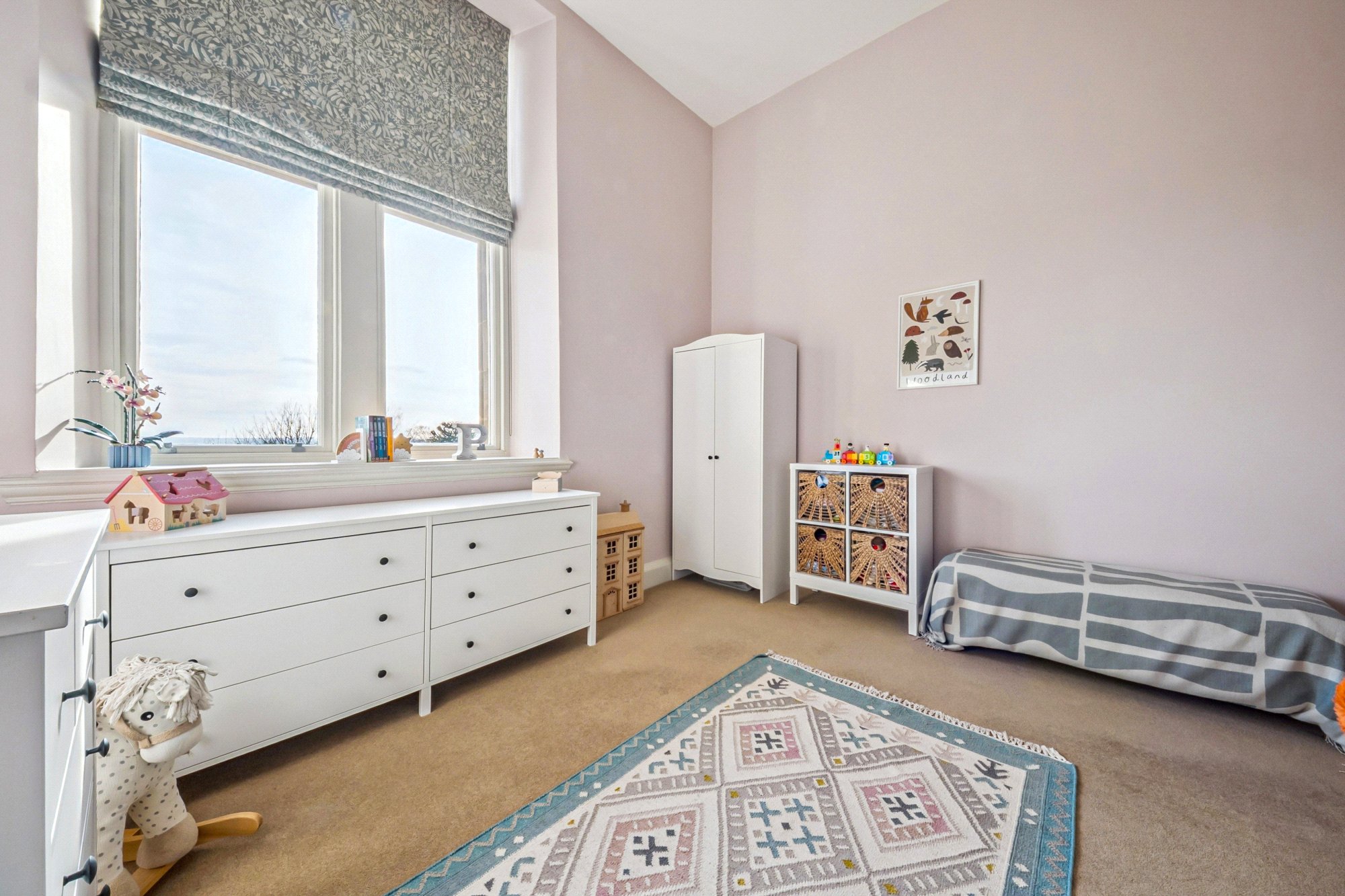 A generous and bright double bedroom with high ceilings and built-in storage. Ideal as a guest room or nursery.