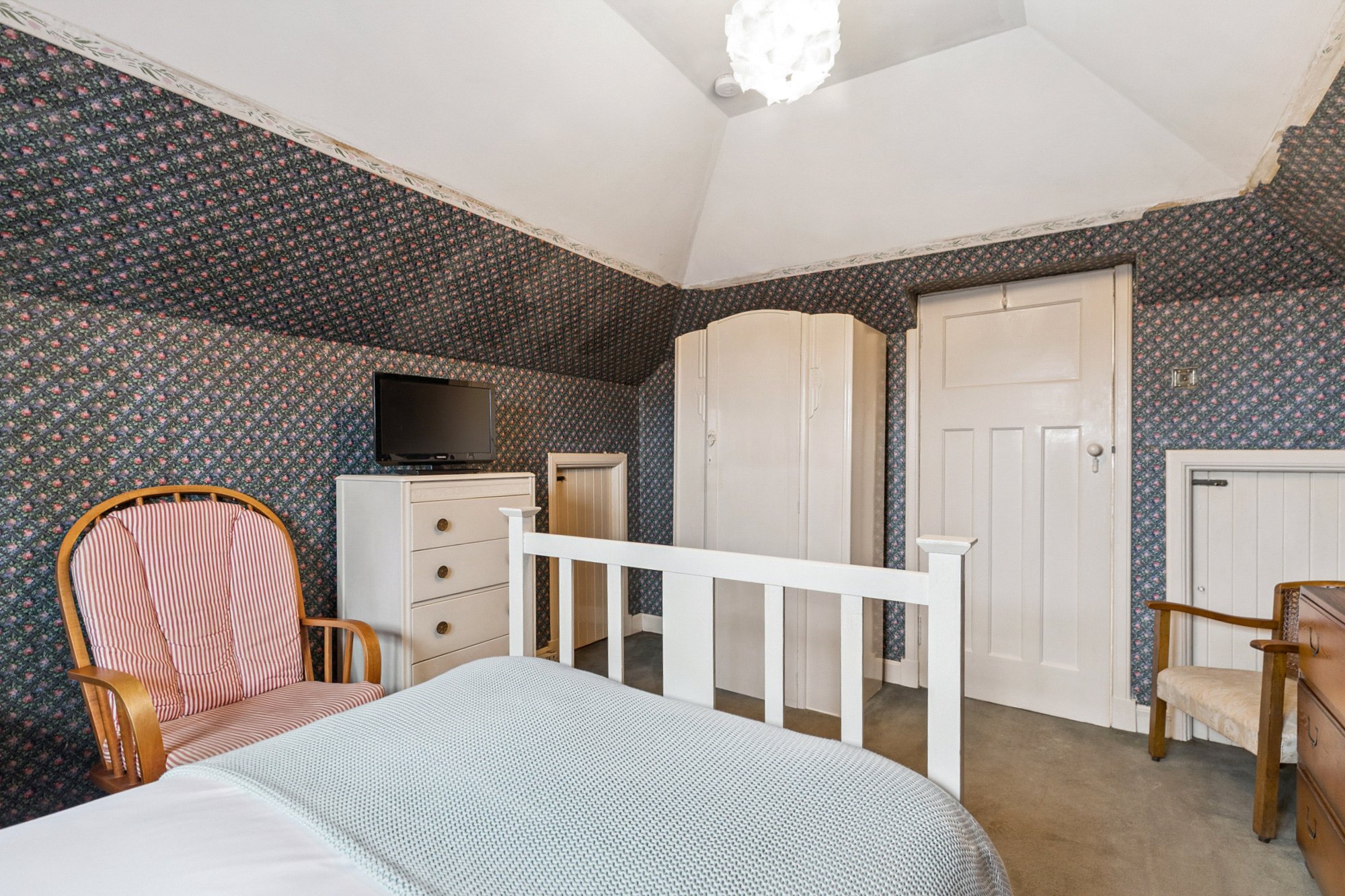 Upstairs, the return flight stair passes a wide dormer window at a ¾ landing. The top landing has door to bedroom 2, a very cottage like room with two-frame dormer window to the side (W) and two access doors to eaves/attic storage.