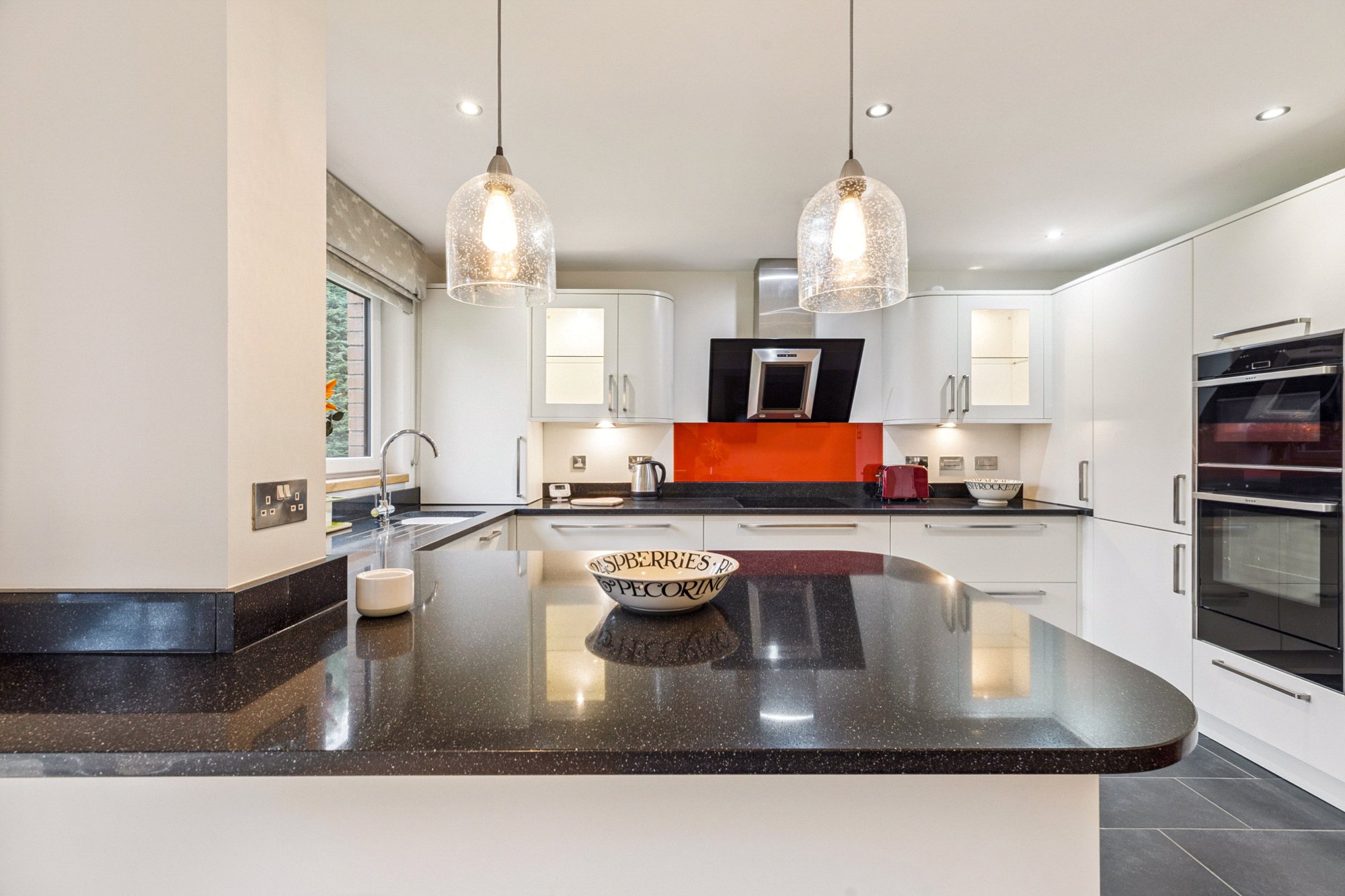 Following entry to the block via an initial entrance vestibule and a security-controlled resident’s hall No.3 has an entrance vestibule itself opening to a very good-sized reception hall, with storage, leading directly to the open-plan dining room and kitchen. The dining room has patio doors to a private sun patio and beyond this the resident’s gardens. It is defined from the kitchen by a peninsula breakfast bar. The kitchen is very smartly fitted and boasts a range of kitchen units by Ultima in matt white offset by granite worktops and matching upstands. Integrated appliances include by Neff a halogen hob, oven (with a “slide & hide” door), combination microwave-oven, and a warming drawer; other appliances include a concealed dishwasher and fridge-freezer, a Miele washing machine, and a Siemens tumble dryer.