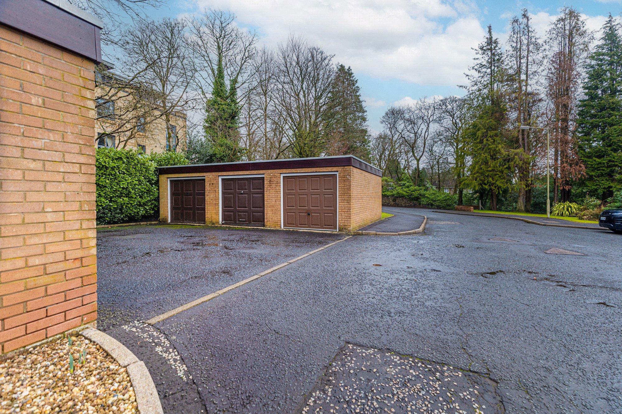 The gardens are generous, level, and fall mainly to grass and follows the line of Chesters Road where a new boundary fence, and pine trees, provide screening. There is parking provision for the residents (not allocated) and, as with all the other apartments, No.3 has its own single garage where the garage door was renewed. The development is factored and managed by Taylor Martin (4 Berkeley St, Glasgow, G3 7DW).