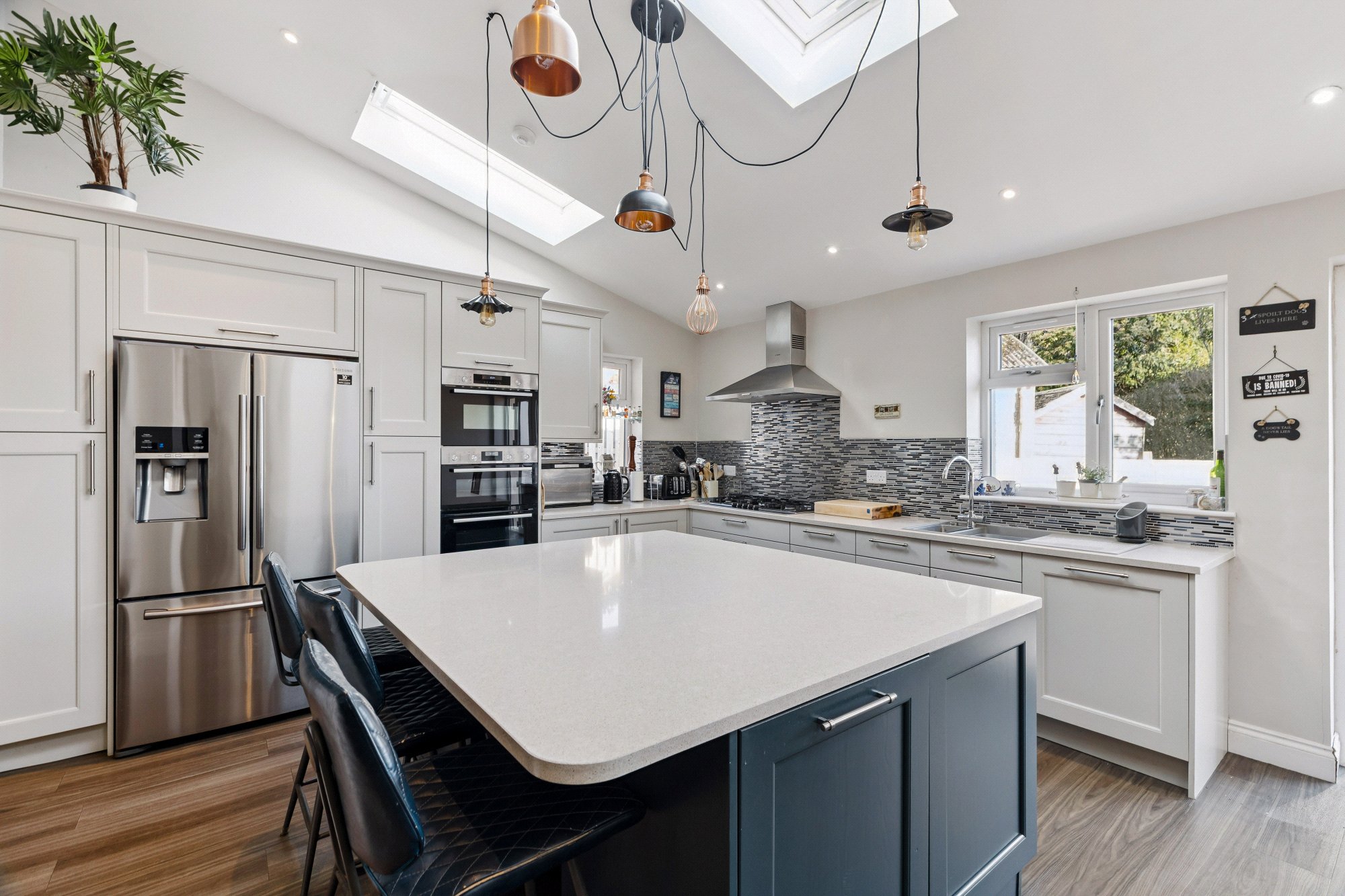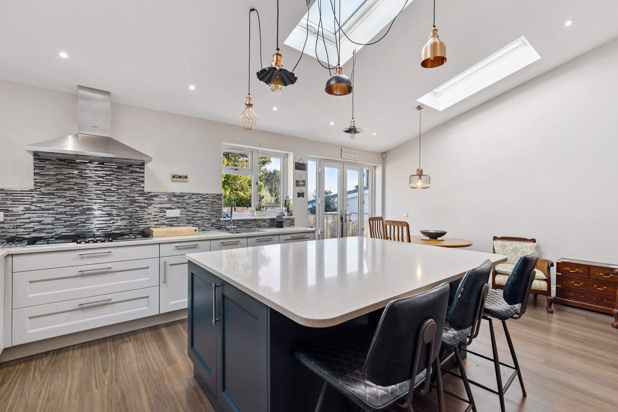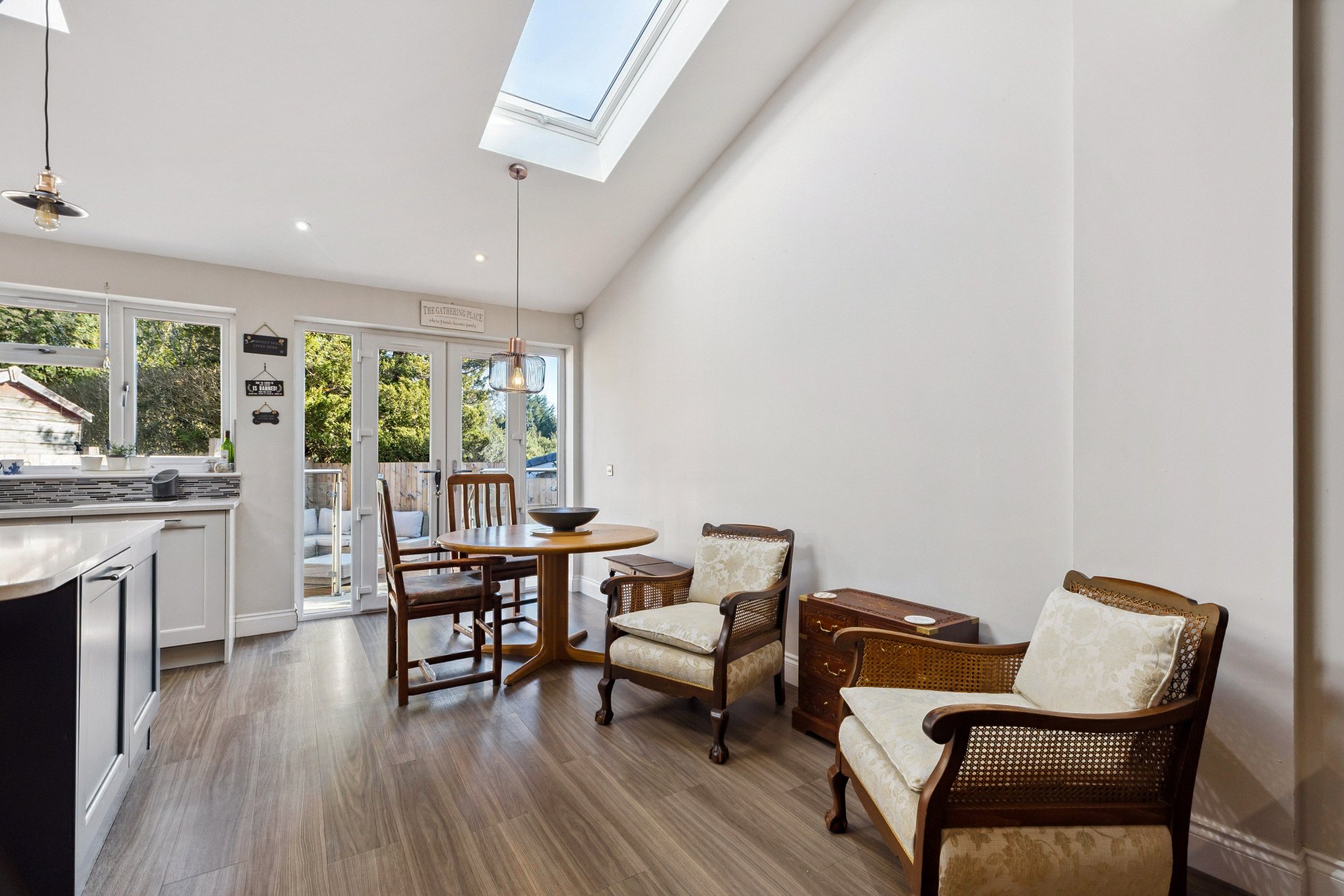 Occupying a commanding corner position on and set upon a large, manicured garden plot, this chalet style bungalow was originally constructed by John Lawrence in the 1960’s and has been successfully reconfigured and renovated to a high standard throughout. The property features fantastic proportions and offers a great deal of flexibility, where rooms could be used as family needs demand. An undoubted highlight is the superb open plan living/dining/kitchen space – a really striking area highlighted by Velux windows and perfect for family use and entertaining in equal measure.