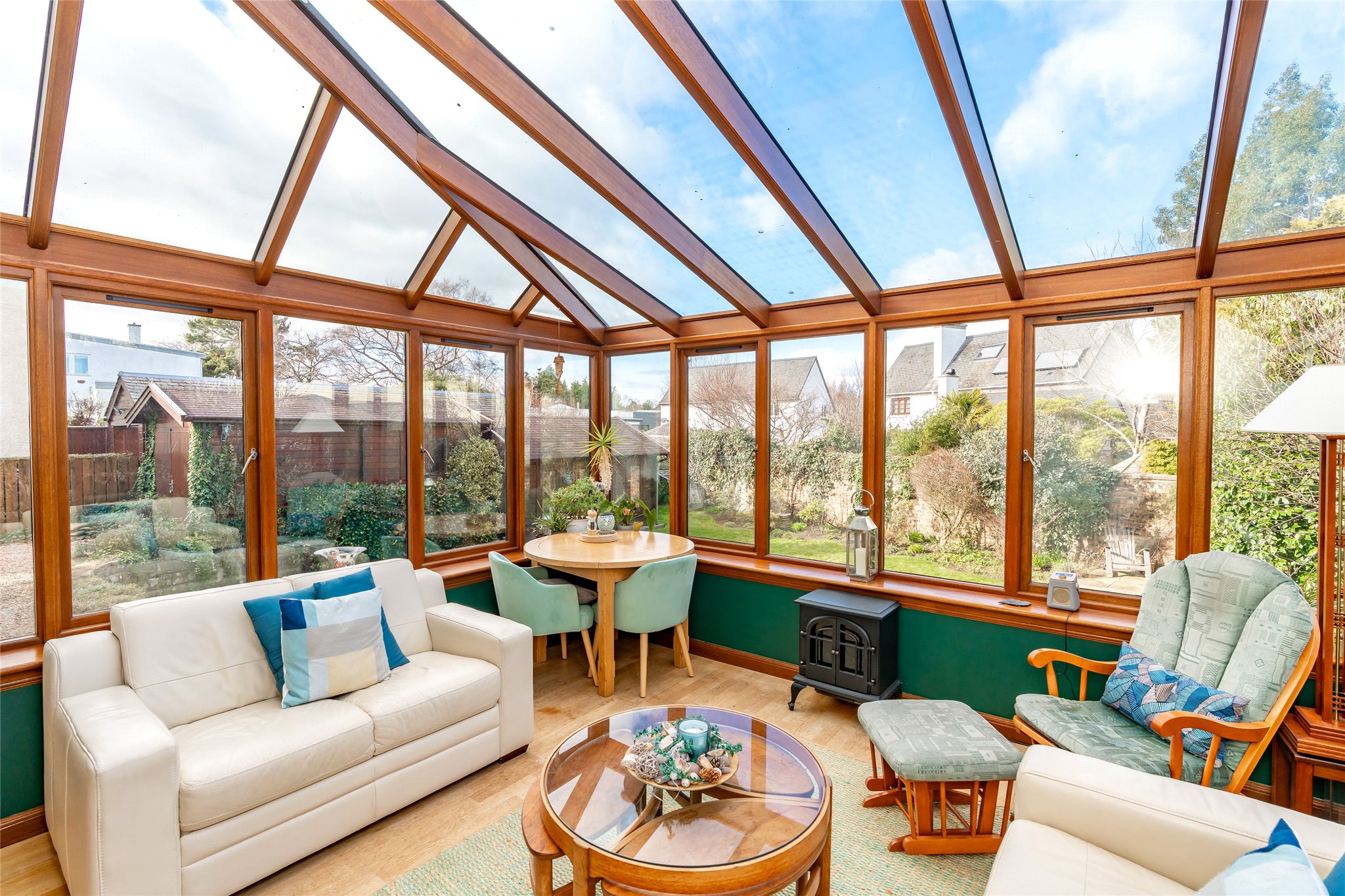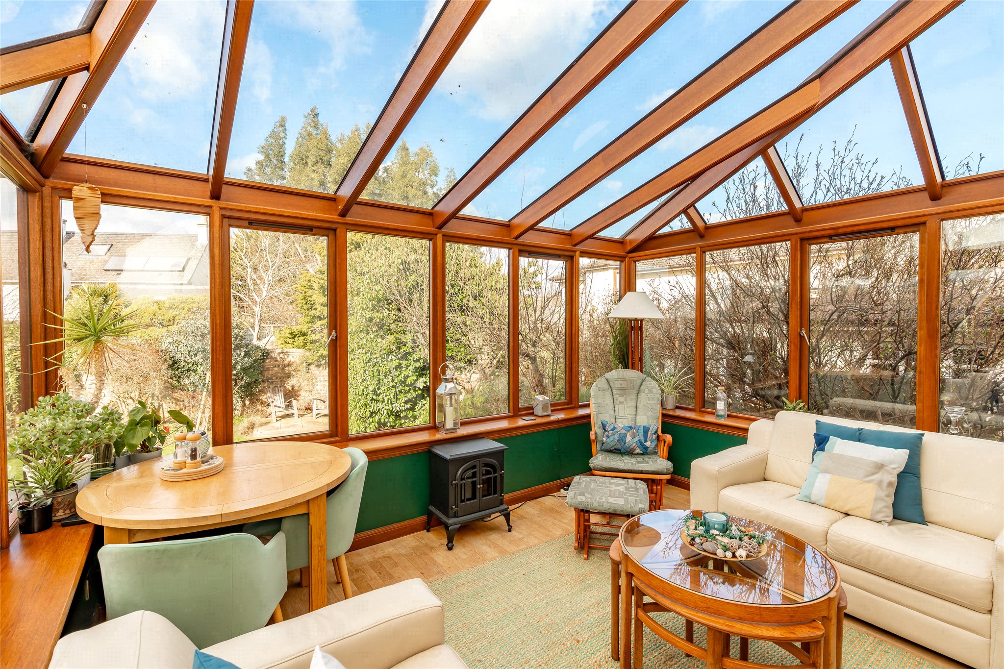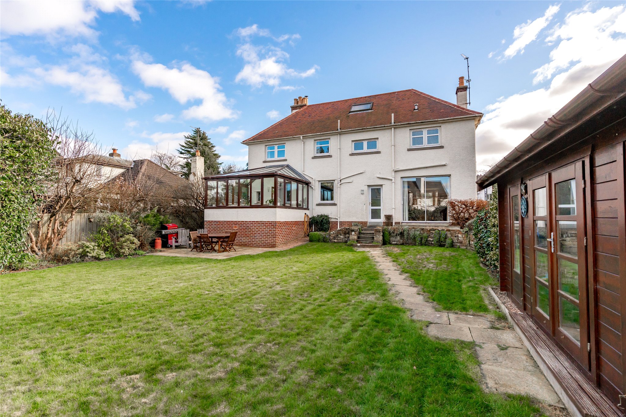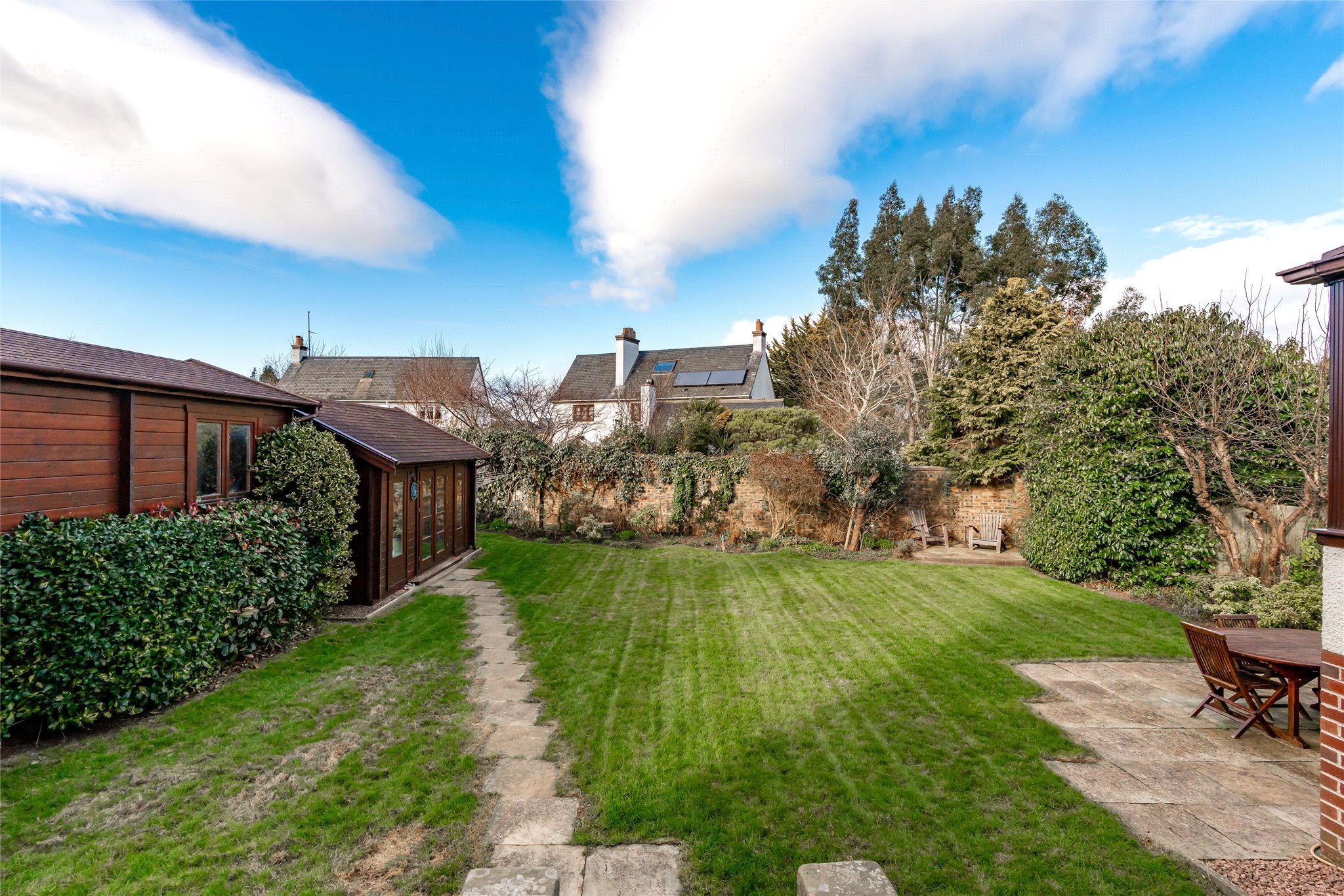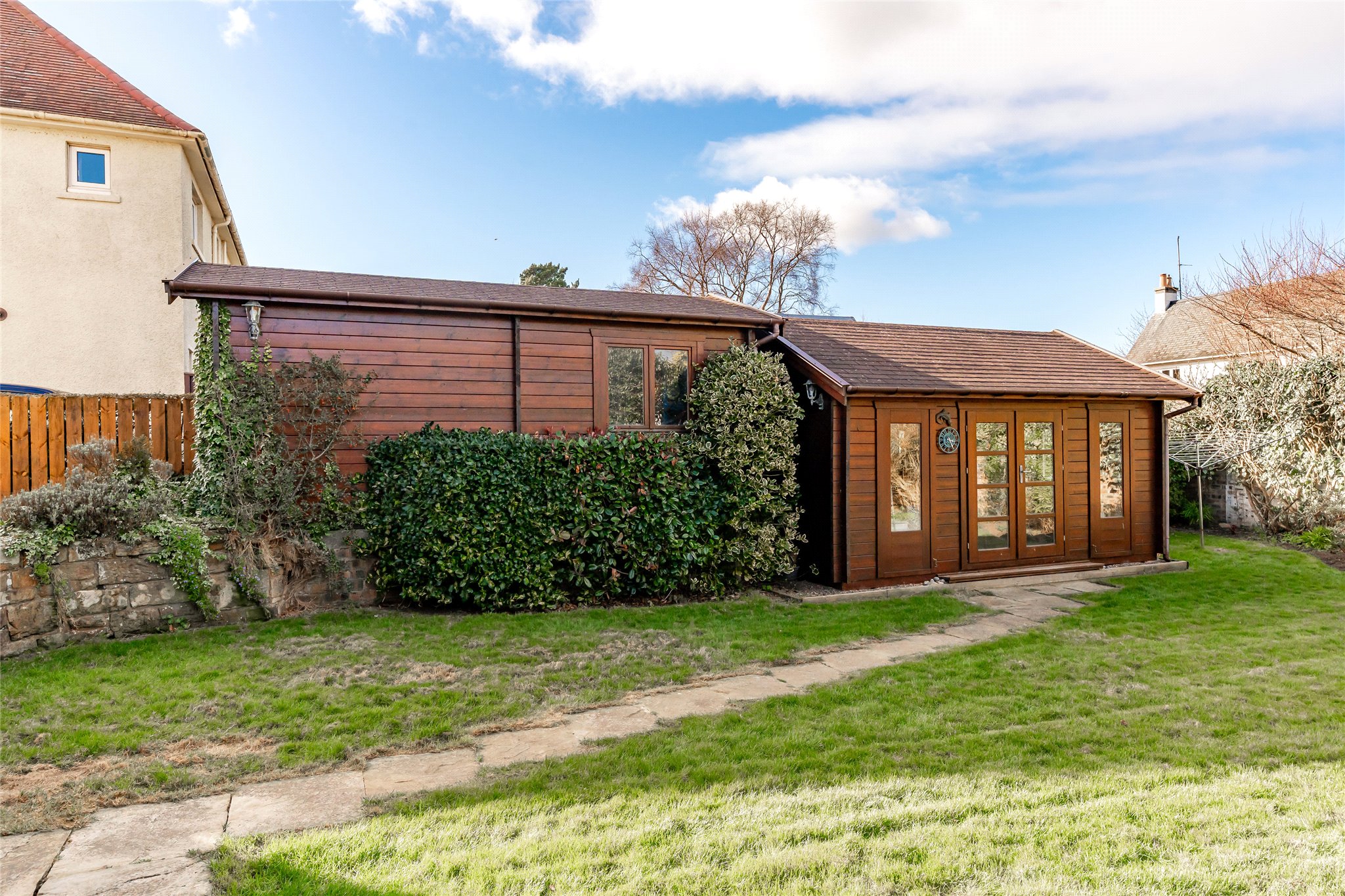 The spacious rear garden boasts a neatly maintained lawn and sandstone paving, creating charming areas perfect for outdoor dining and relaxing. A desirable timber-clad garden studio (fully insulated) adds to its appeal and would make a peaceful home office, guest accommodation, or retreat for pursuing hobbies.