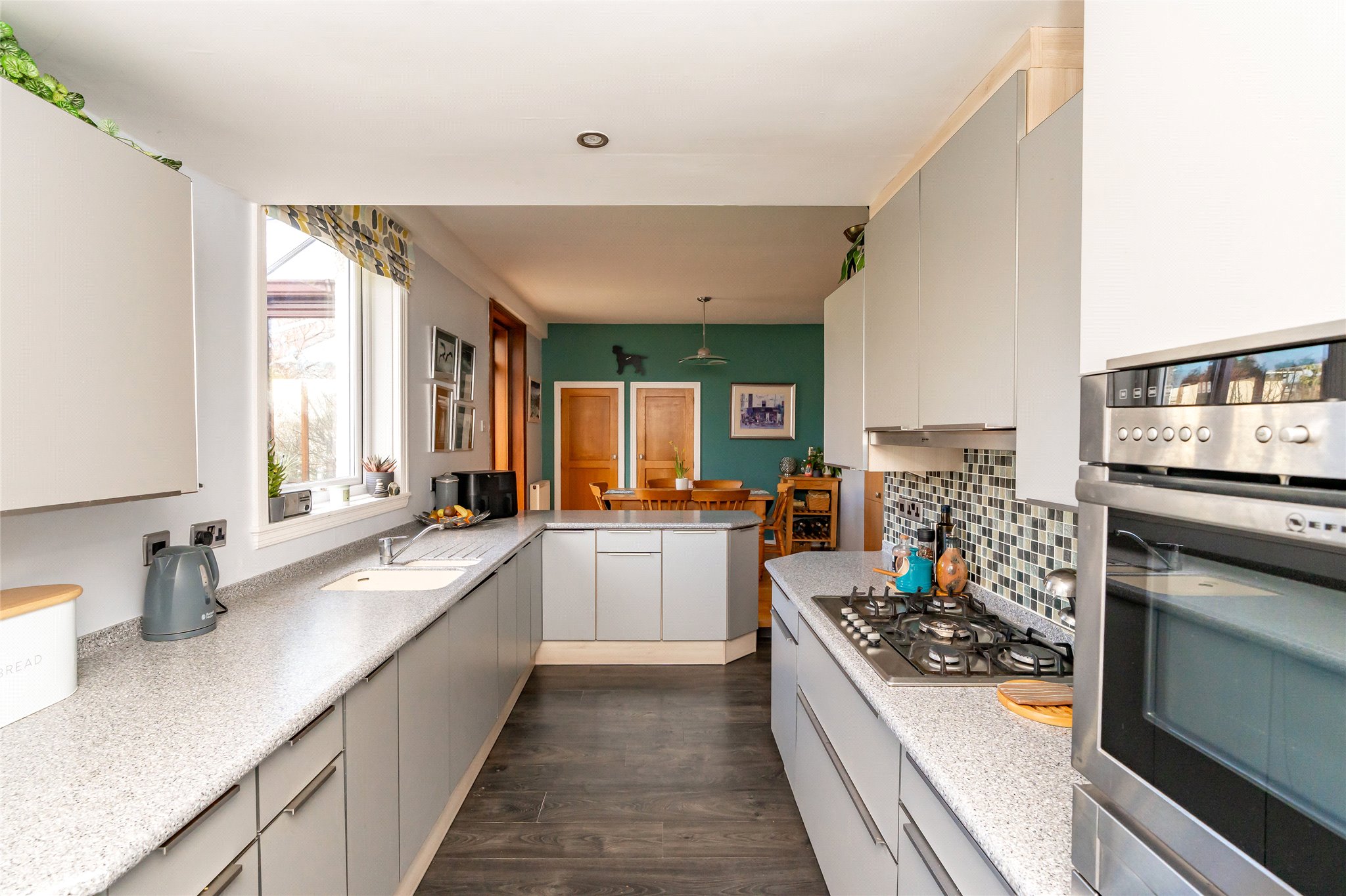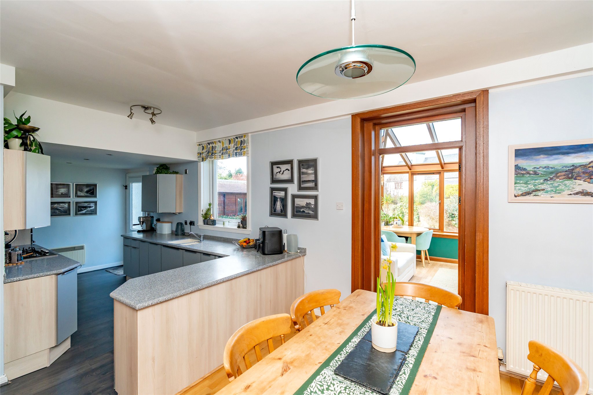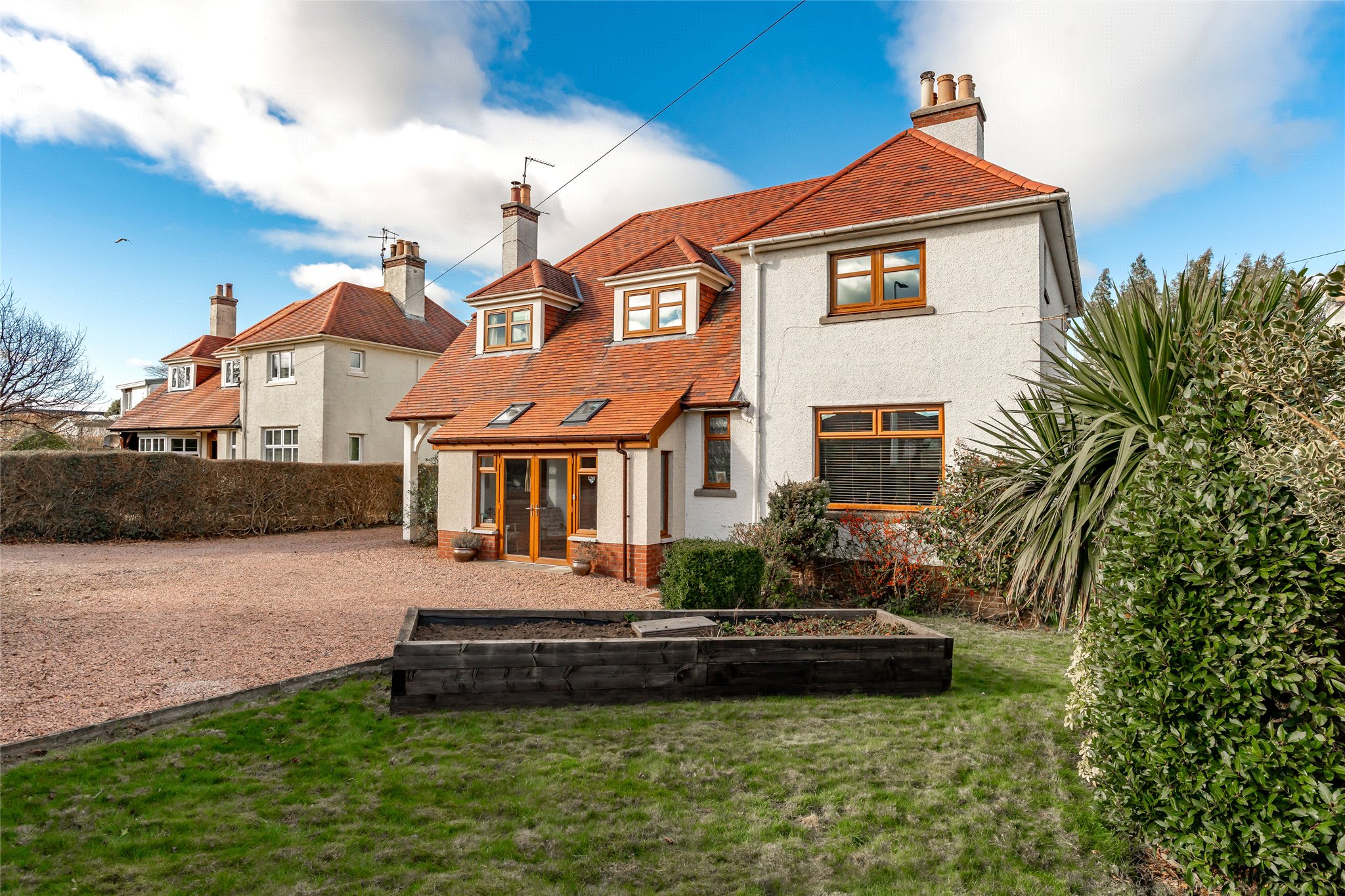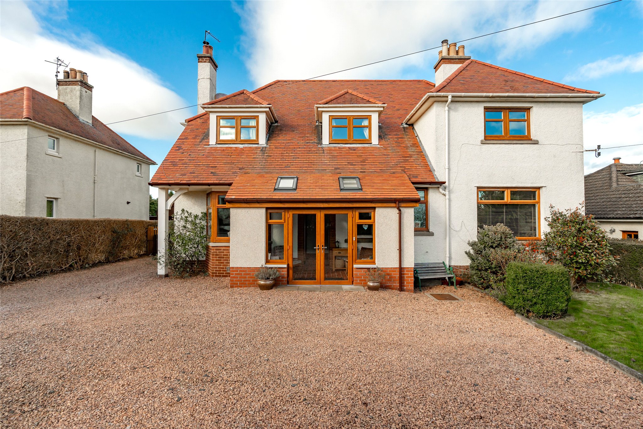 Located in a sought-after setting on the edge of St Andrews, this substantial detached four/five-bedroom family home with well-presented stylish interiors offers an abundance of space, light, and comfort. A gravel driveway, bordered by a manicured lawn, mature plants, and hedging, leads to fully glazed double doors that open into a bright and sizeable south-facing entrance vestibule. Featuring terracotta floor tiles, this inviting skylit space offers a peaceful spot to sit and unwind. From here, the welcoming hallway flows into an expansive dual-aspect living room that stretches nearly the entire length of the property. Flooded with natural light, it features sliding patio doors opening to the rear garden and south-facing bay windows overlooking the front. An ideal setting for relaxation and entertaining, it exudes warmth and charm with wooden flooring and a log-burning stove set within a stone hearth. Across the hallway, an impressive dining kitchen connects seamlessly to the rear garden and a sunlit conservatory. Thoughtfully designed, a change in flooring and a peninsula counter subtly distinguish the kitchen from the dining area, creating a perfect space for everyday living. The generously sized kitchen showcases sleek grey wall and floor units, Corian worktops with integrated sink, and a colourful mosaic-tiled splashback. High-spec integrated NEFF appliances include an eye-level grill, oven, gas hob, and extractor hood, ensuring both style and functionality. Built-in cupboards in the dining area offer additional storage. Adjoining, the conservatory with its panoramic garden views, is a versatile living and reception area that further enhances the property’s appeal. Completing the ground floor is a WC and a flexible south-facing double bedroom or office, featuring a large picture window overlooking the front garden and a log-burning stove set in an elegant cast-iron fireplace. Ascending the carpeted staircase, a spacious and light-filled landing leads to four tastefully decorated and comfortable double bedrooms. The south-facing principal bedroom, with its tranquil grey colour palette, includes multiple built-in cupboards for ample storage and a stylish en-suite shower room. The remaining bedrooms are equally appealing, sharing access to a contemporary family bathroom equipped with a shower enclosure, bath, washbasin built into vanity, and a WC. Additionally, a large partially floored attic with a VELUX window provides extra space, ideal for storage or potential future development.