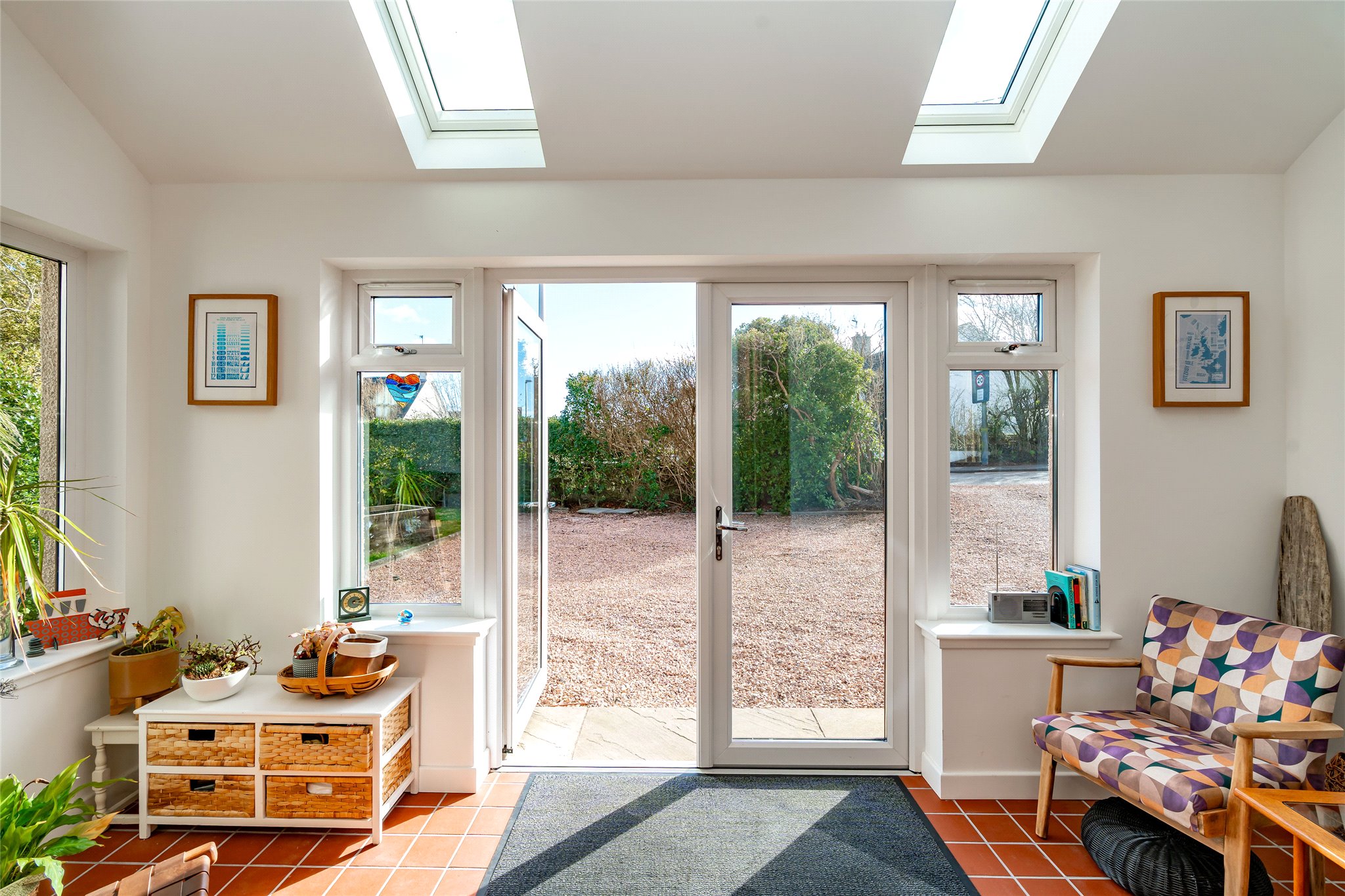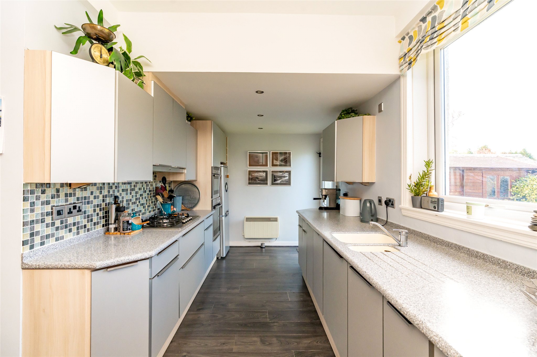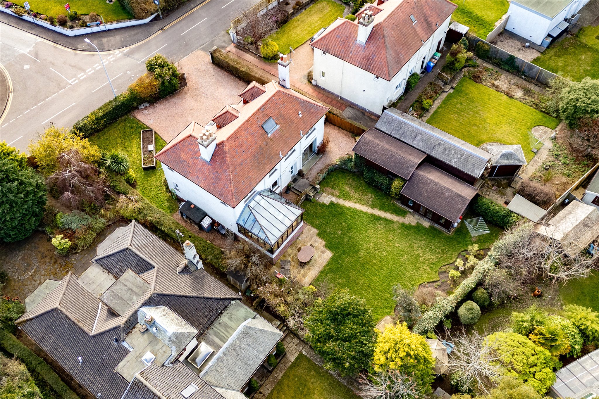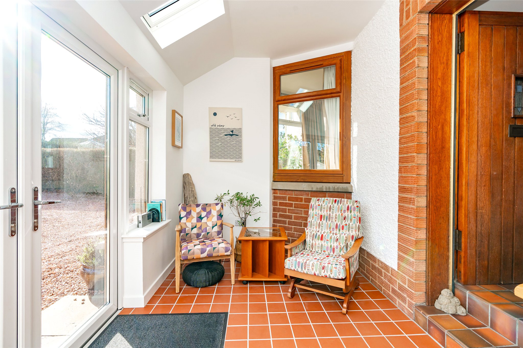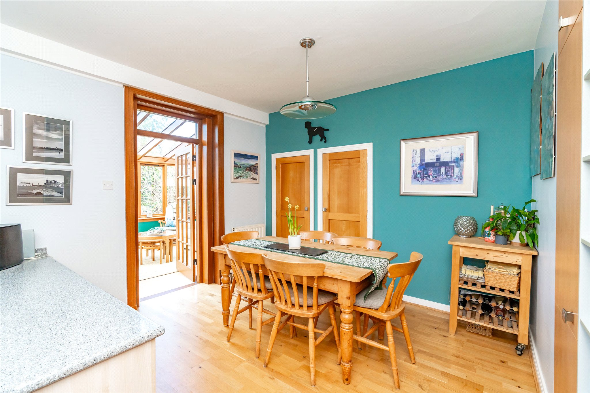 Located in a sought-after setting on the edge of St Andrews, this substantial detached four/five-bedroom family home with well-presented stylish interiors offers an abundance of space, light, and comfort. A gravel driveway, bordered by a manicured lawn, mature plants, and hedging, leads to fully glazed double doors that open into a bright and sizeable south-facing entrance vestibule. Featuring terracotta floor tiles, this inviting skylit space offers a peaceful spot to sit and unwind. From here, the welcoming hallway flows into an expansive dual-aspect living room that stretches nearly the entire length of the property. Flooded with natural light, it features sliding patio doors opening to the rear garden and south-facing bay windows overlooking the front. An ideal setting for relaxation and entertaining, it exudes warmth and charm with wooden flooring and a log-burning stove set within a stone hearth. Across the hallway, an impressive dining kitchen connects seamlessly to the rear garden and a sunlit conservatory. Thoughtfully designed, a change in flooring and a peninsula counter subtly distinguish the kitchen from the dining area, creating a perfect space for everyday living. The generously sized kitchen showcases sleek grey wall and floor units, Corian worktops with integrated sink, and a colourful mosaic-tiled splashback. High-spec integrated NEFF appliances include an eye-level grill, oven, gas hob, and extractor hood, ensuring both style and functionality. Built-in cupboards in the dining area offer additional storage. Adjoining, the conservatory with its panoramic garden views, is a versatile living and reception area that further enhances the property’s appeal. Completing the ground floor is a WC and a flexible south-facing double bedroom or office, featuring a large picture window overlooking the front garden and a log-burning stove set in an elegant cast-iron fireplace. Ascending the carpeted staircase, a spacious and light-filled landing leads to four tastefully decorated and comfortable double bedrooms. The south-facing principal bedroom, with its tranquil grey colour palette, includes multiple built-in cupboards for ample storage and a stylish en-suite shower room. The remaining bedrooms are equally appealing, sharing access to a contemporary family bathroom equipped with a shower enclosure, bath, washbasin built into vanity, and a WC. Additionally, a large partially floored attic with a VELUX window provides extra space, ideal for storage or potential future development.