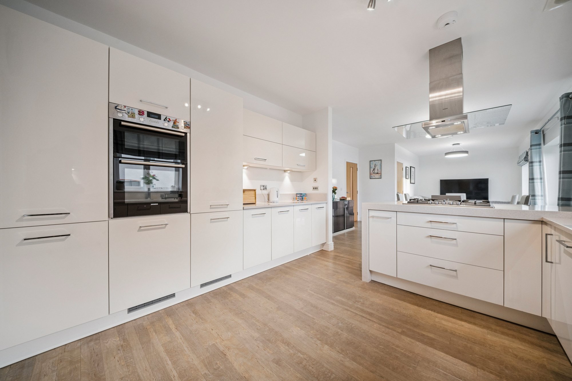 Spanning over almost 2,400 square feet, the property is entered via a vestibule into a spacious hallway leading to a fabulous kitchen/ dining/ sitting room. The kitchen is of high specification inlcuding silestone worktops and a double oven, as well as french doors to the garden. The kitchen leads to a useful utility room with sink and garden access. This floor also benefits from a living room with triple aspect windows and large double garage with electric doors. This floor is complete with a downstairs WC and four storage cupboards.