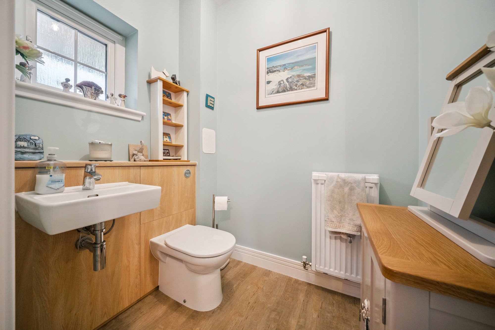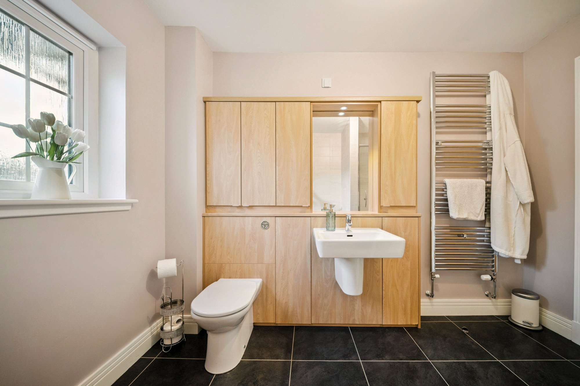 Upstairs, there are five double bedrooms, two with ensuite, and a further family bathroom, all completed to a high specification. The principal bedroom is to the front with large built-in wardrobes and an en suite bathroom with twin sinks. The second bedroom has fitted wardrobes and an en suite shower room. There are three further double bedrooms, all with fitted wardrobes, and a large family bathroom with bath and separate shower cubicle. In addition, there is one spacious shelved storage cupboard off the landing.