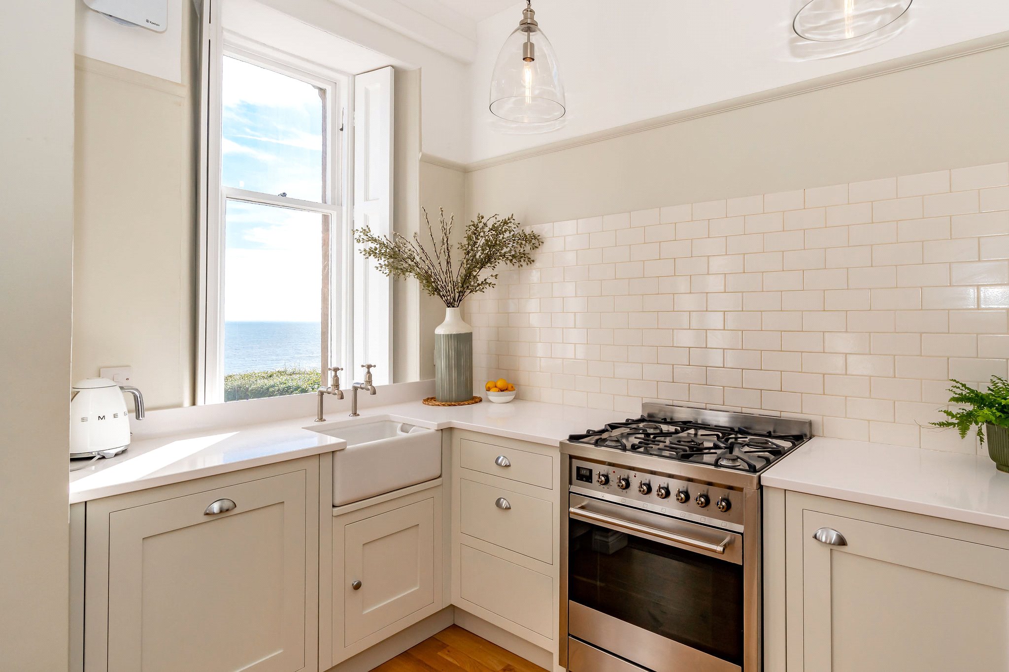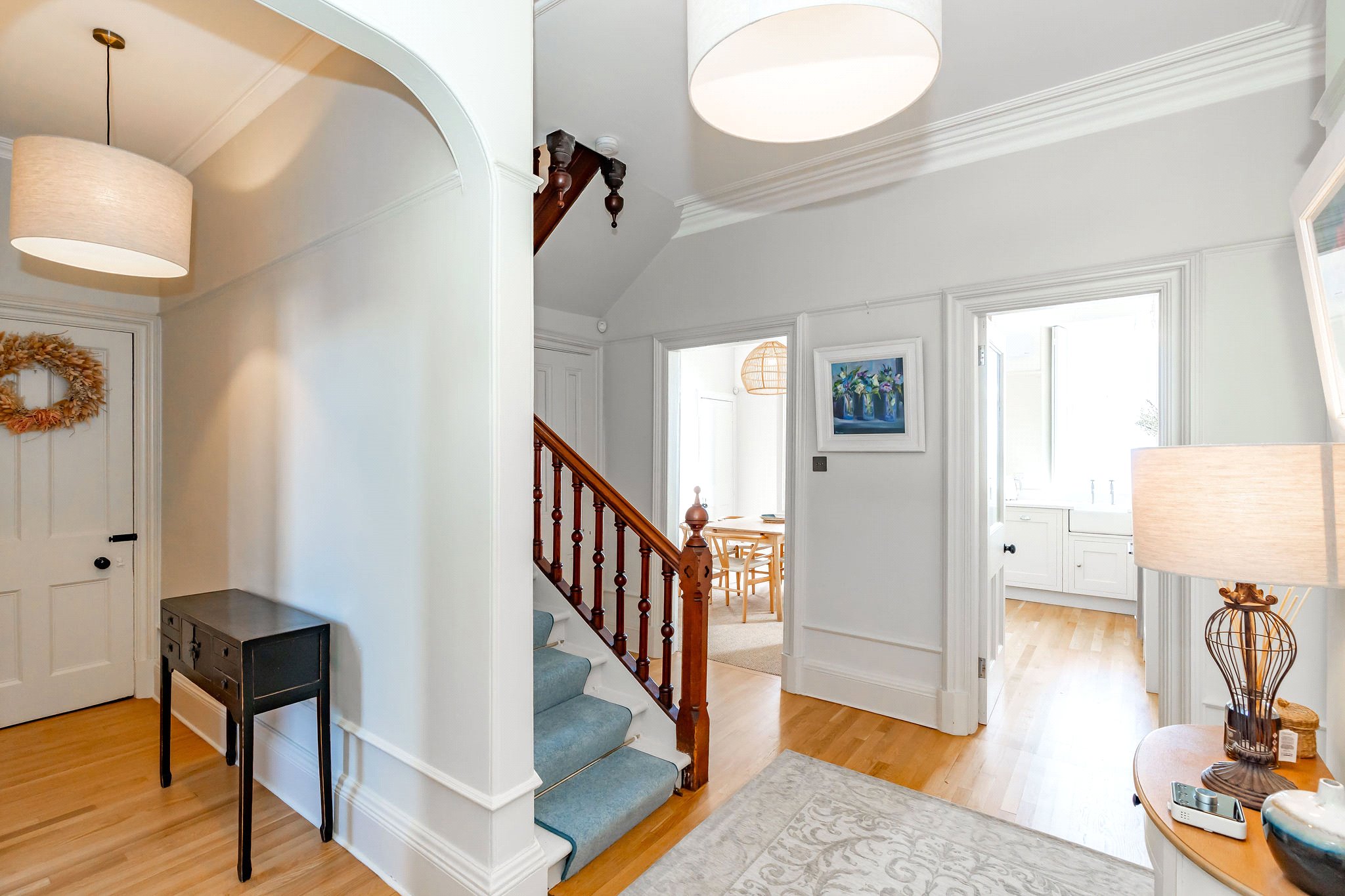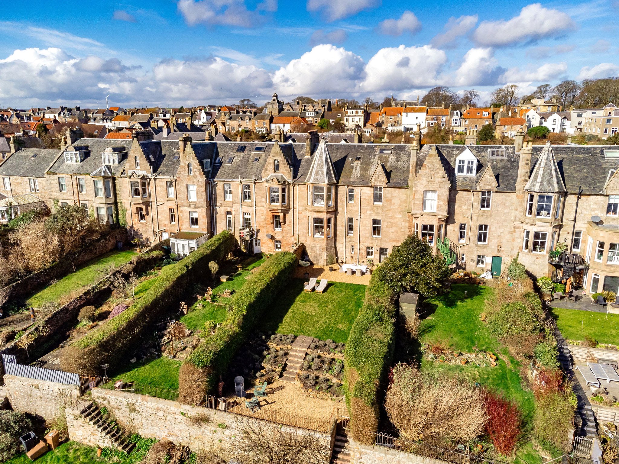 Proudly positioned on one of Crail’s most historic and coveted residential streets, 22 Nethergate South offers a rare opportunity to acquire a magnificent five-bedroom category B-listed Victorian townhouse arranged over three levels. Once the home of George Downie who built the neighbouring grand properties in this locale, this handsome residence lies behind a manicured hedge, with a pathway flanked by a neat lawn leading to the front door. Opening into a charming entrance vestibule and hallway decorated in soft neutrals, you are led to a magnificent living room where a sash and case bay window frames captivating views across the garden to the sea. Immaculately finished a tasteful interior design provides the backdrop to high ceilings, exquisite cornicing, wooden flooring, and a log-burning stove set into an original marble mantlepiece. The effect is one of sophisticated grandeur, yet the overall ambience is warm and inviting. A light and airy south-facing double bedroom complete with wooden flooring, an idyllic window seat and an original feature fireplace awaits on this floor along with an impressive bathroom featuring a roll-top bath, rainfall shower, a WC and washbasin. Across the hallway, the light-filled dining kitchen enjoys the same spectacular picture postcard coastal aspect and chic décor of the living room. A natural divide is created with two entrances and a thoughtful corner kitchen layout opens up the dining area. White metro tiles, a Belfast sink, and stone worktops provide a stunning contrast to the hand-painted bespoke base units and striking stainless steel oven and five-ring gas hob. With a built-in pantry and log-burning stove, it is a beautifully finished room that effortlessly achieves functionality with a refined modern style. From here, you descend to the basement level of the property. A true hidden gem this is the location of a light and airy farmhouse kitchen leading out through an original stable door to the spectacular garden. Butcher block worktops, a Belfast sink and a high-spec cooker are set against black flagstone flooring, whilst a cosy seating area is a perfect spot for informal dining. There is a convenient WC adjacent and a utility for additional storage. Returning to the ground floor a skylit staircase with an original carved mahogany banister takes you to a spacious carpeted first floor landing and four double bedrooms. The luxurious bay windowed principal double bedroom boasts a magazine-worthy interior design of plush carpeting, a calm colour palette, intricate cornicing, and a log-burning stove nestled under a white mantle. Its appeal as a serene retreat is amplified by its mesmerising garden and sea outlook. Each of the three additional double bedrooms are wonderfully presented and share access to a shower room finished in a classic style complete with a cast iron towel radiator, washbasin, and WC. This floor benefits from a versatile south-facing home office/study.