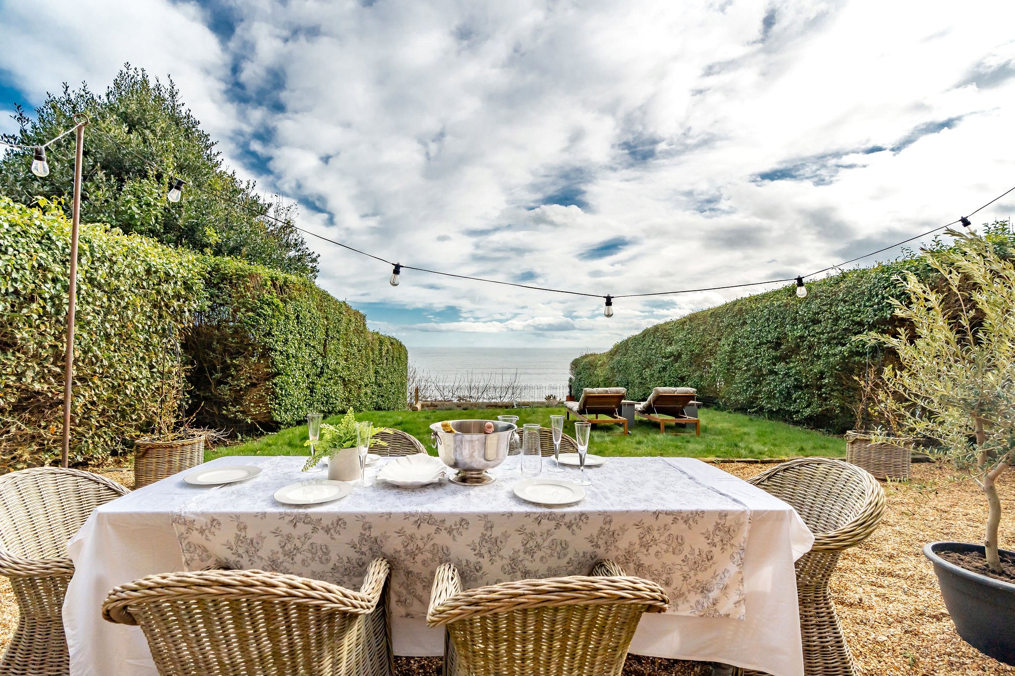 The rear garden nestled between two manicured hedges for enhanced privacy is truly breathtaking. Two tranquil alfresco dining areas sit at either end of a lush lawn all offering captivating views of the sea. Whether for family celebrations, summer drinks, or evenings spent entertaining friends this garden is enchanting.
