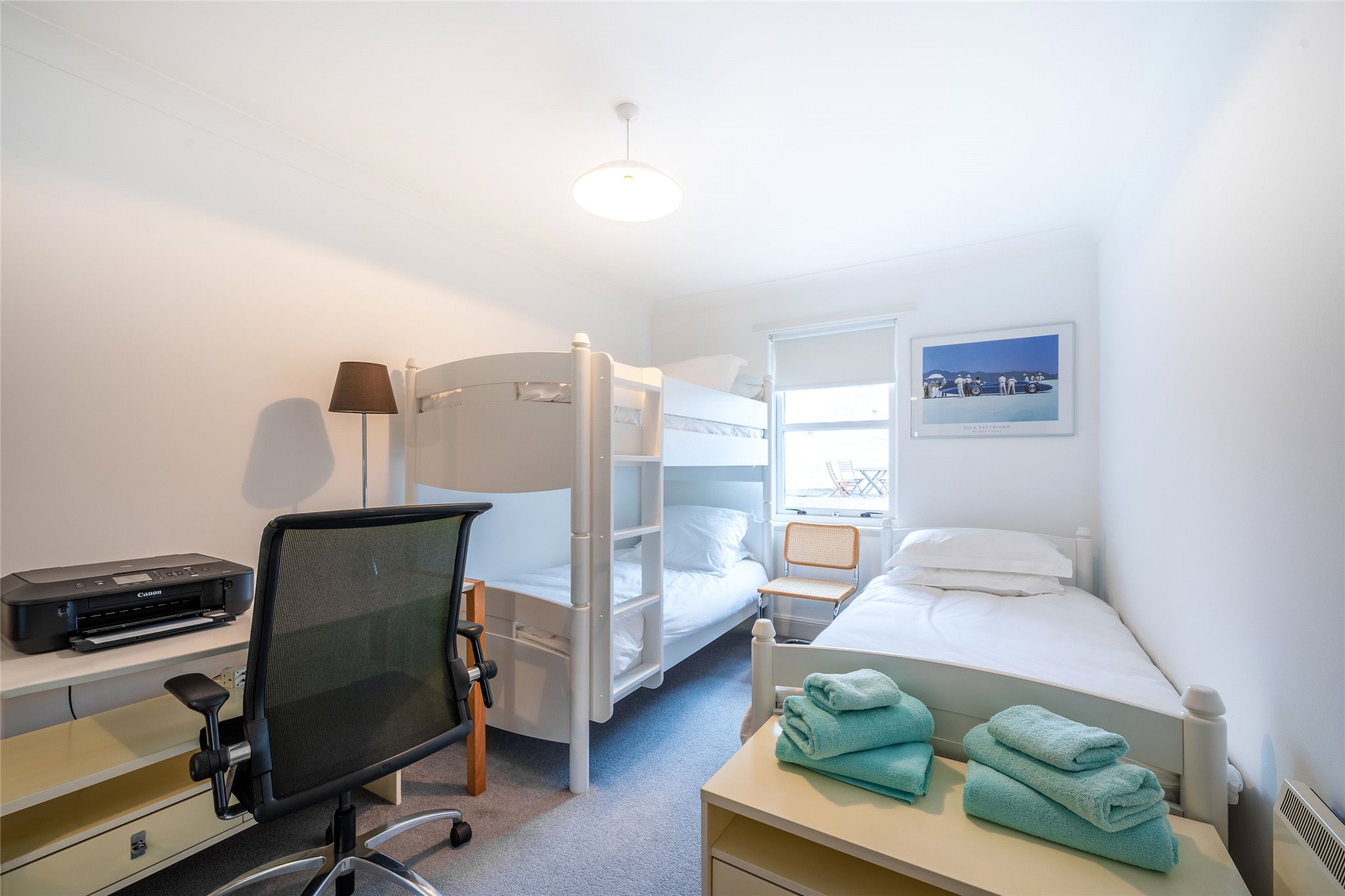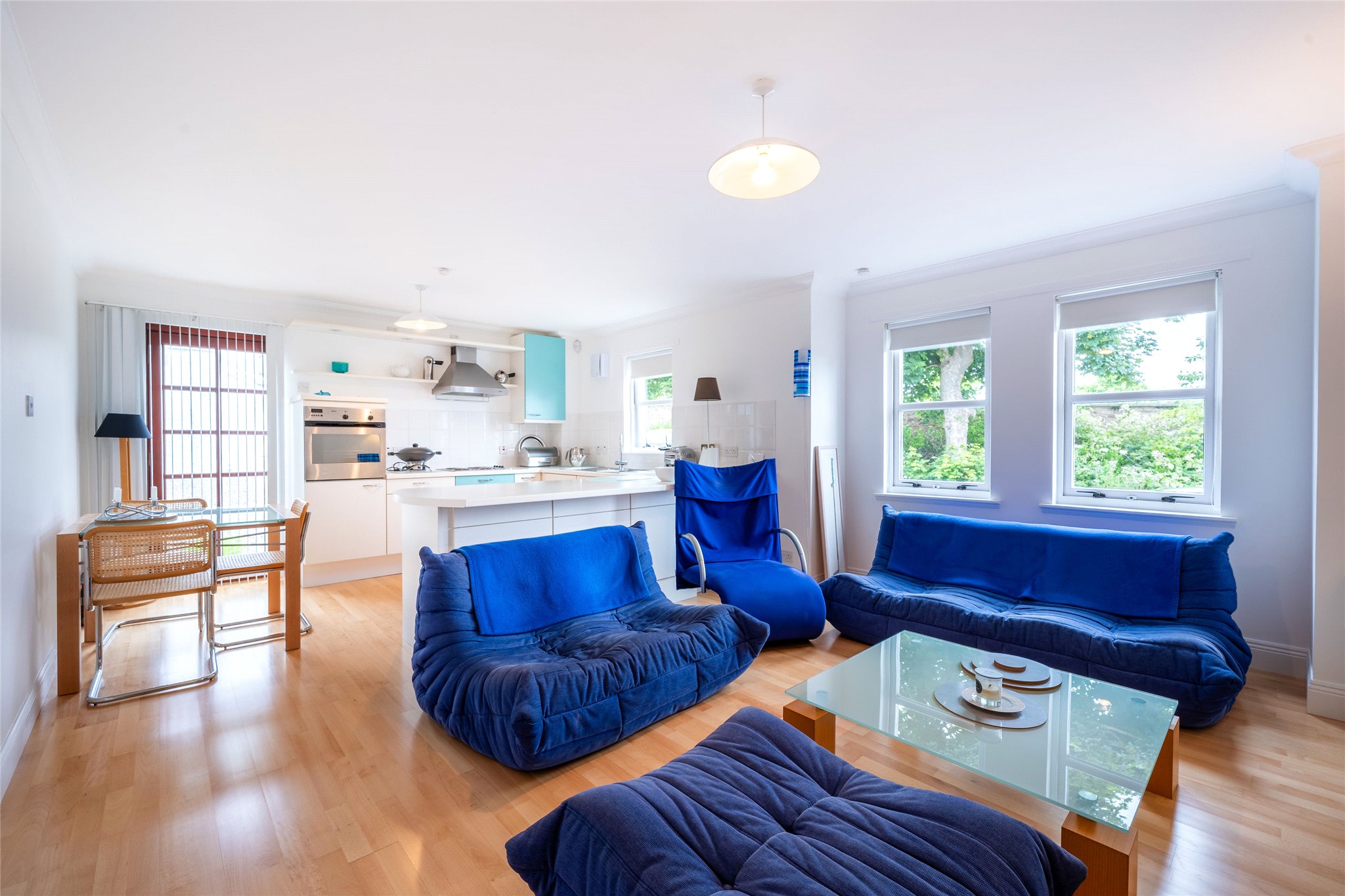 Presented in excellent condition, this two-bedroom ground floor apartment minutes from Elie’s spectacular beach will make for a desirable investment or home. Entering on the ground floor, the light, airy hallway adorned with Junckers Solid Beech flooring and boasting a sizeable utility walk-in cupboard ushers you into a bright triple-aspect living room and kitchen. Complementing the hallway in terms of décor, this open-plan living and reception area with garden access has a wonderful feeling of space and comfort. Separated from the living room by a peninsula breakfast bar, the U-shaped Poggenpohl kitchen showcases white and turquoise wall and floor units, smooth white worktops and a tiled splashback. Integrated appliances include an eye-level oven, a hob, an extractor hood, two under-counter Siemens fridges, and a Miele washing machine. Along with a breakfast bar, the layout allows for more formal dining. The two double bedrooms are both spacious and tastefully decorated with built-in mirrored wardrobes and carpeting. They share access to a well-appointed bathroom complete with a WC, washbasin and bath with a wall-mounted shower.