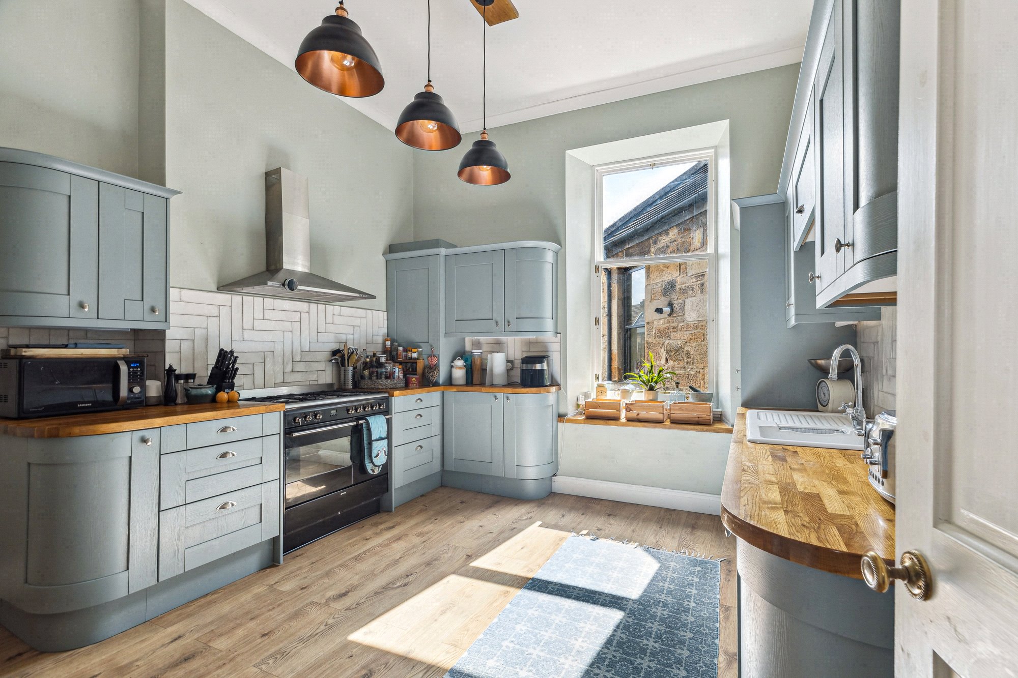 - Impressive dining kitchen complete with a range of base and wall units, integrated appliances, butcherblock worktops, dining recess and window to the front