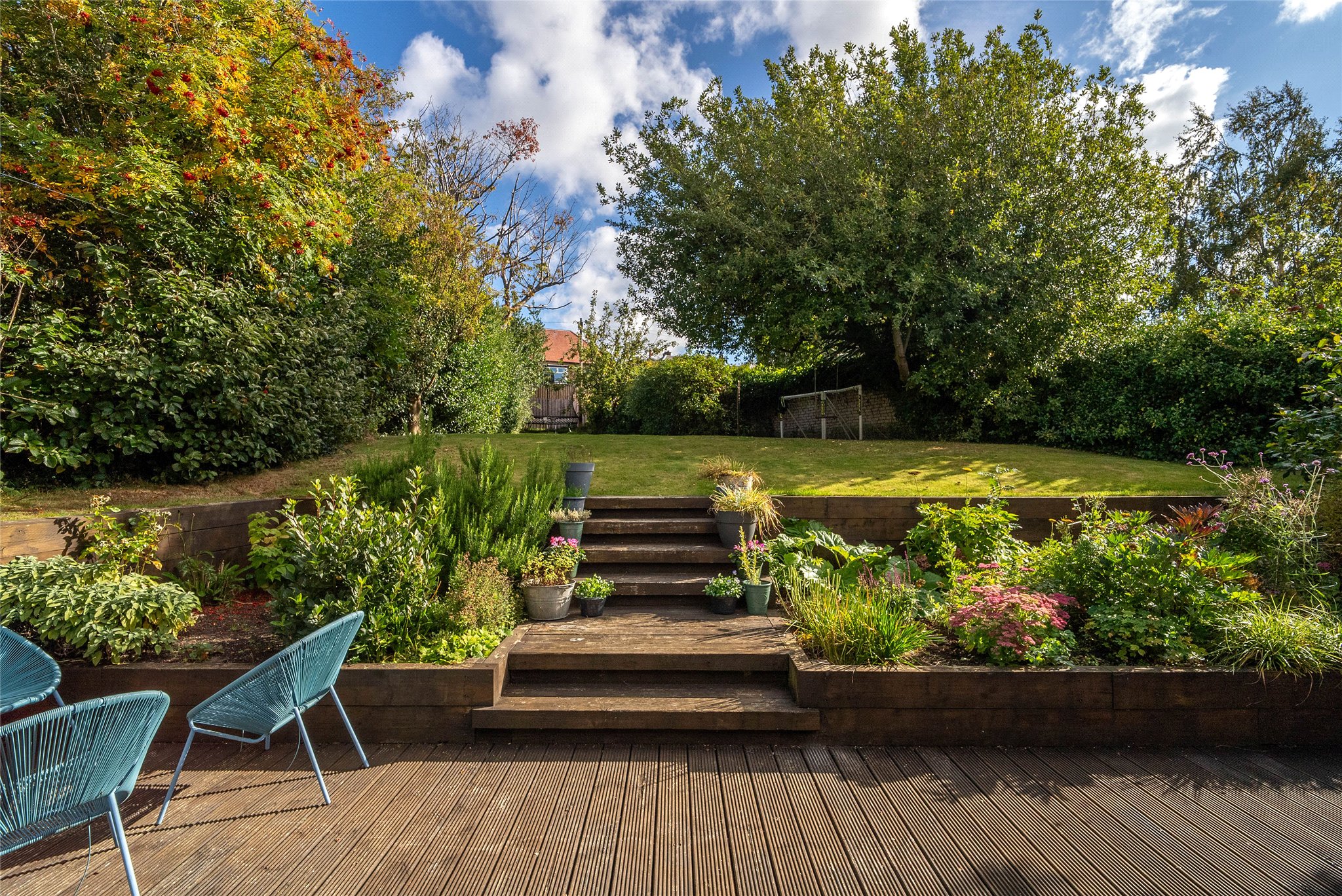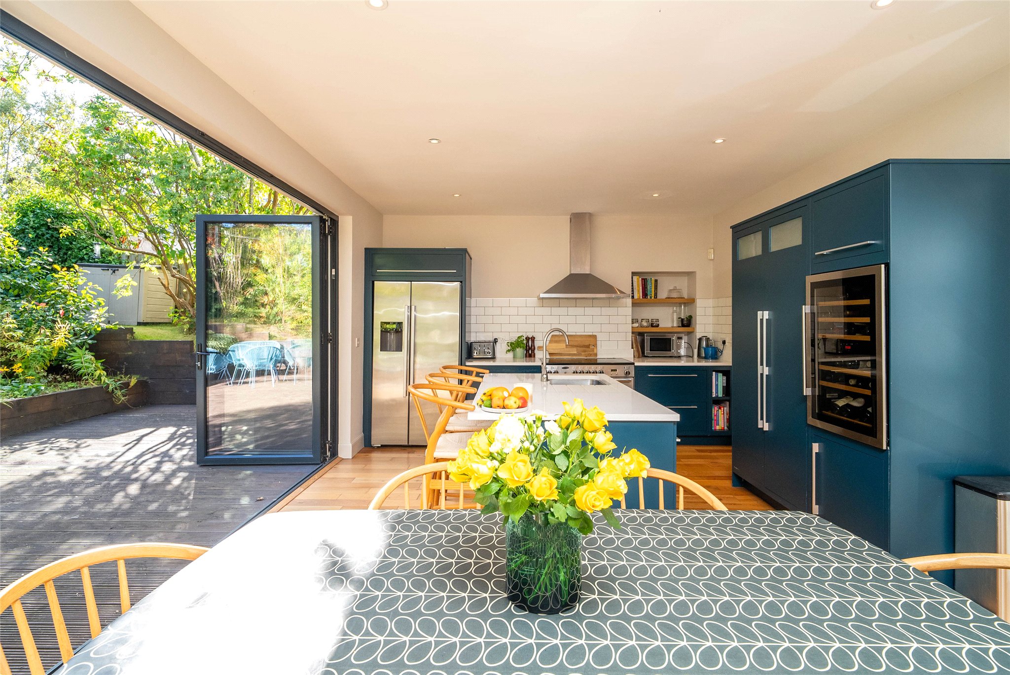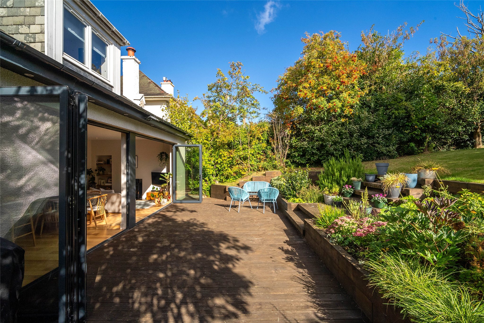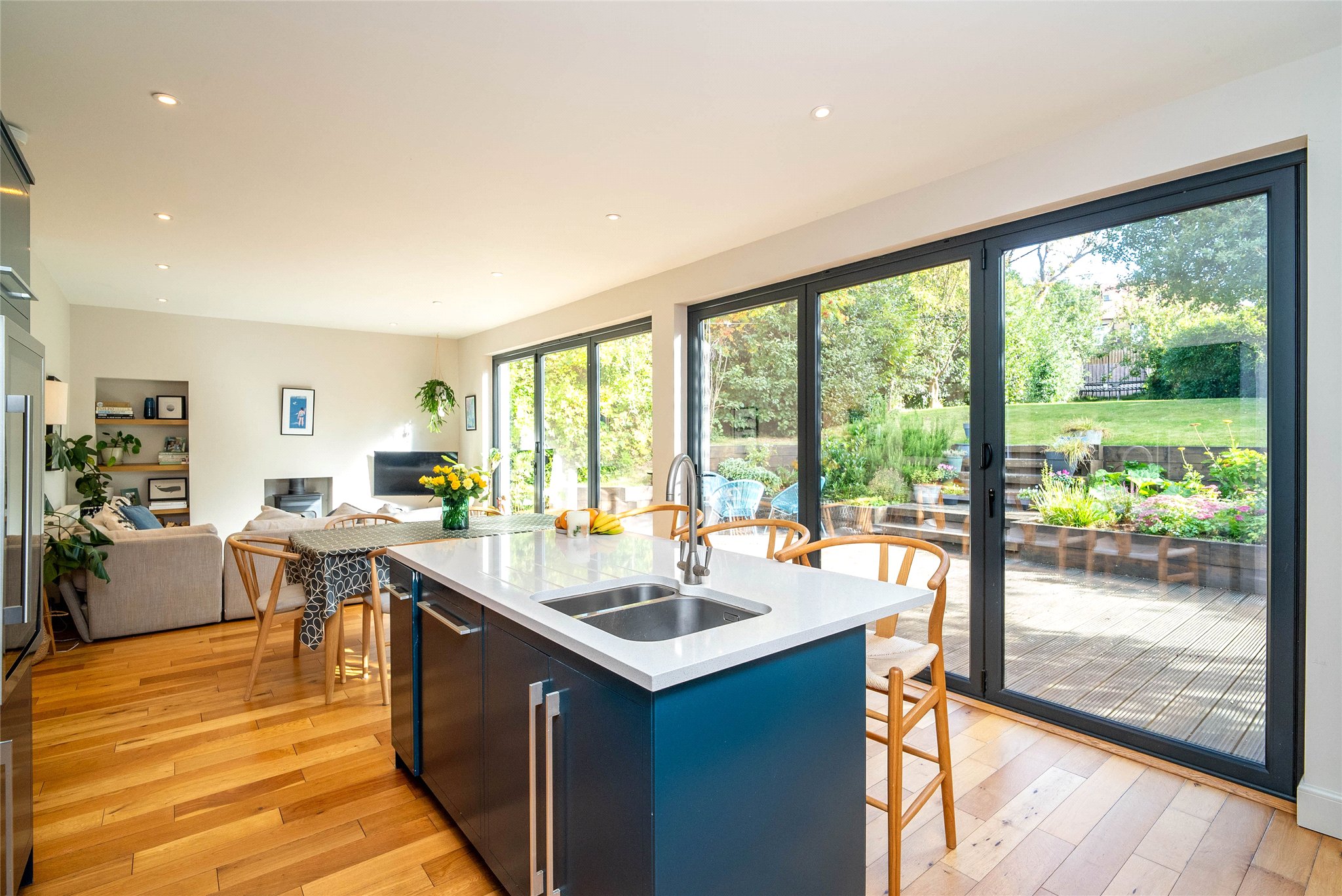 The property features a plethora of highlights including a large open plan kitchen/dining/family room running with wood-burning stove, a chic modern kitchen with integrated appliances and ample space for dining. Directly accessible from this elegant space through bi-folding doors is beautifully landscaped tiered garden with easterly aspect encompassing a large, decked area and manicured lawn ideal for al fresco dining and entertaining. On the ground floor there is a separate sitting room, two double bedrooms (one with built in wardrobe storage), a shower room, useful utility room providing access to office space, and a hall storage/cloaks cupboard.