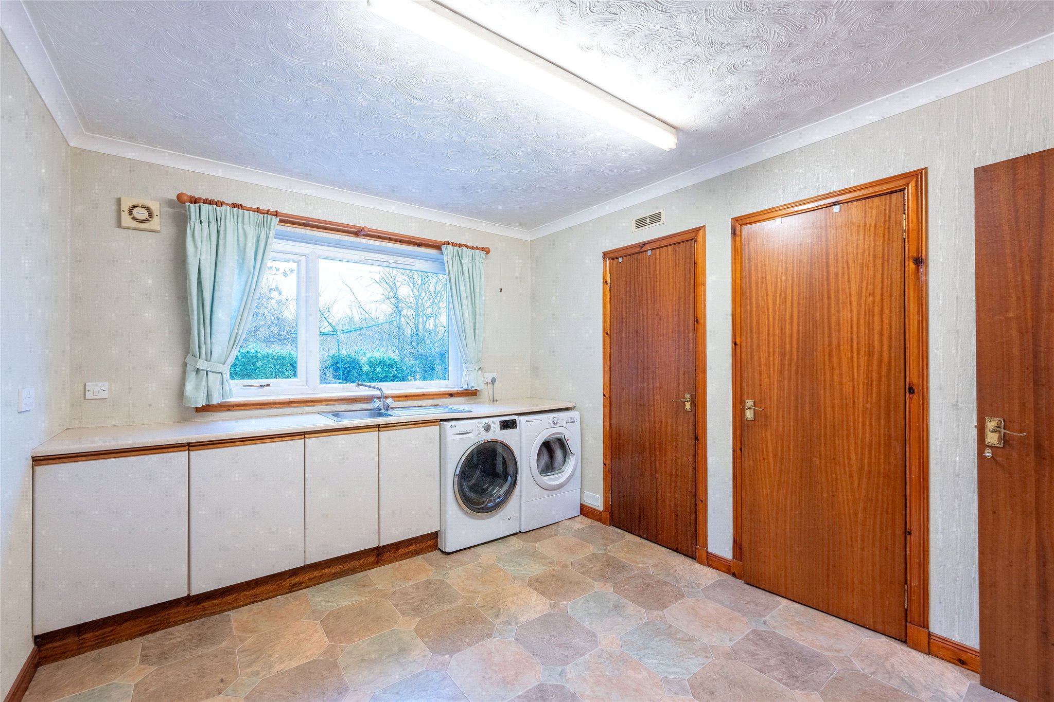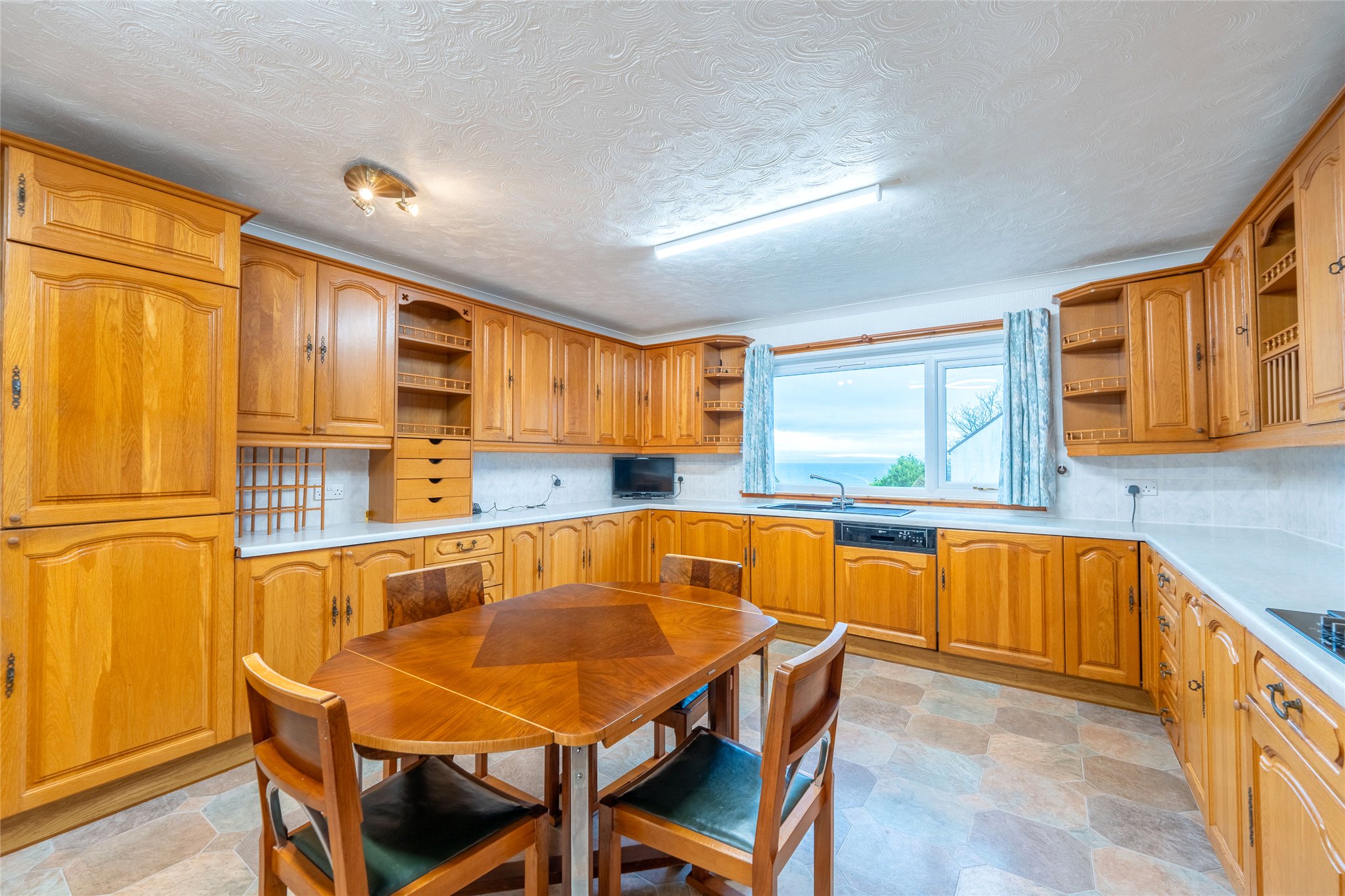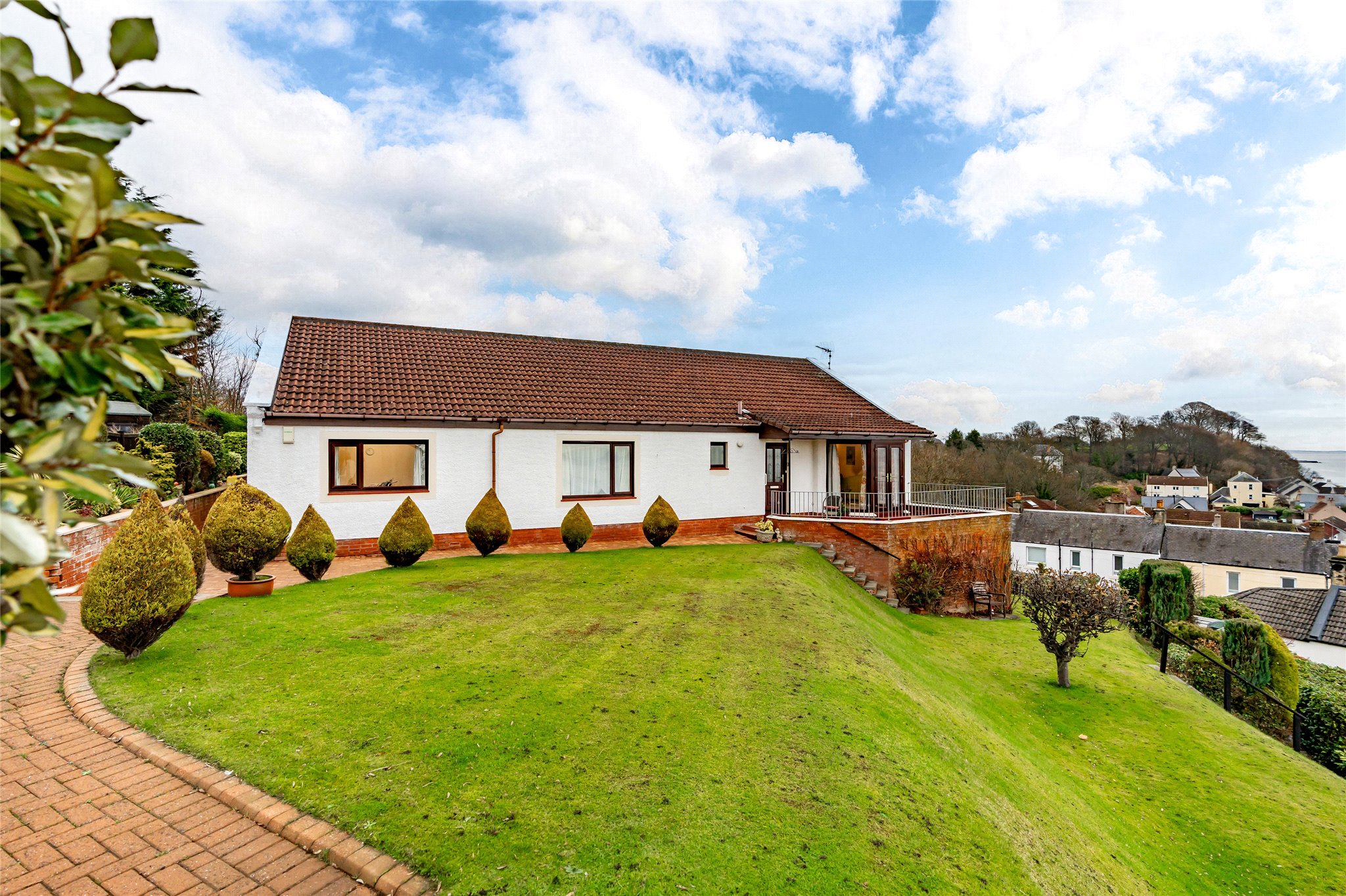 Whilst requiring some cosmetic upgrades, this three-bedroom detached property in the scenic Fife village of East Wemyss boasts a spectacular coastal outlook and a spacious and bright interior. A sweeping driveway, flanked by a manicured and elevated lawn, guides you to the front door of this inviting home and into a welcoming carpeted foyer and hallway. To your right, a south-east-facing bay-windowed living room awaits, offering stunning views across the Firth of Forth. Flooded with natural light, this delightful space features French doors that open onto a private terrace, creating a delightful connection to the outdoors. The tasteful décor includes soft carpeting and a neutral colour palette, adding to the room's serene ambiance. Moving through the residence, a generously proportioned dining kitchen awaits. South-east-facing and u-shaped in design, it combines oak-effect wall and floor cabinetry with white worktops and a tiled splashback. Integrated appliances include an oven, gas hob, and extractor hood. Adjoining the kitchen, a spacious utility room provides additional storage, keeping the kitchen organised and clutter-free, while a guest WC adds convenience. Returning to the hallway, the principal double bedroom offers a peaceful retreat. With soft carpeting, a soothing colour scheme, and captivating coastal views, this inviting space is further enhanced by an en-suite shower room featuring a WC and washbasin. Two additional bright and well-presented double bedrooms, both with built-in wardrobes share access to a family bathroom. While requiring modernisation, it is equipped with a bath, separate shower enclosure, bidet, WC, and washbasin. Completing the interior is a large attic that offers a variety of uses depending on needs.
