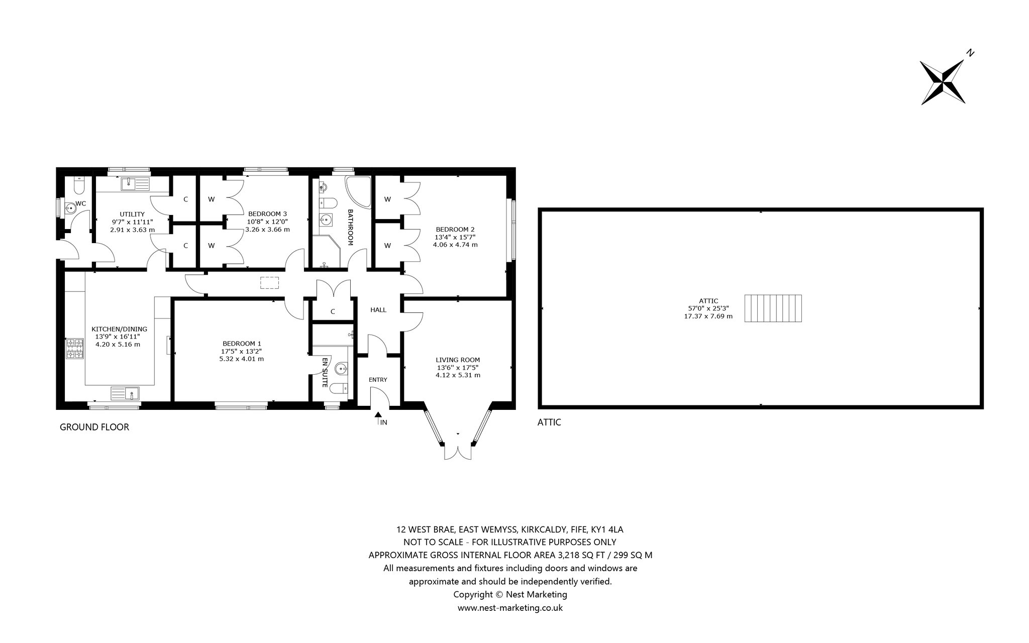 Entrance vestibule, hallway, dining kitchen, utility, living room, three bedrooms (one with en-suite), bathroom, WC