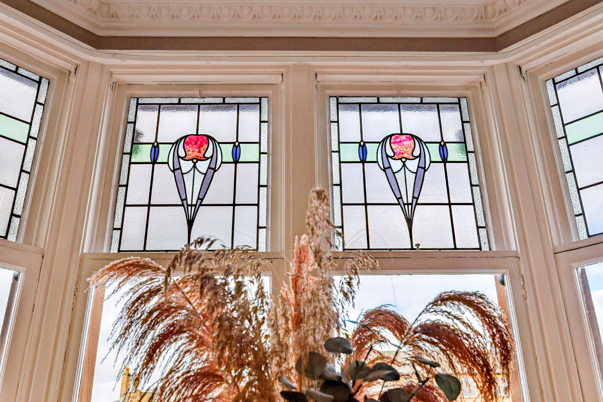 - Outstanding lounge with four section bay window, stained leaded glass to the upper sashes, two additional stained-glass windows to the side, ceiling cornice and a focal point fireplace