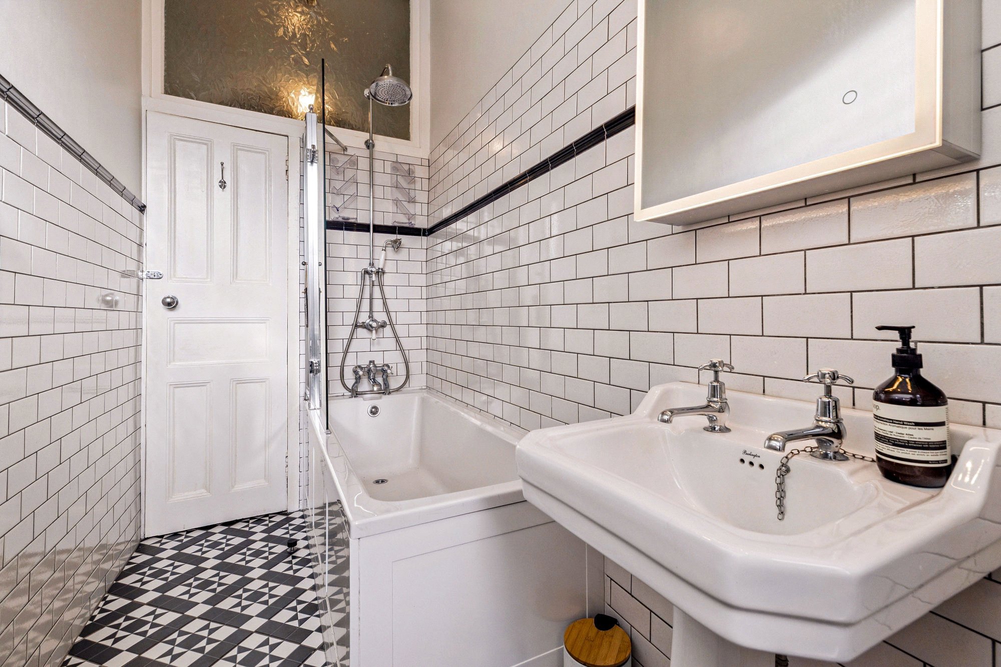 - Stylish three-piece bathroom comprising bath, over bath shower, toilet and wash hand basin. Window to the rear