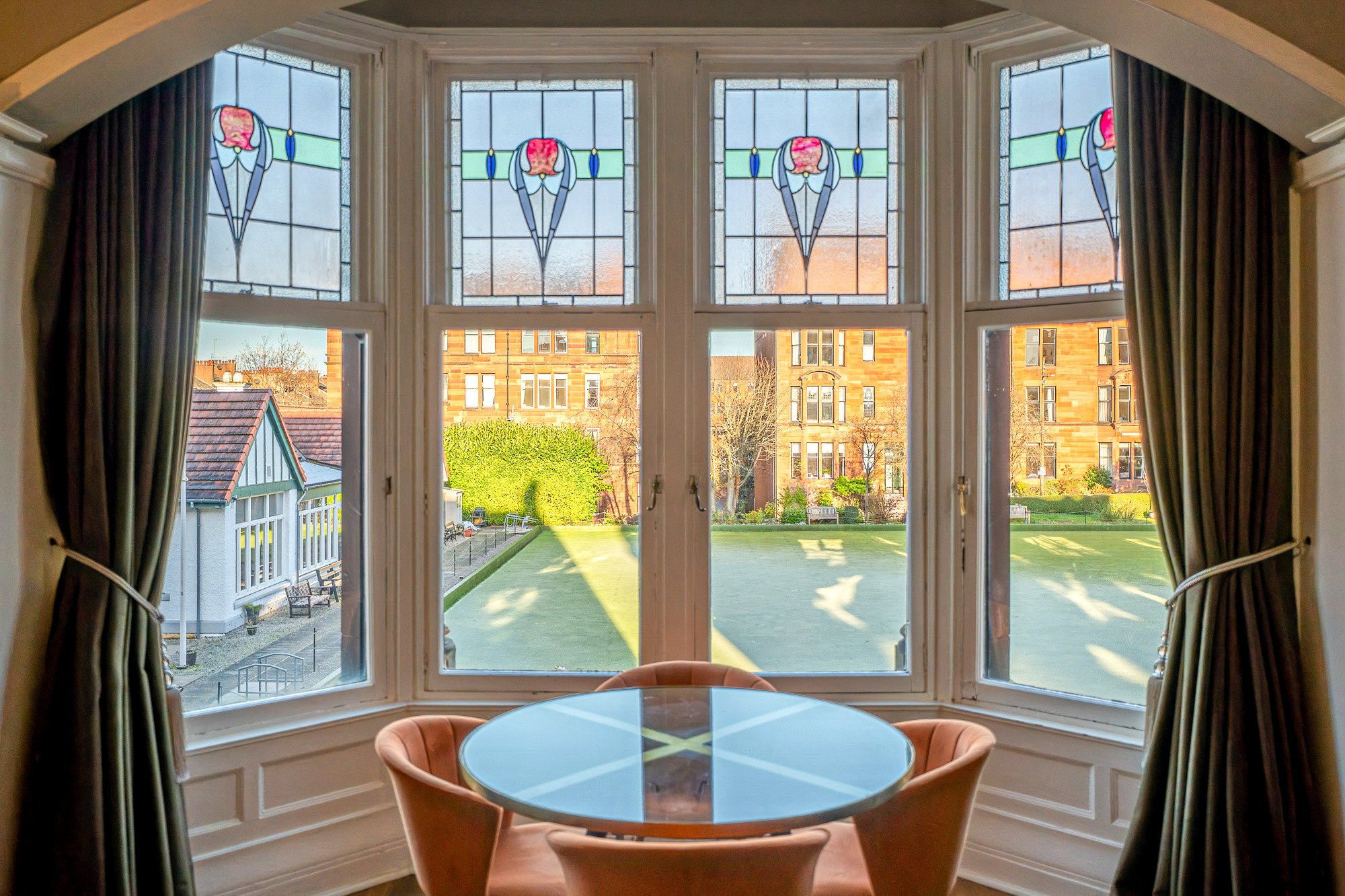 Immaculately presented and flooded with natural light, the interior boasts generous proportions and exquisite detailing throughout. Highlights include a magnificent bay-windowed lounge offering uninterrupted views across the bowling green, a beautifully re-fitted dining kitchen with an adaptable study/home office area, and a practical utility room. Accommodation comprises three versatile double bedrooms and a stylish three-piece bathroom, complemented by elegant natural wood finishes, ornate plasterwork, stained and leaded glass features, and original fireplaces in both the lounge and principal bedroom.