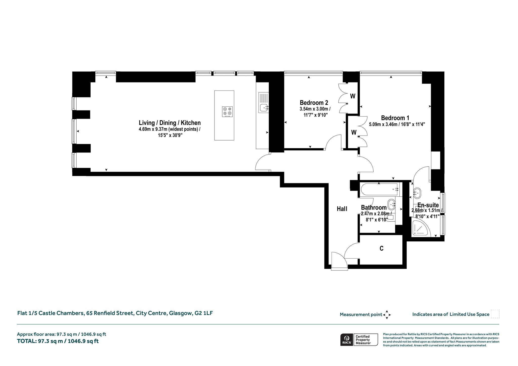 Situated on the first floor within the striking ‘Castle Chambers’ building and centrally located in the heart of Glasgow’s City Centre, this generously proportioned two-bedroom apartment extends to over 1046 sq ft and is ideally placed for enjoying the area's superb selection of amenities, from everyday shopping to leisure outlets, bars, restaurants, and excellent transport links by bus, rail, and road.