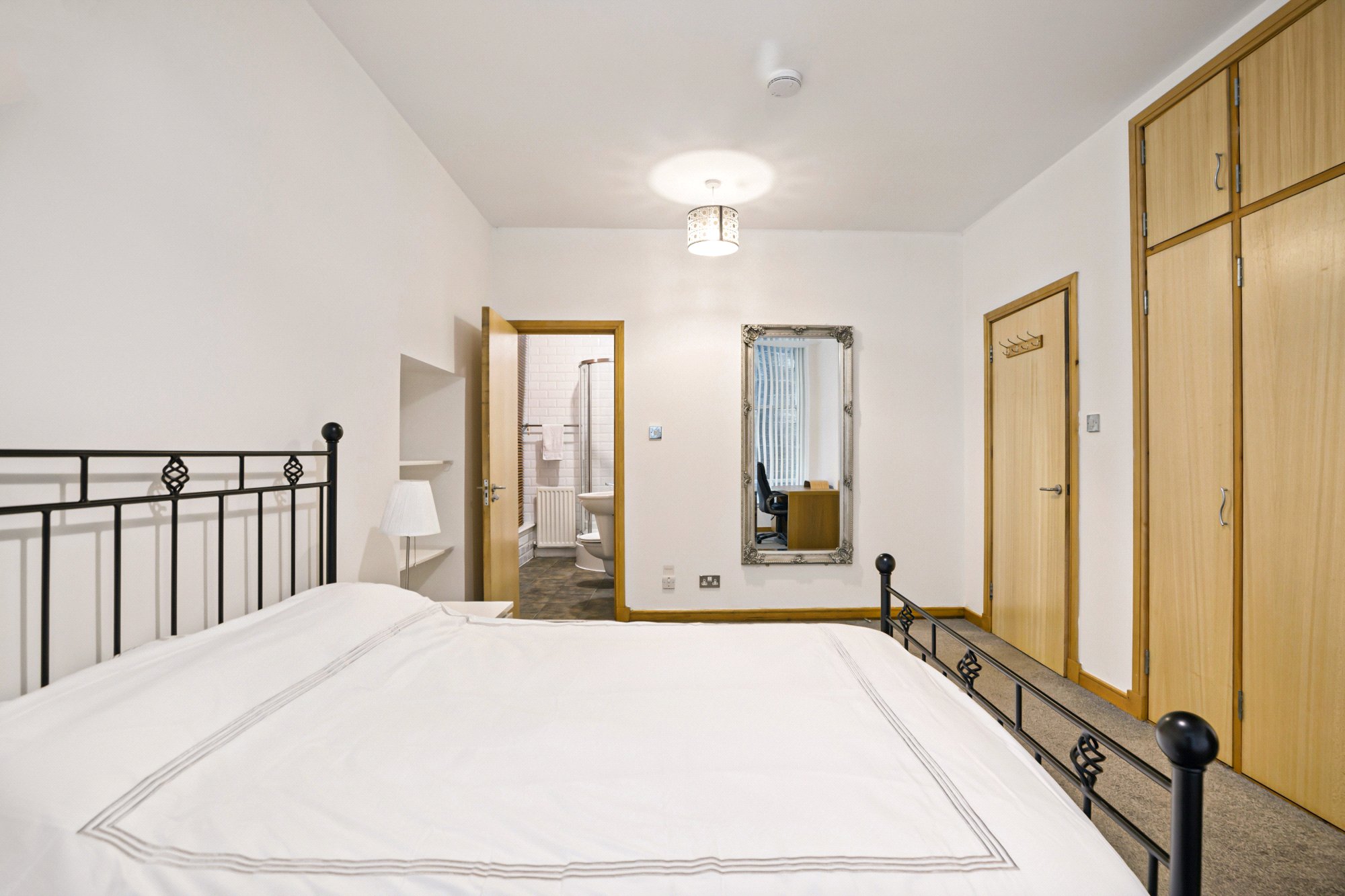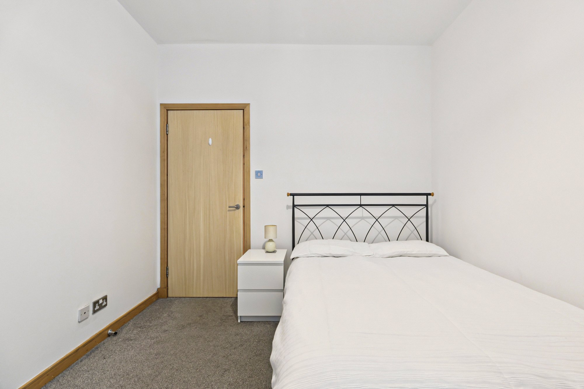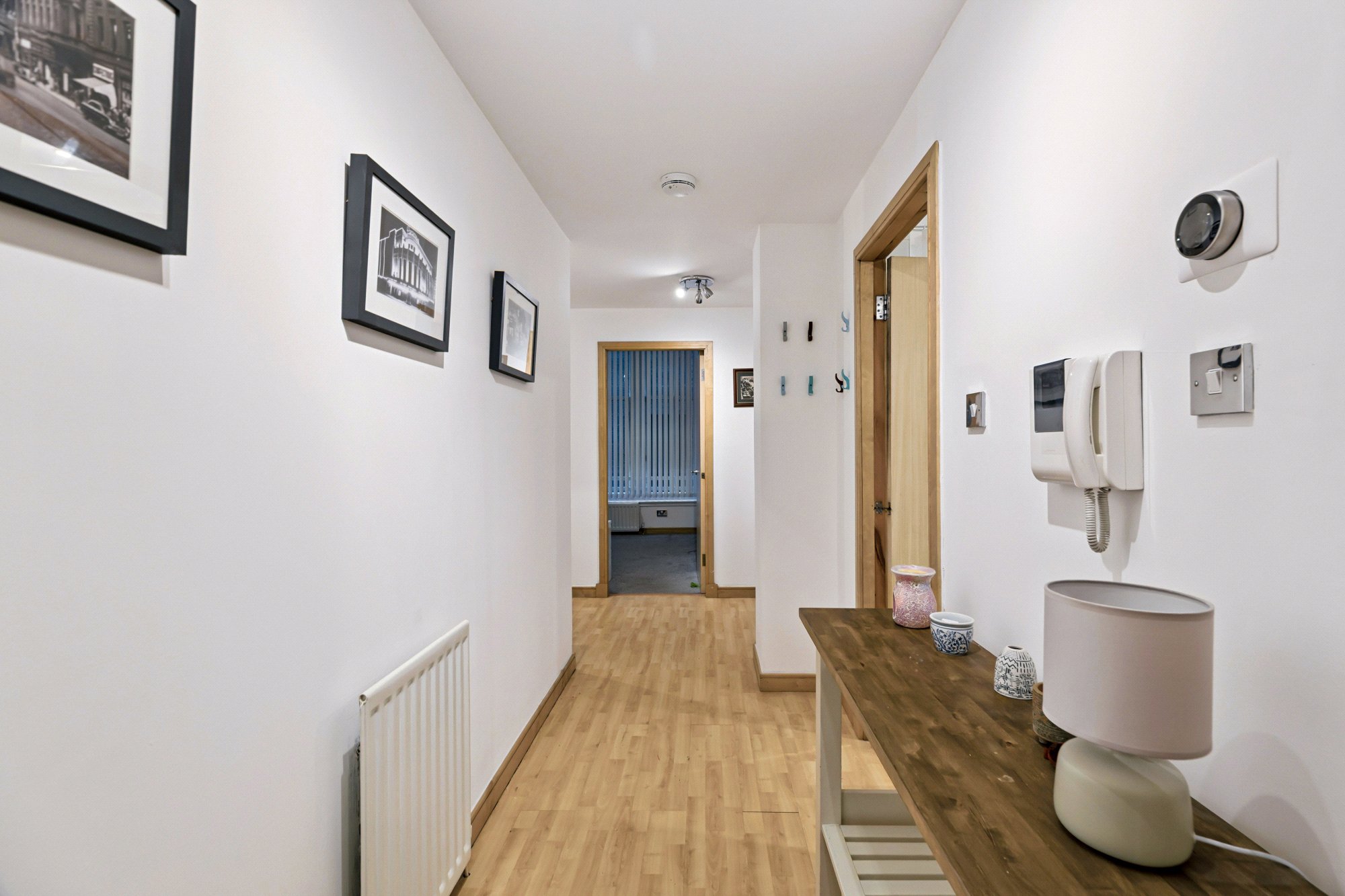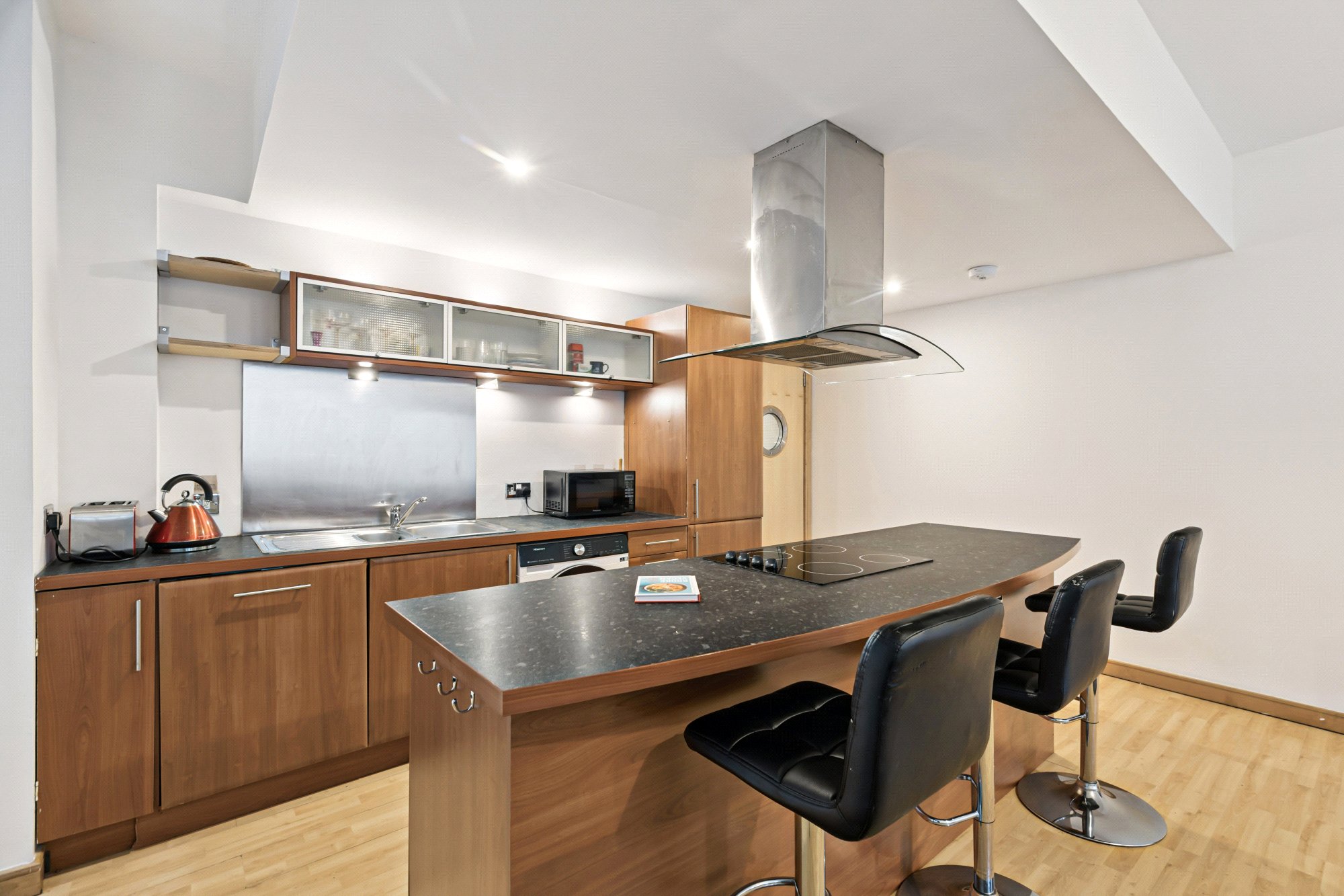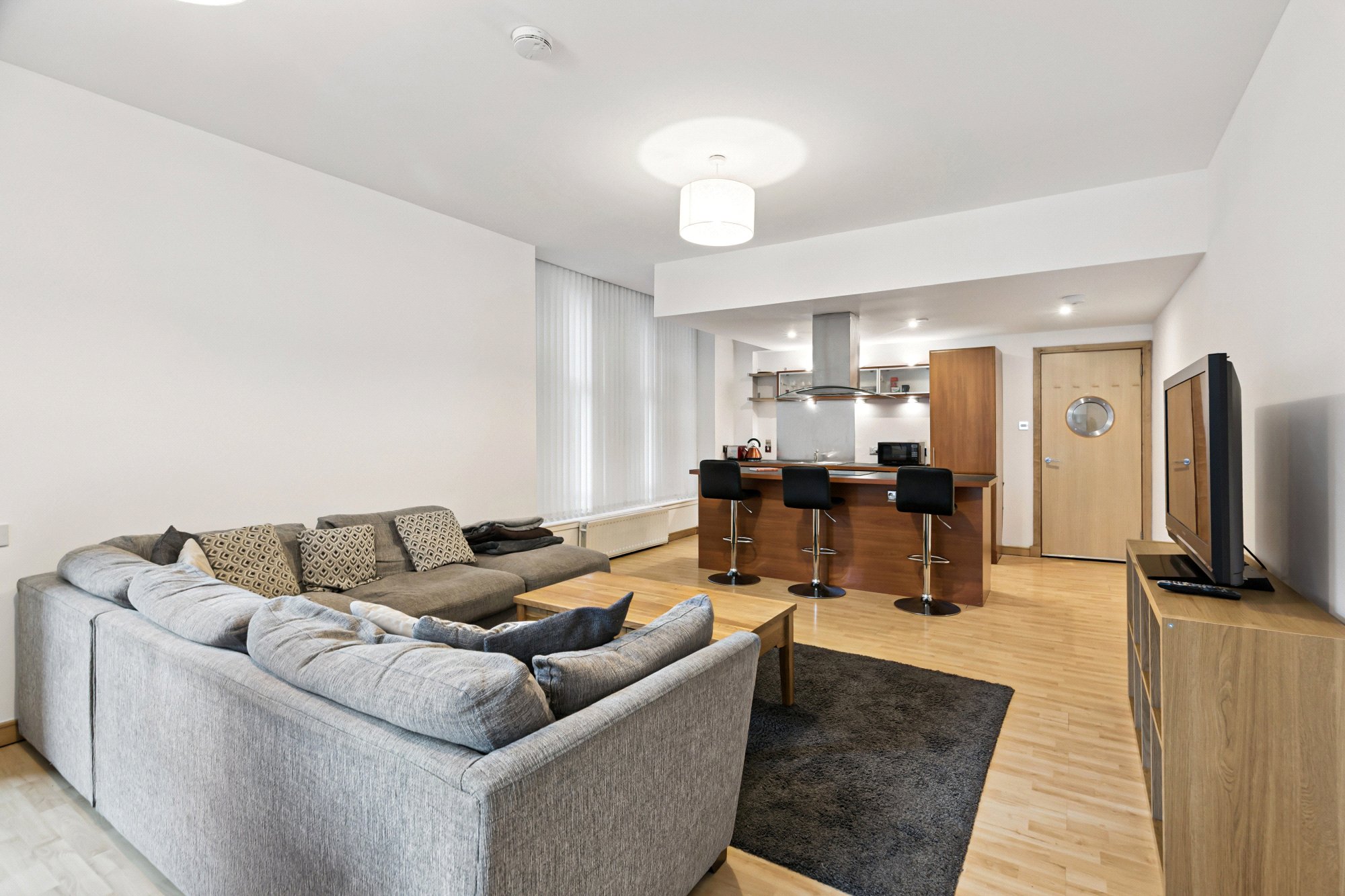 Entered via a secure communal entrance hallway and with lift and stair access, the building is factored and benefits an on-site 9-to-5 concierge acting as the first point of contact and overseeing the smooth daily running of the 34-flat building, managing everything from safety systems and maintenance coordination to refuse, utilities, and resident support. Combining the roles of caretaker, facilities manager, and compliance monitor, he ensures a safe, clean, and well-functioning environment for all residents. The interior of this bright and spacious apartment is well presented and features high ceilings, laminate wood effect flooring through the hall and main living space, and a contemporary layout that maximises space and light. A notable feature of the property is the superb open-plan living, dining and kitchen area, spanning over 30’ 9” this vast space has dual aspects east and south and kitchen complete with centre island. There are two well-proportioned double bedrooms, both with fitted wardrobes and with the principal bedroom benefiting from an en suite shower room. The main bathroom is positioned off the hall with white three-piece suite and over bath shower, alongside a deep storage cupboard. Additional benefits include electric wet central heating system and secondary glazing to all windows for heat and sound insulation.