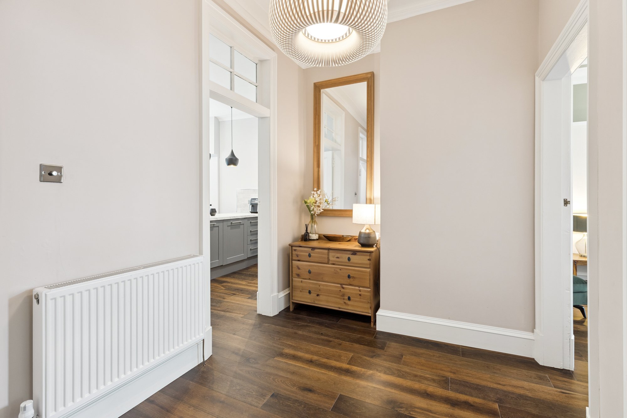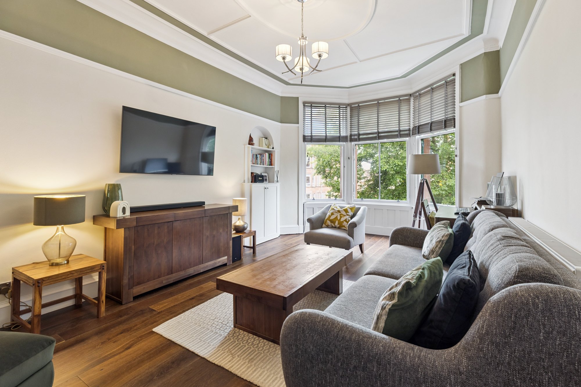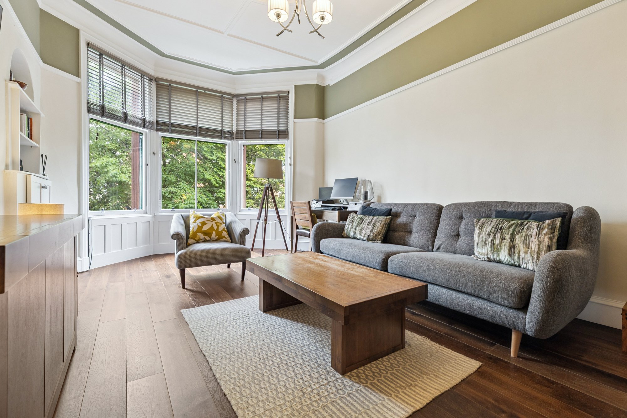 The property is accessed via a secure and well-maintained communal stairwell and opens into a spacious central hallway with excellent flow between rooms. To the front, the generously sized lounge is bright and welcoming, with a beautiful bay window that floods the space with natural light.