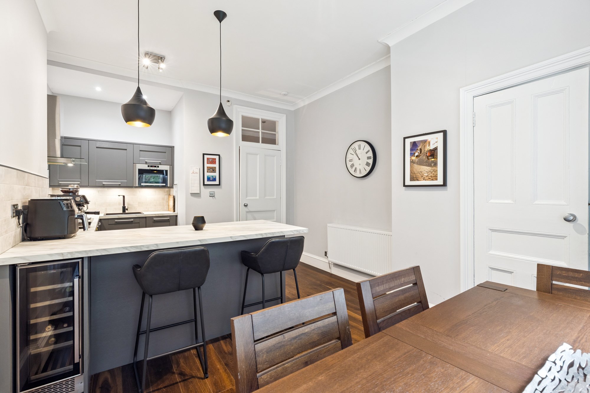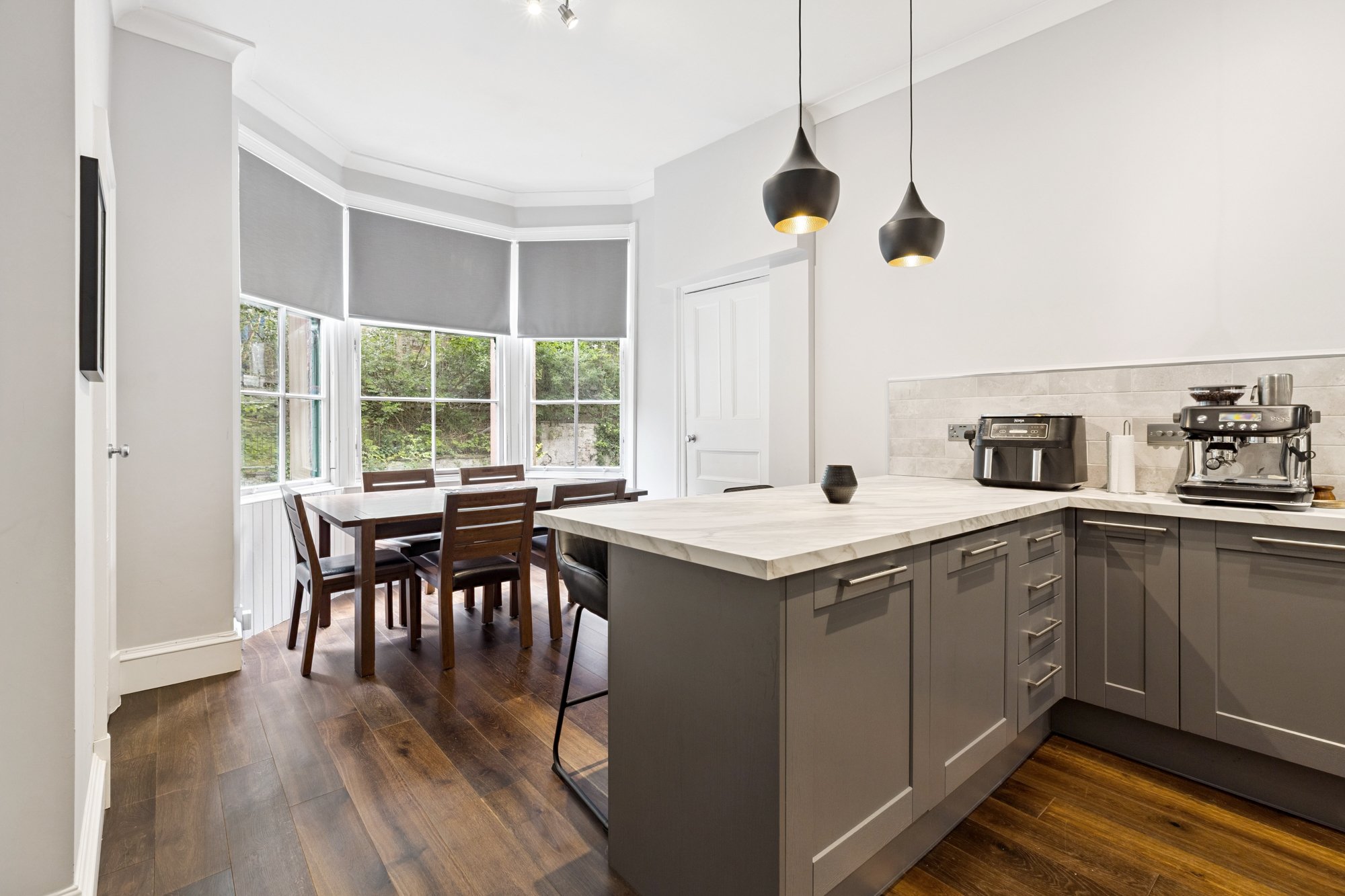 To the rear, the bright and expansive dining kitchen is a standout feature, offering modern cabinetry, integrated appliances, and an excellent dining area beneath another bay window. This versatile space is ideal for hosting or enjoying quiet meals at home. Additionally, there is a dedicated utility space provides convenient housing for laundry appliances and additional storage.
