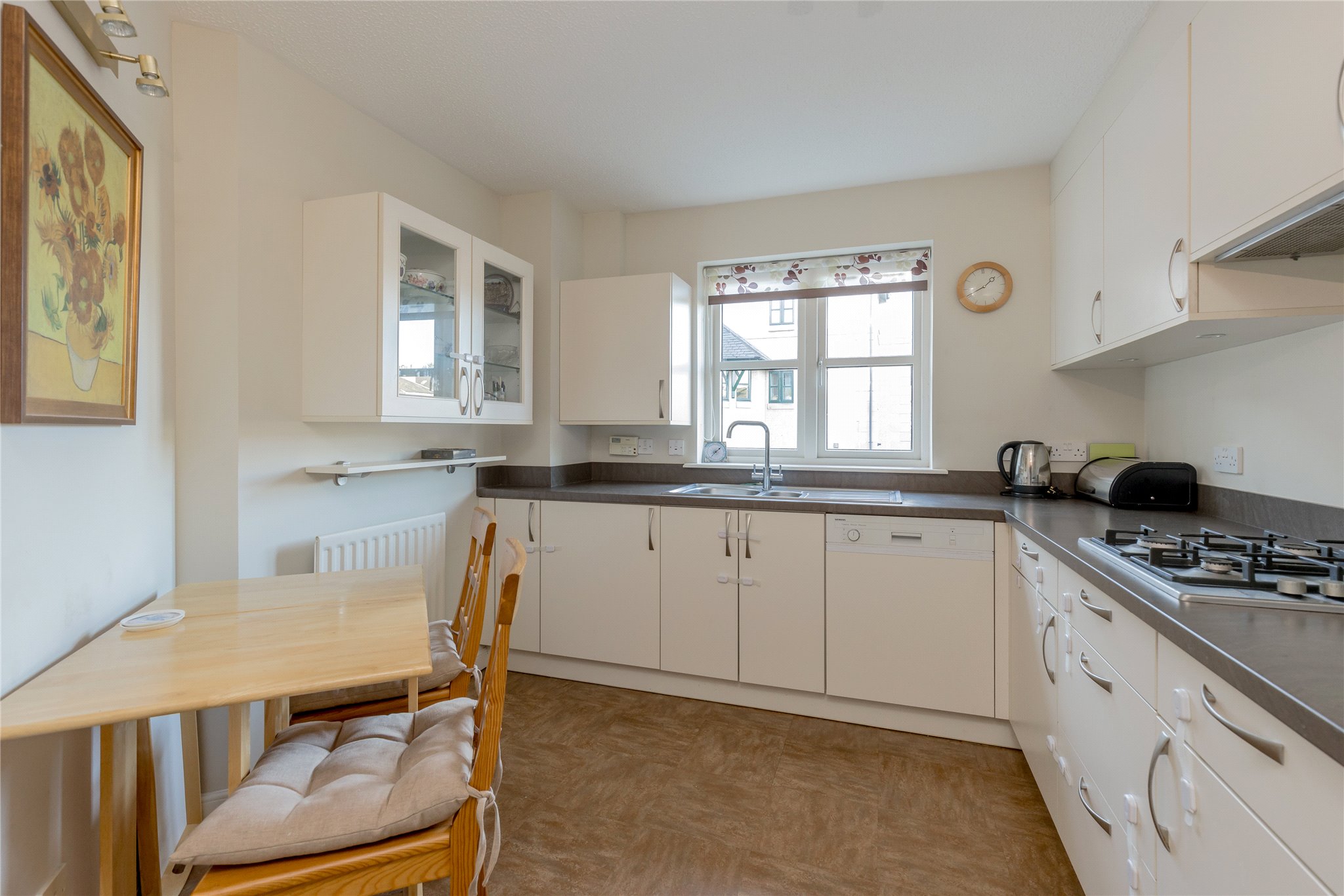 The interior is flooded with natural light throughout. The elegant sitting room and adjacent dining room (which could serve as a fourth bedroom or home office) both enjoy spectacular westerly views toward Hillend and the Pentlands, creating a seamless living environment. The contemporary kitchen is complemented by a bright breakfast area ideal for everyday living. A stylishly tiled bathroom with a separate bath and shower, and a generous double bedroom with fitted wardrobes complete the lower level.