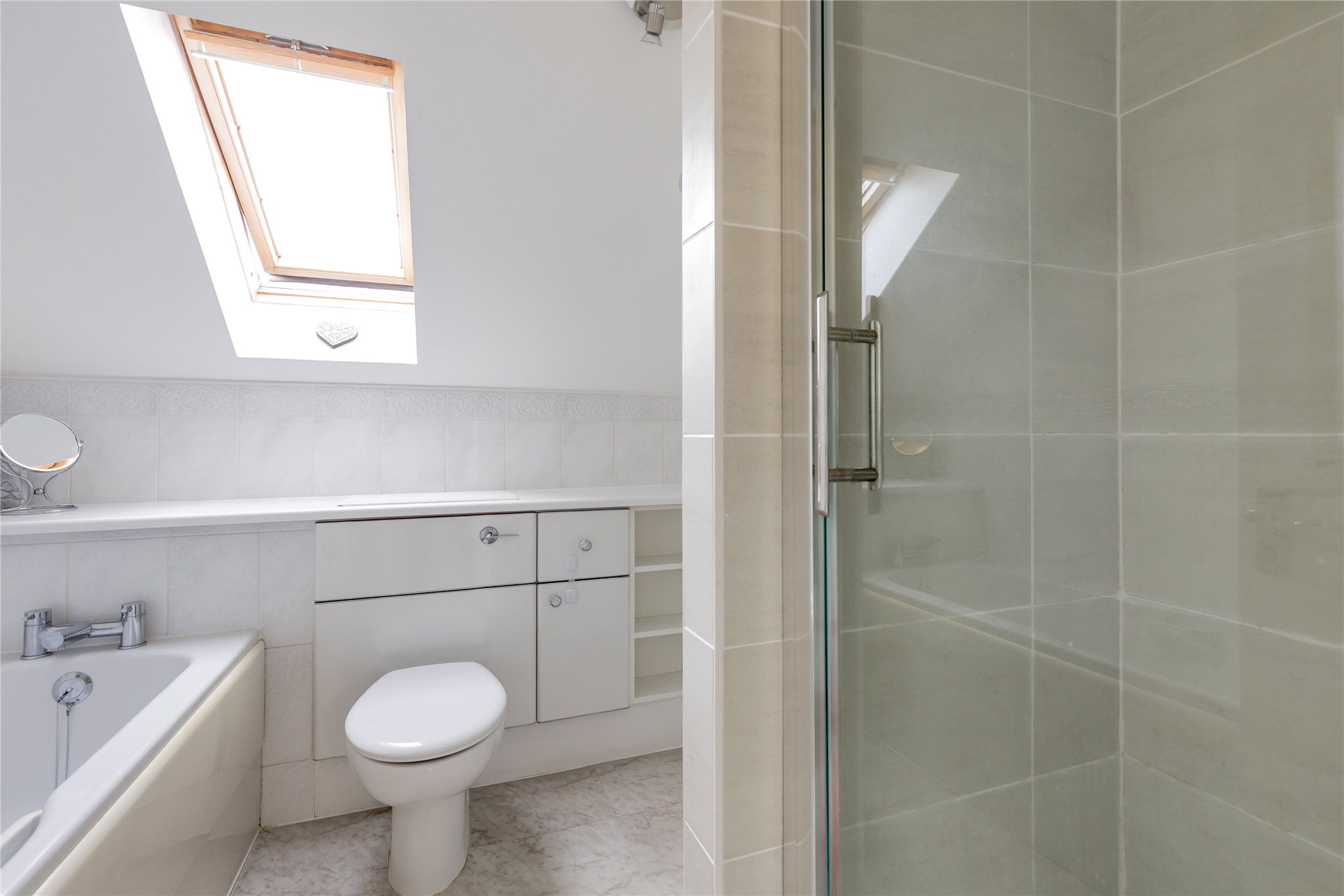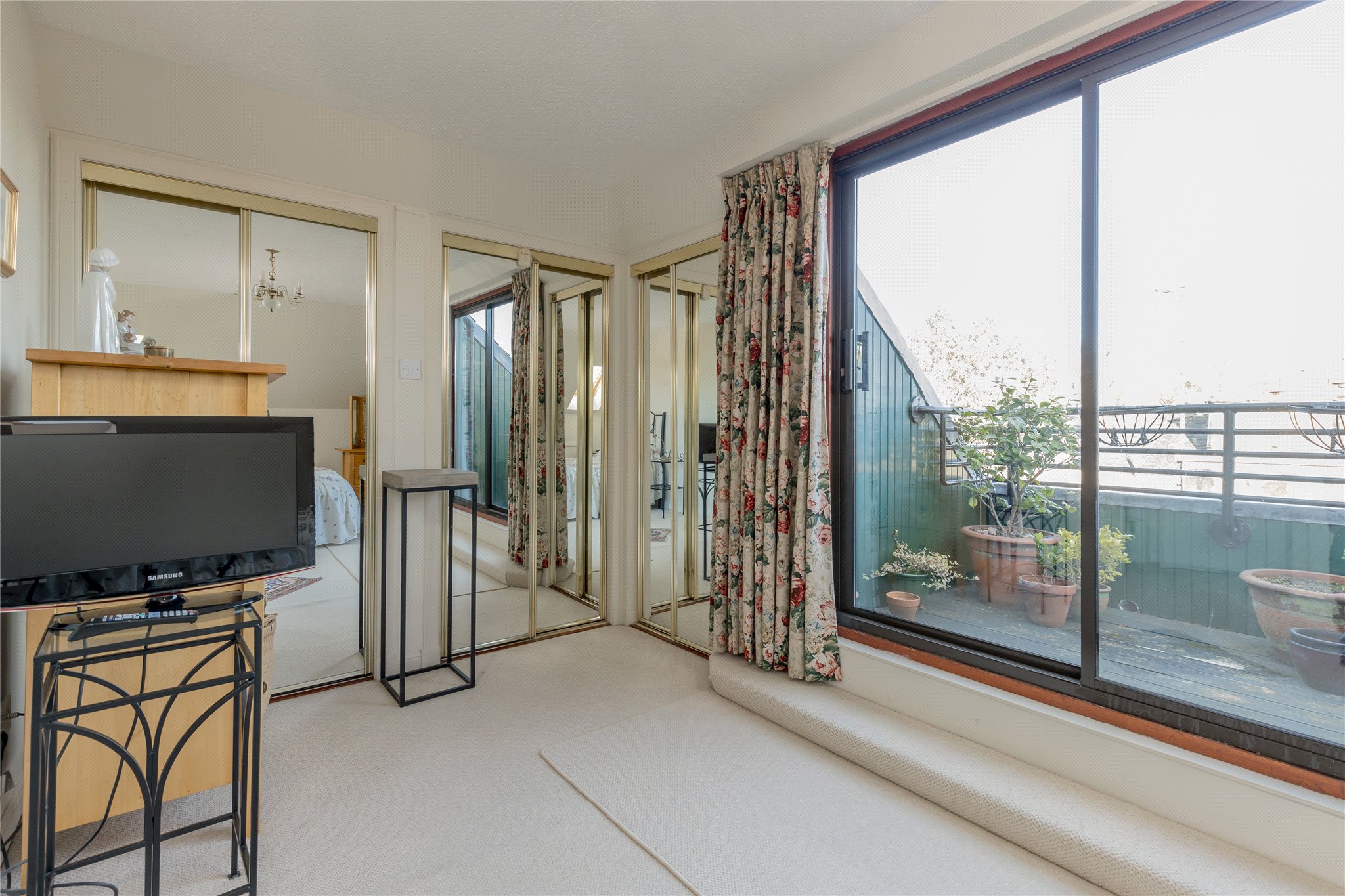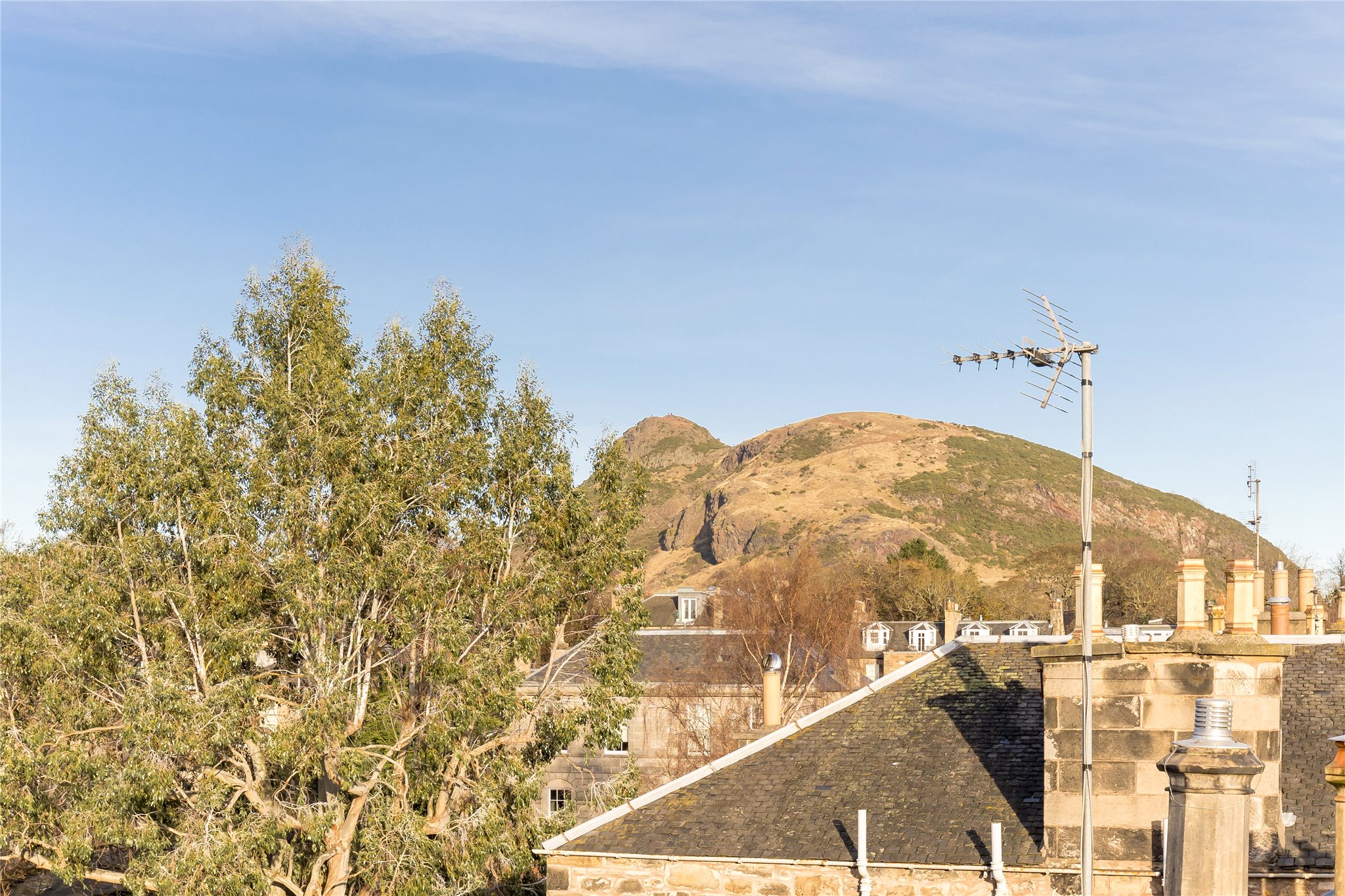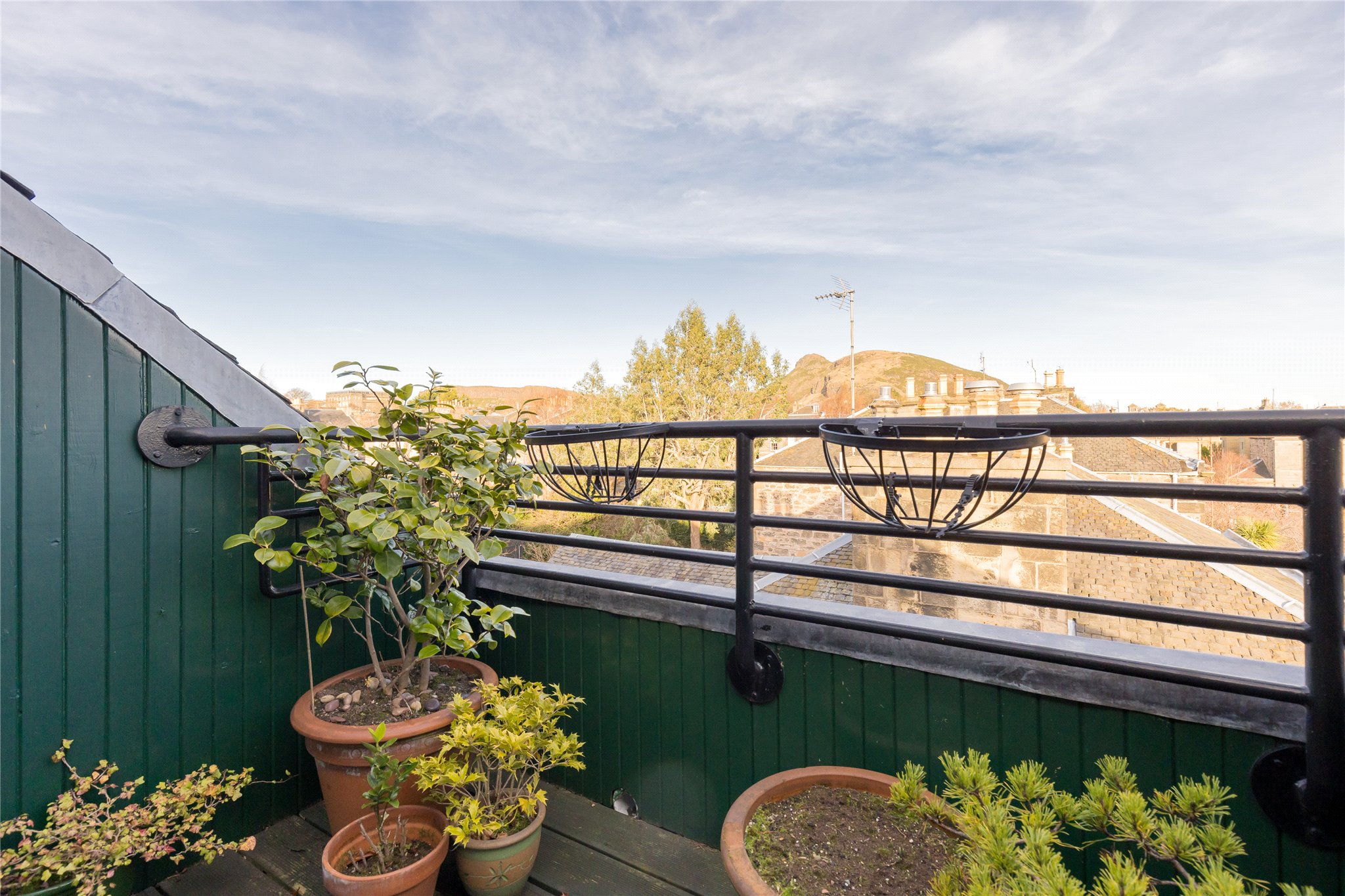 Upstairs, the principal bedroom suite is a standout feature – a luxurious and serene space with extensive built-in storage, a spacious ensuite bathroom with both bath and separate shower, and its own private south-facing balcony. This tranquil outdoor retreat is a true rarity in city living, offering views to the iconic Arthur’s Seat and plenty of space for seating, planters, and morning coffee. A further double bedroom and excellent built-in storage, including floored attic space, offers ample storage and spacious living.