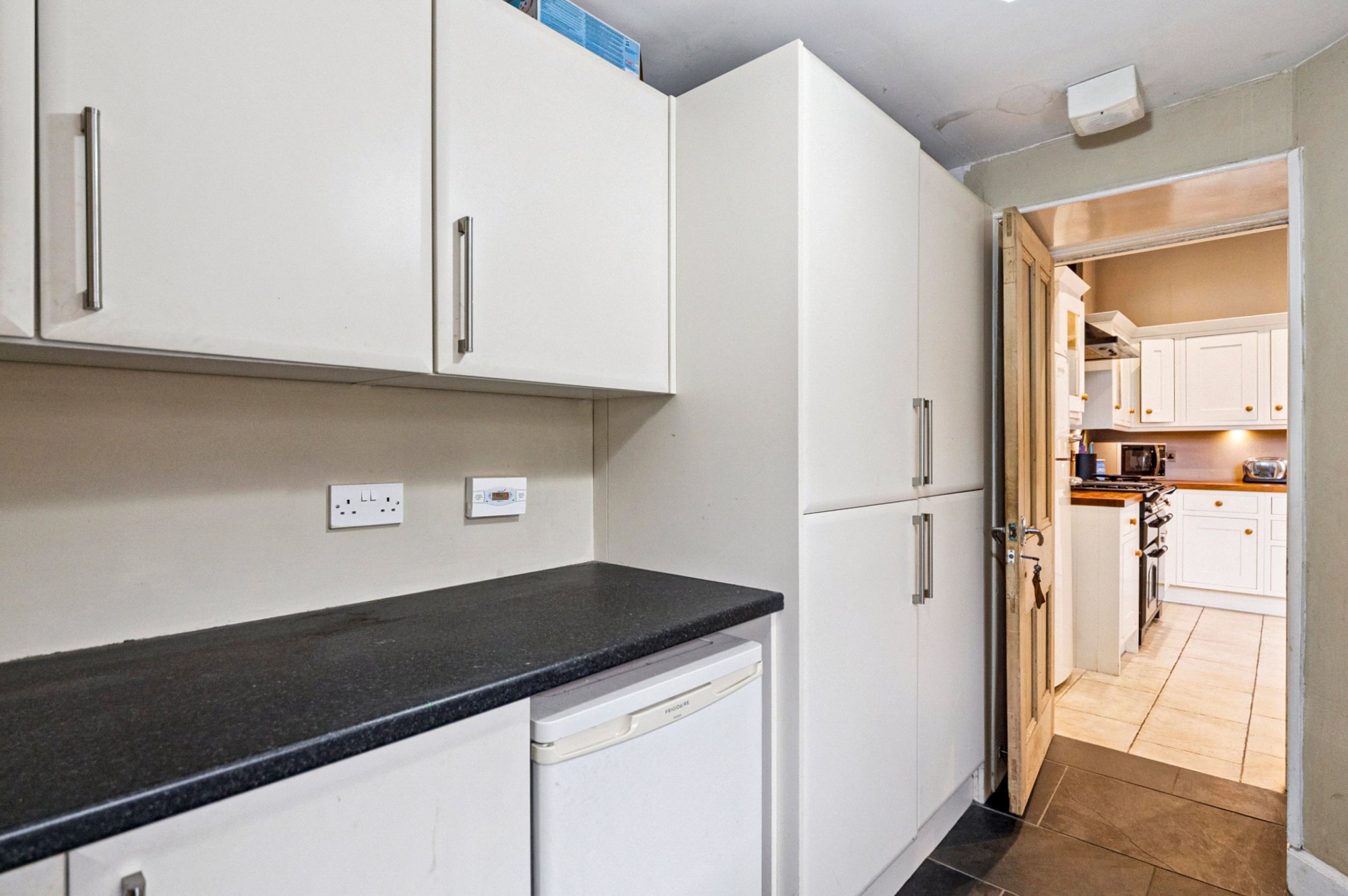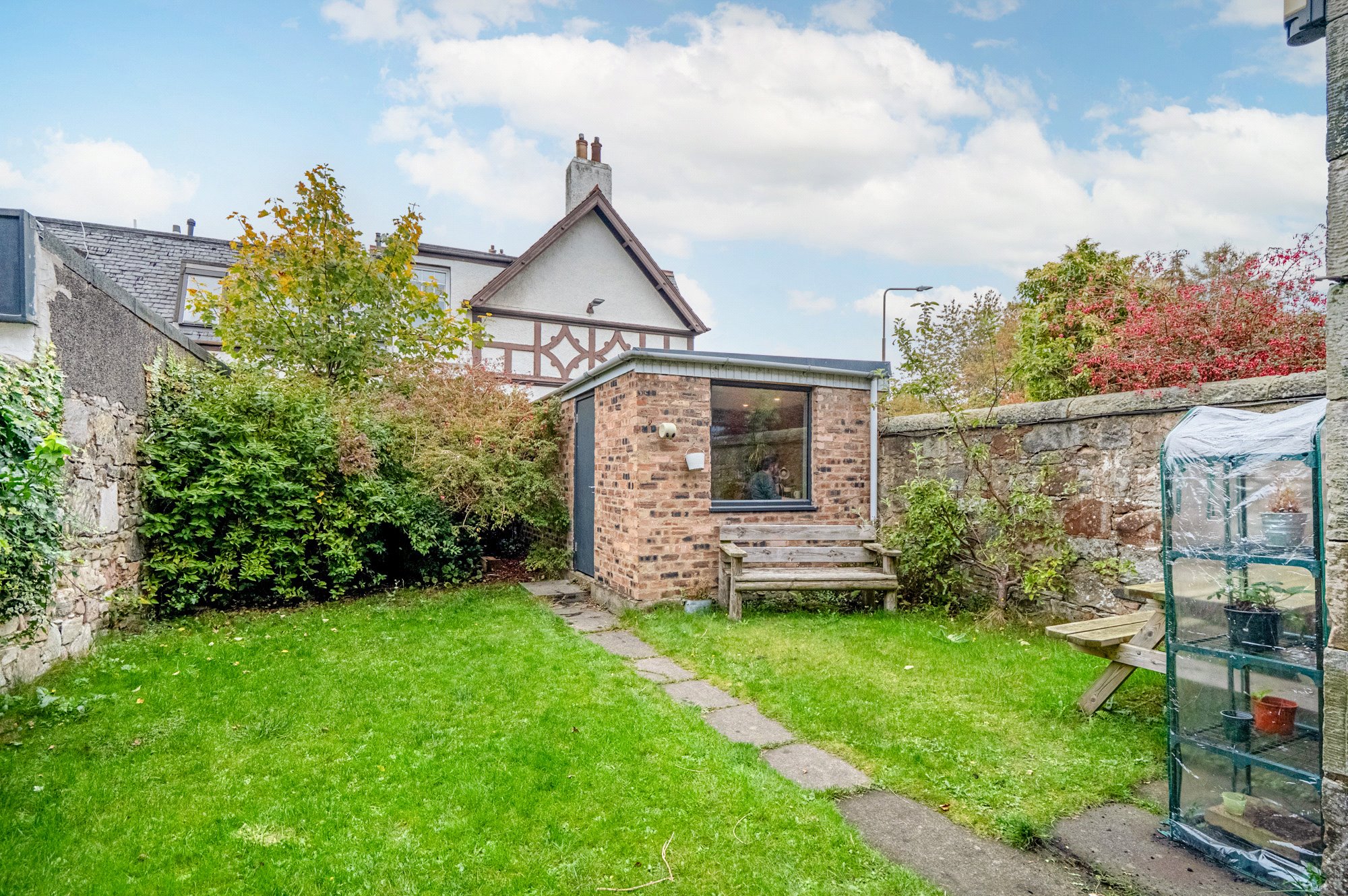 The rear garden is relatively compact, but enjoys afternoon and evening sun during the summer months. It is largely laid to lawn with mature borders providing colour and privacy. A garage, accessed via a lane to the rear, offers excellent storage, and adjoining it is a converted area currently used as a home office, featuring a window allowing the space to be flooded with natural light.
