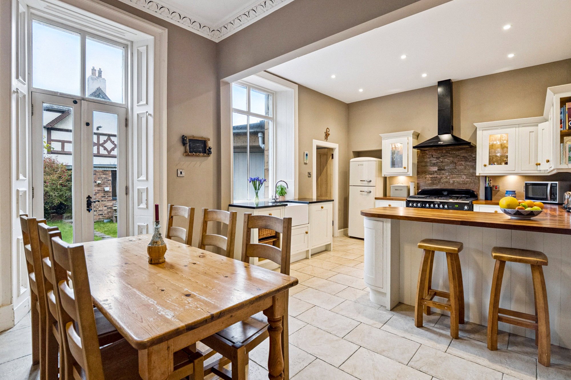 To the front of the house lies a superb south-facing living room, featuring an elegant bay window, attractive cornicing, and a central fireplace which forms the focal point of the room.