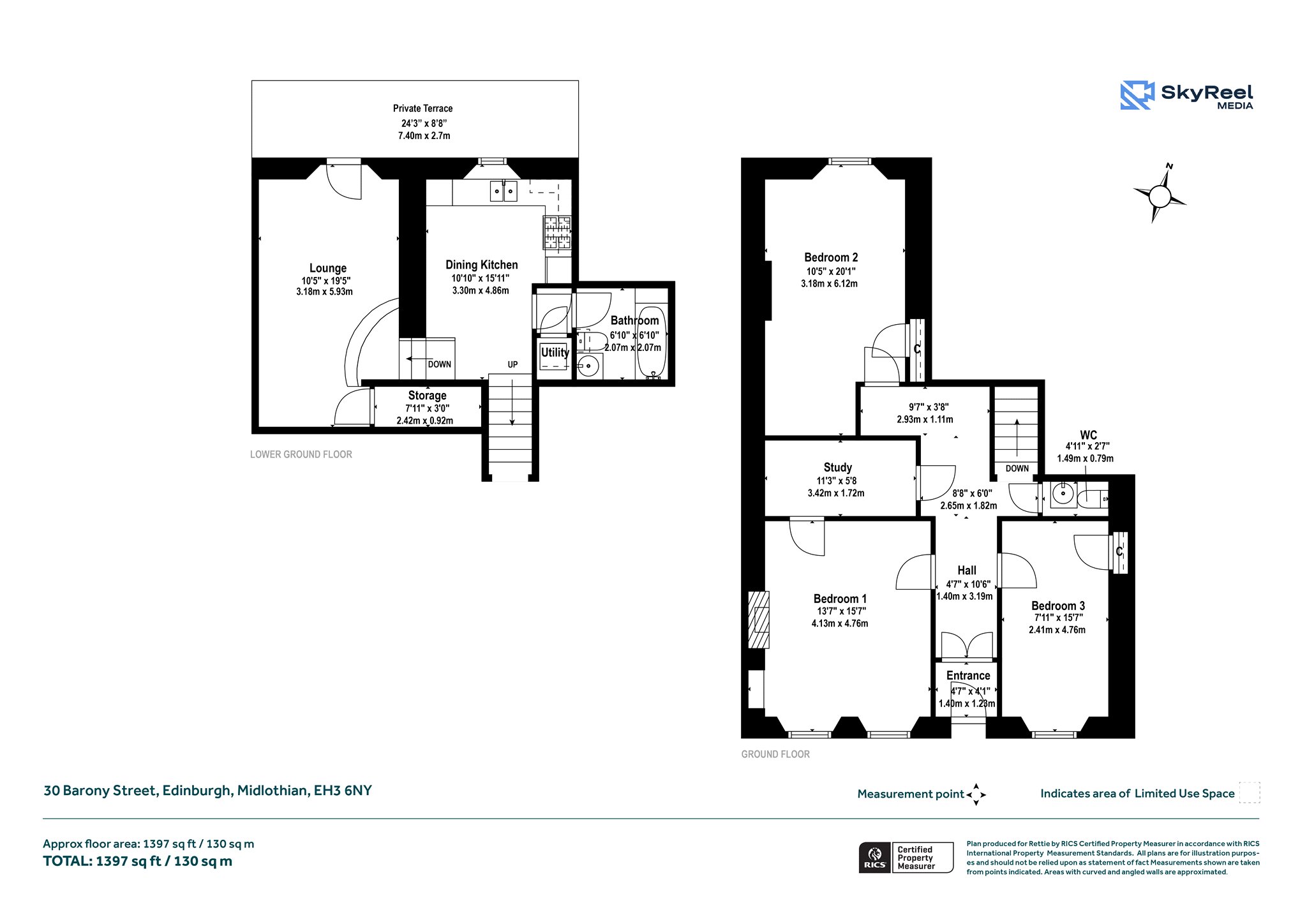 The lower ground floor offers a fully fitted dining kitchen, sitting room with access to a private terrace, family bathroom, utility and storage cupboards