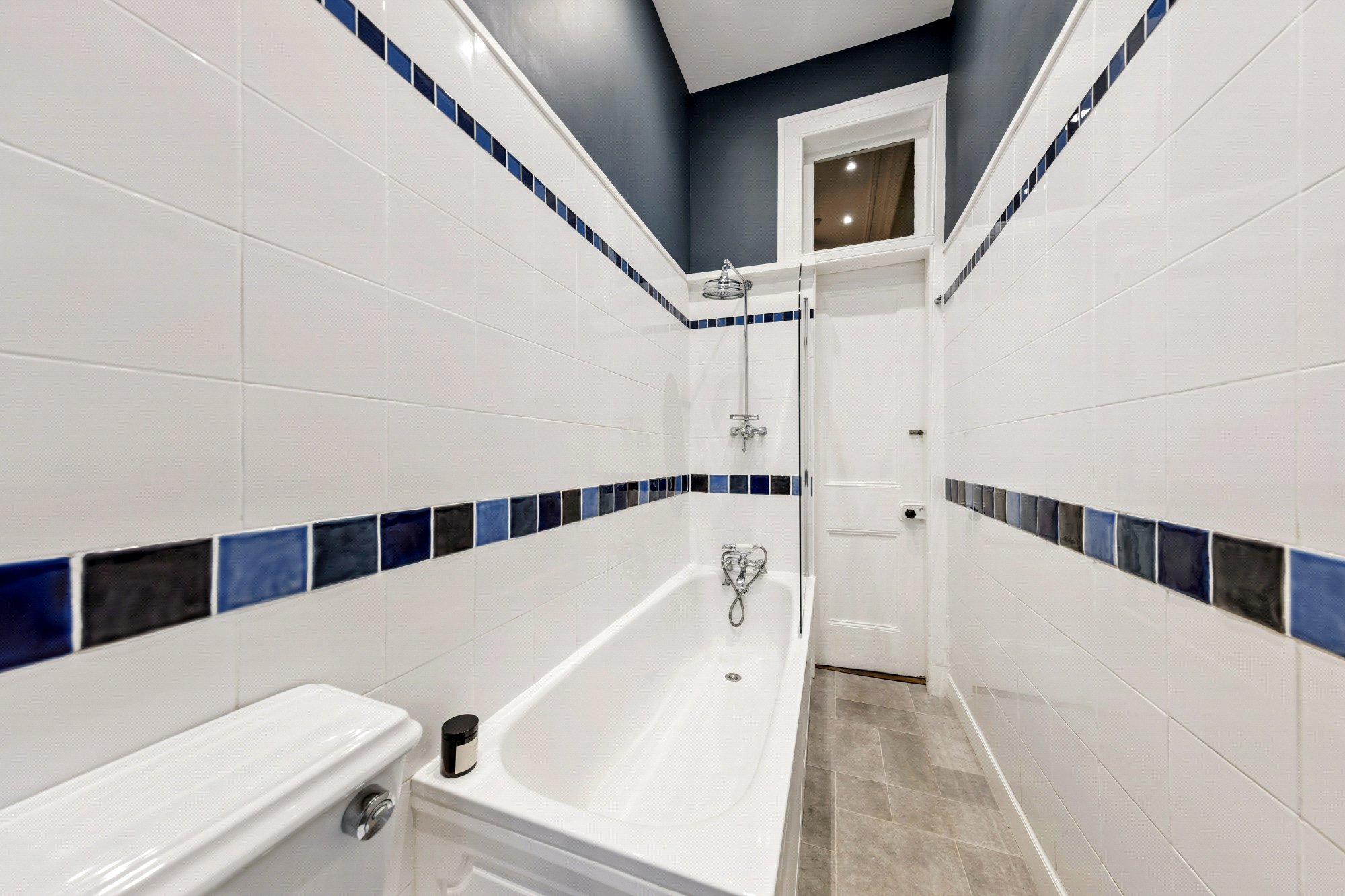 - Bathroom with shower over bath and window to the side.