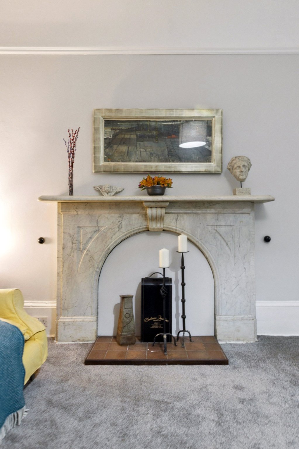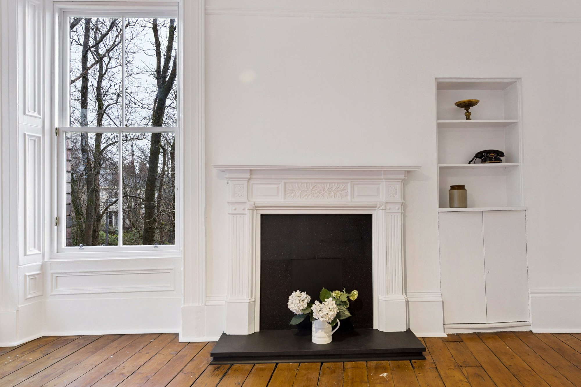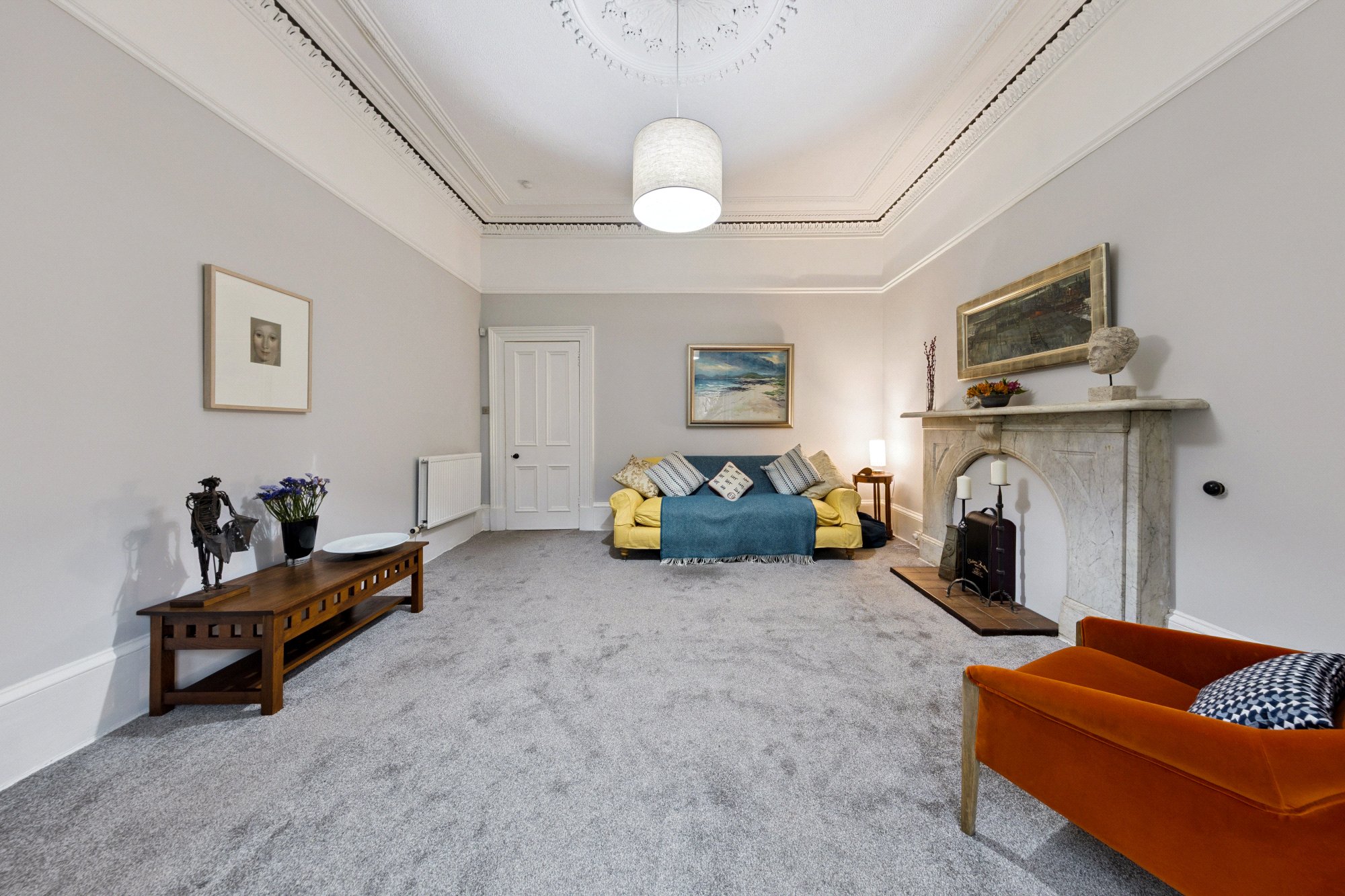 - Vast principal (main) bedroom with two section sash and case window to the front, immaculately preserved original cornice and centre rose, anchored by a broad focal point Carrara marble fireplace.