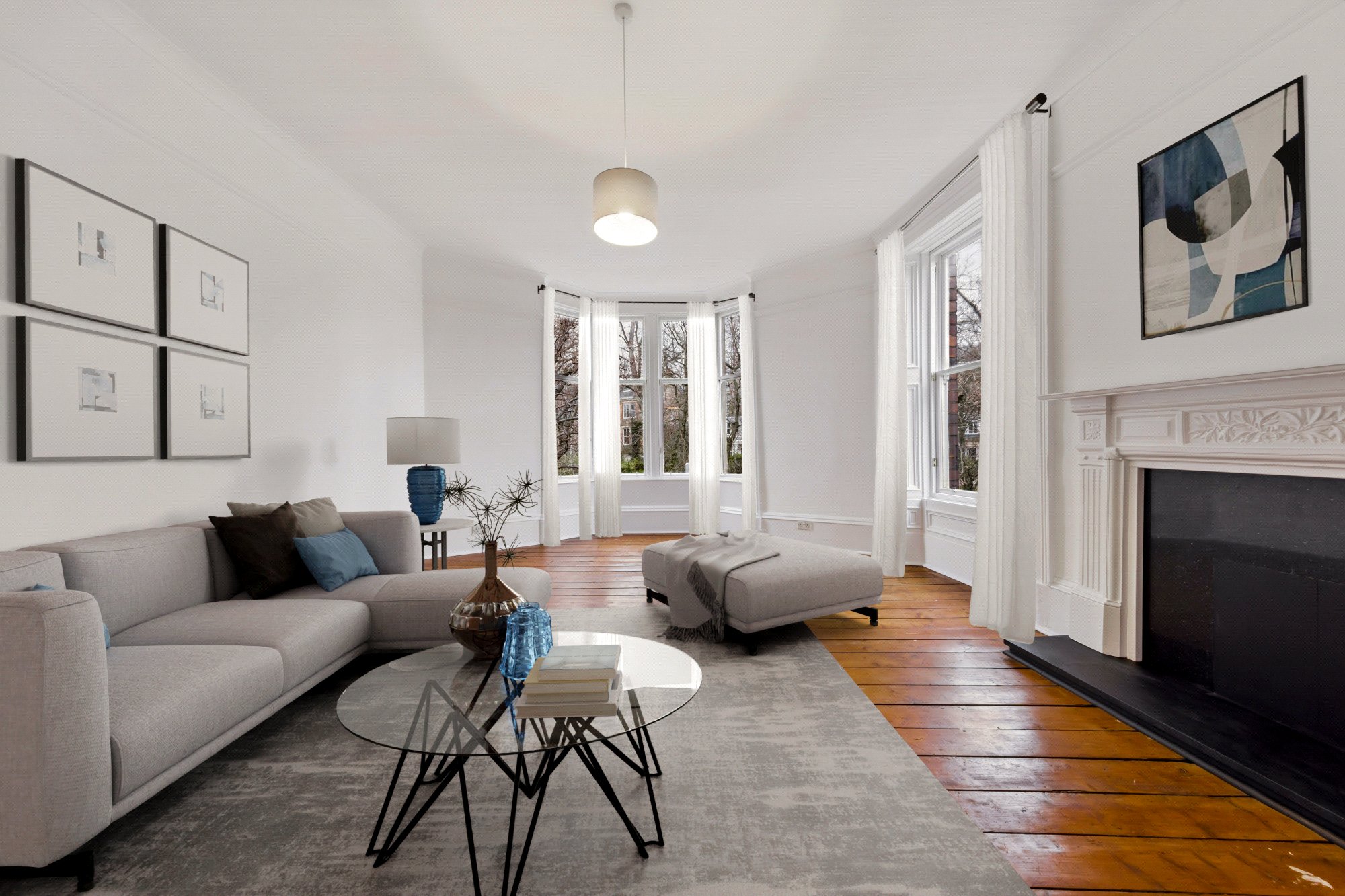 Having crossed the threshold, the home makes an instantaneous impression in terms of space and brightness. The interiors are generous and finished to an exacting standard in a modern, understated style that compliments the grand period proportions and evokes a calming sense of serenity. The magnificent front lounge is undoubtedly the heart of the home, with its triple-section bay window and auxiliary side sash and case window, enhancing the space while preserving period charm. These windows bathe the room in constant natural light and frame sweeping, elevated views across the graceful curve of Hayburn Crescent and towards the open expanse of Dyce Park.