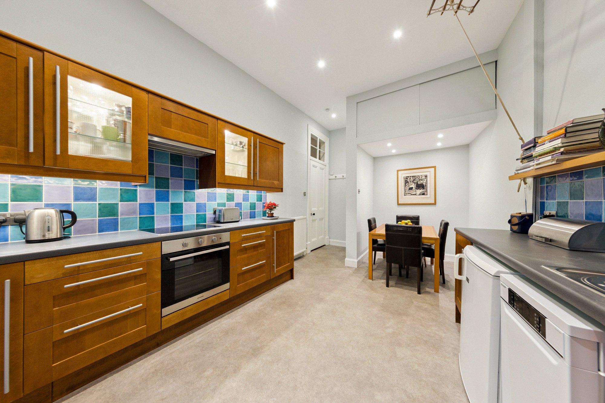 - Lovely dining kitchen with fitted cabinetry, window to the rear and a dining recess with storage area above.