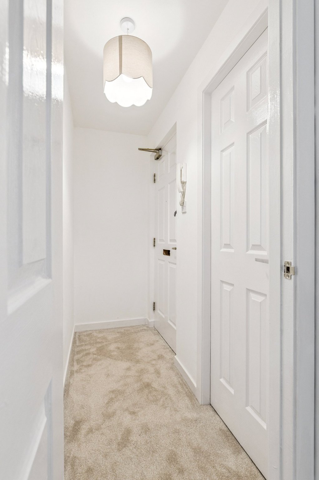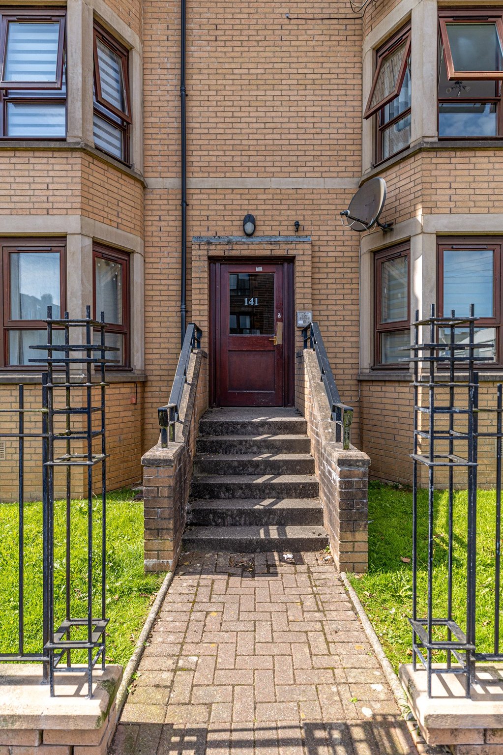 Accessed via security entry to common close, stairs lead to the first floor and front door entry with entrance vestibule. Welcoming reception hall with a large cupboard and access to the main apartments. Generous living room with a box bay window bay facing east over Meadowpark Street and spans over 17ft into bay and with access to breakfasting kitchen spanning over 12ft and offering a range of base and wall mounted modern units and ample space for dining. There are two double bedrooms, a utility cupboard and a main bathroom with three-piece white suite, over bath shower. The property has fresh décor, newly fitted carpeted flooring, double glazed windows, gas central heating and allocated parking in the rear car park.