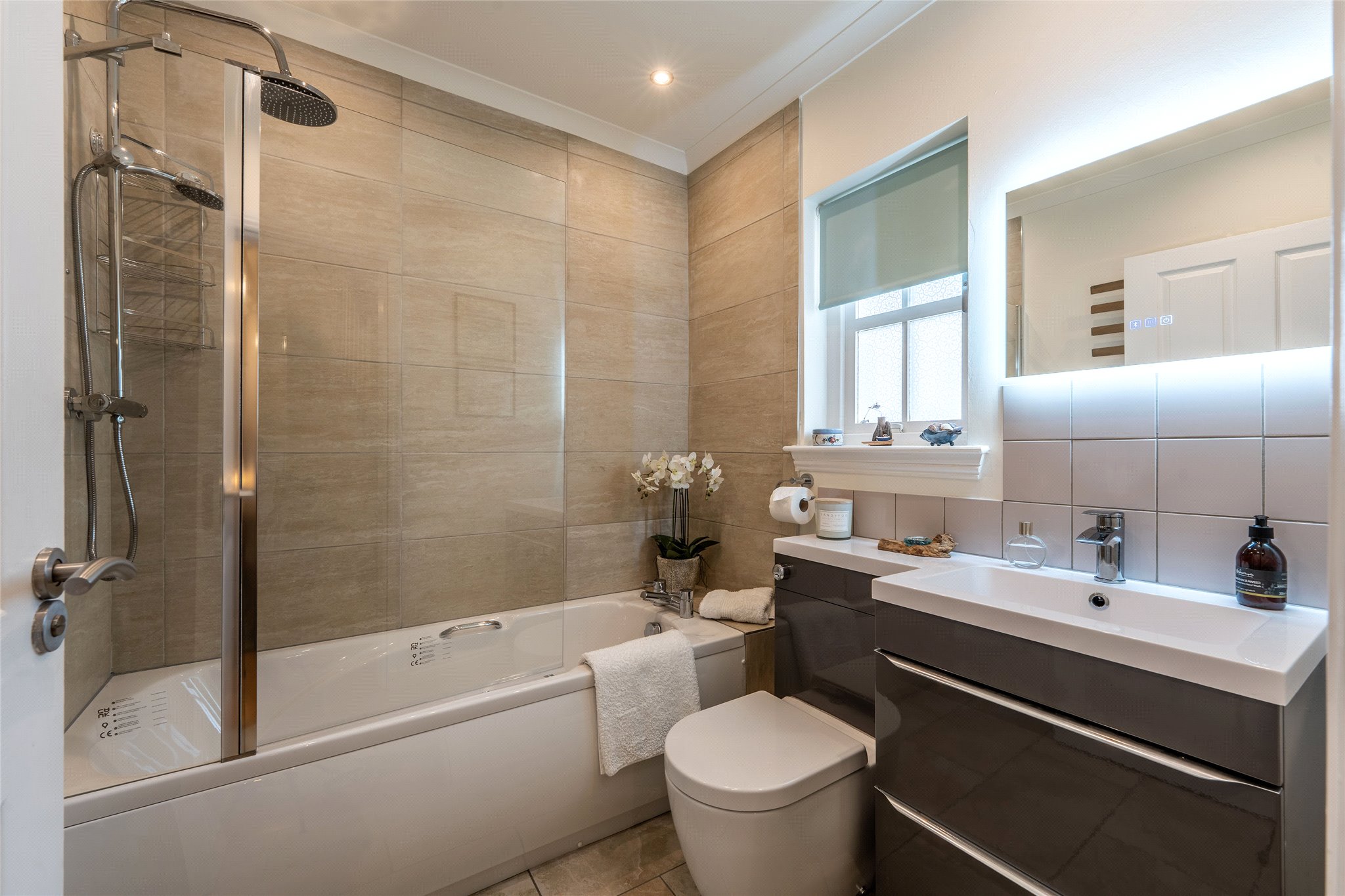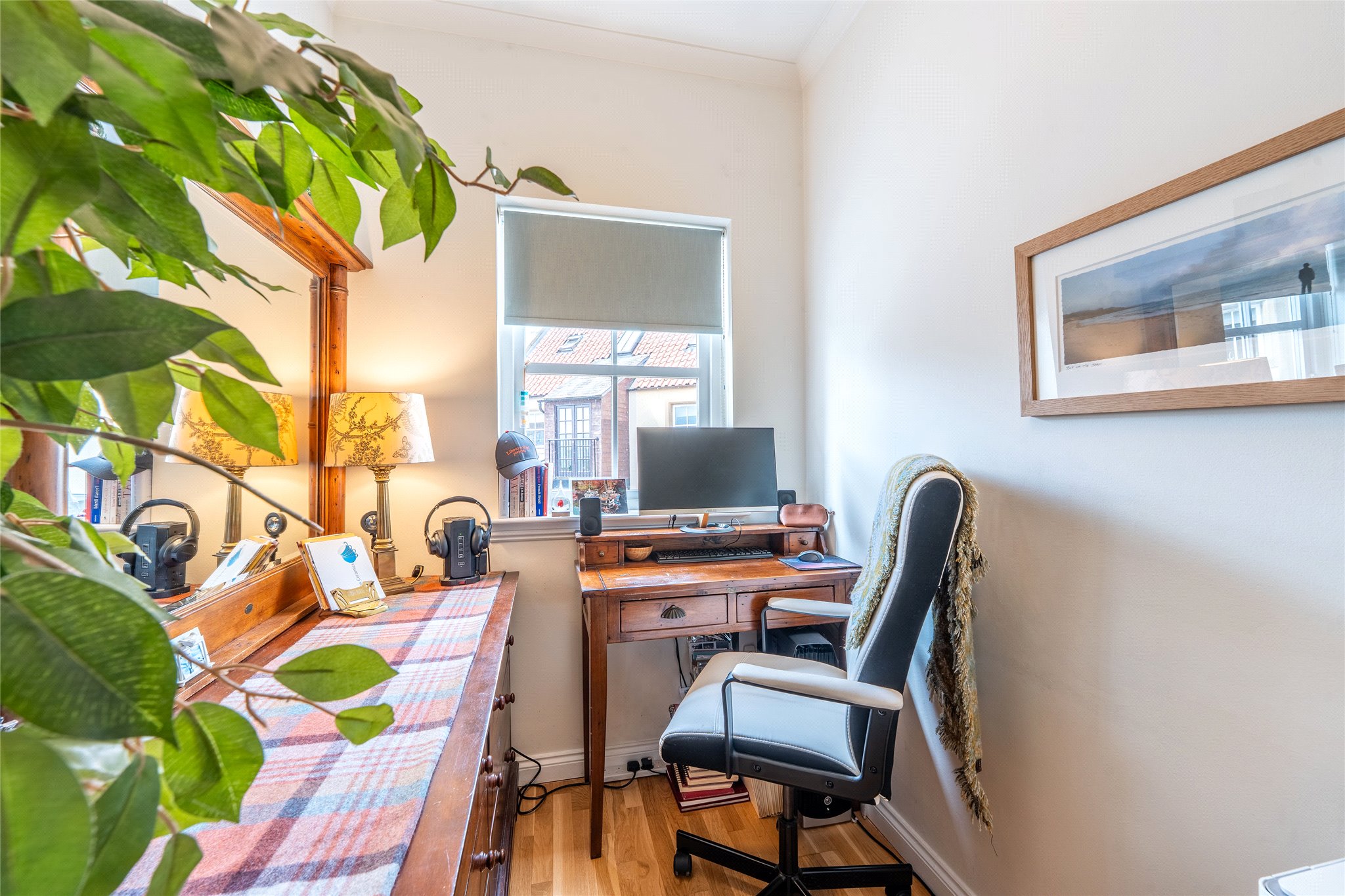 Spanning three floors of a handsome mid-terrace property and tucked away in a quiet cobbled courtyard minutes from Anstruther Harbour, this beautifully presented three-bedroom home offers an idyllic coastal home in turn-key condition. The front door opens into a tastefully decorated hallway showcasing wooden flooring and plentiful built-in storage. Continuing the same elegant finish, two generously proportioned east-facing double bedrooms provide comfortable and restful retreats, one enhanced by built-in wardrobes. The second bedroom, currently styled as a cosy sitting room, demonstrates the home’s versatility. Both rooms share access to a stylish modern bathroom finished to the highest standard and fitted with a hidden-cistern WC, washbasin built into vanity, and a bath with a wall-mounted rainfall shower. Carpeted stairs then lead to the first floor, where a bright and spacious dual-aspect living room awaits. With an east-west orientation, wooden flooring, and a calm, neutral palette, it exudes a relaxed ambience. A large walk-in cupboard provides excellent household storage. Adjoining is a sizeable dining kitchen with shaker-style wall and base units, illuminated natural-toned worktops, and high-spec integrated appliances including a stainless-steel extractor hood, oven, and hob. French doors open to a west-facing Juliet balcony overlooking the courtyard, an ideal spot to unwind. The top floor is dedicated to the principal suite, a peaceful and private retreat flooded with natural light from twin VELUX windows. This generously sized room features a serene colour scheme and a dedicated dressing room. A sleek contemporary en-suite shower room, complete with a hidden-cistern WC, chrome towel rail, and countertop washbasin, adds a luxurious finishing touch.