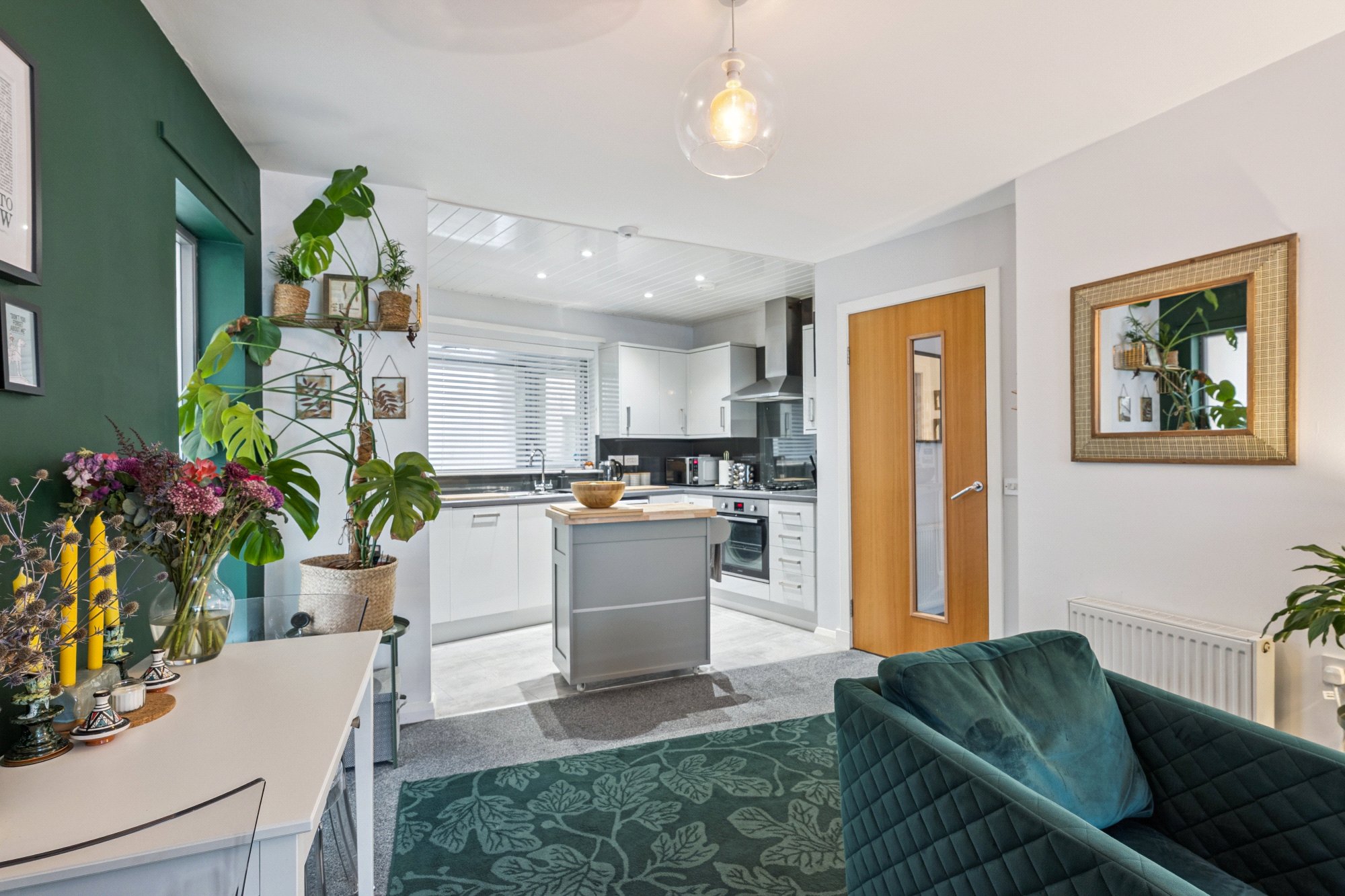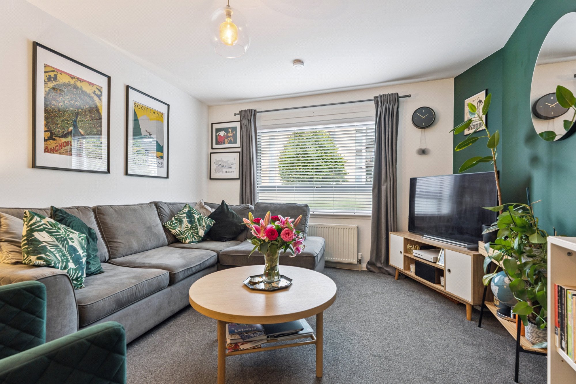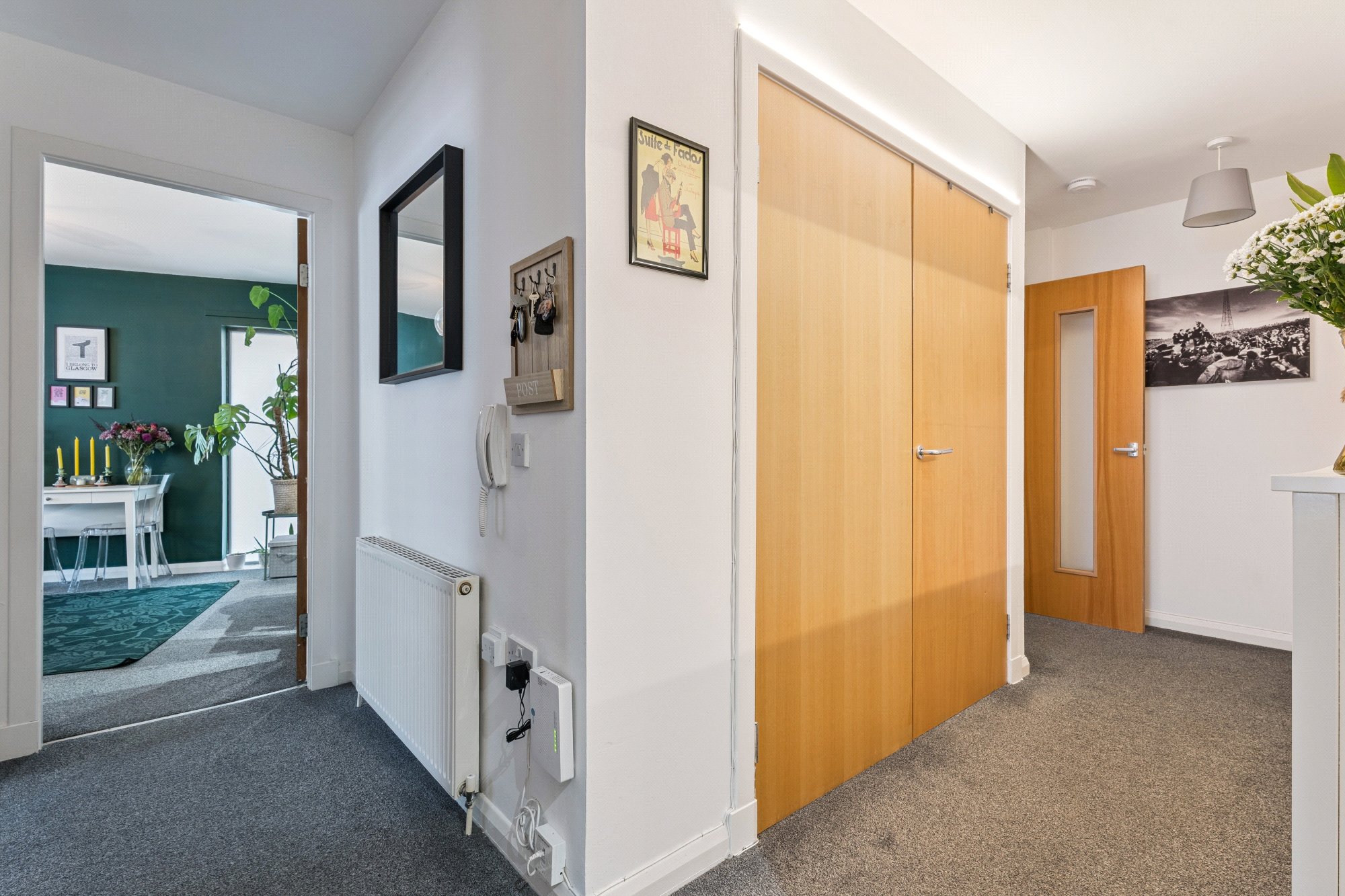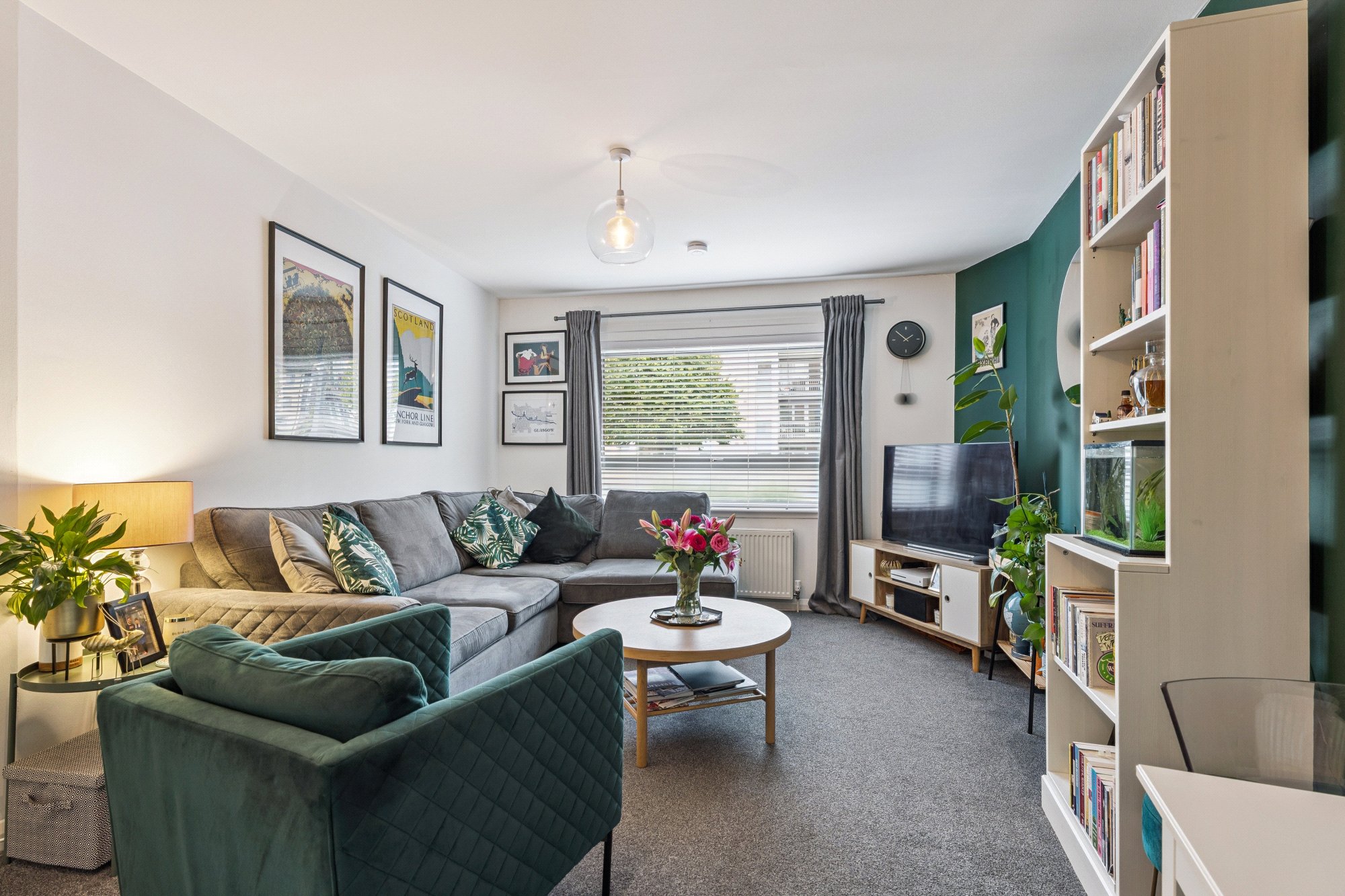 Accessed via a secure gate to the developments enclosed courtyard, with a paved walkway to front porch and entrance, the property benefits from main door access and extends to a generous 739 sq ft with aspects towards the gardens from the open plan fitted kitchen. The property benefits from great storage and residents parking on street. Comprising of a welcoming reception hallway with a very large storage cupboard, a generous angled walled living room offering lots of natural light with its 270-degree windows and space for dining. Set back from the living space is an open plan re-fitted modern kitchen with a range of base and tall wall mounted units, and integrated appliances. There are two double bedroom both with carpeted floor coverings, and with bedroom one having integrated wardrobes and modern en suite shower room. There is a main bathroom with three-piece white suite, and over bath shower. The property has great storage, double glazing, gas central heating, lovely residents’ courtyard gardens to the rear and ample parking in marked bays around the building.