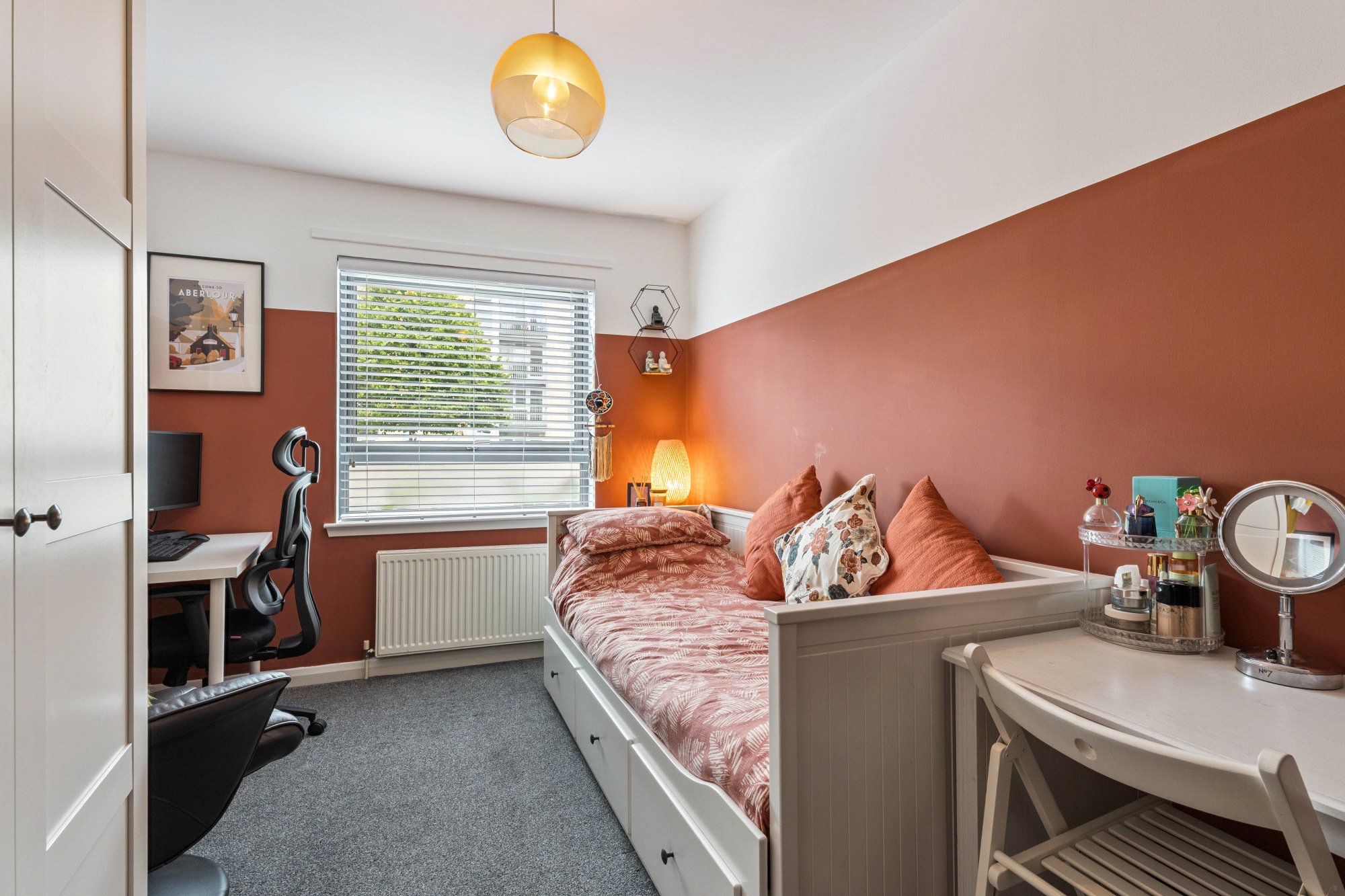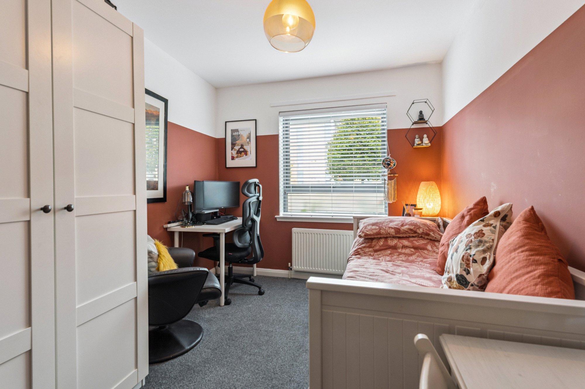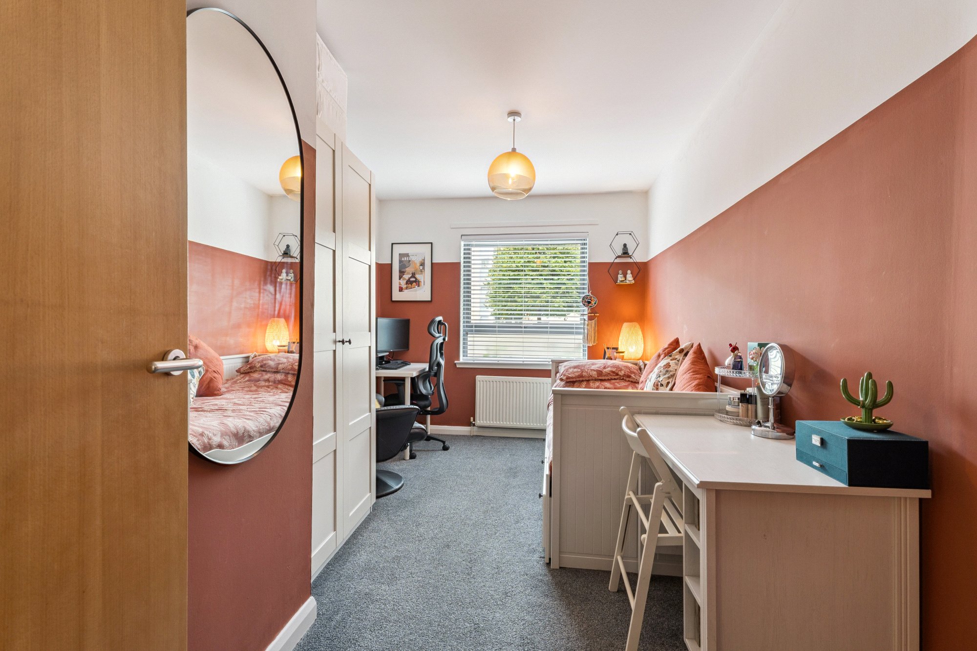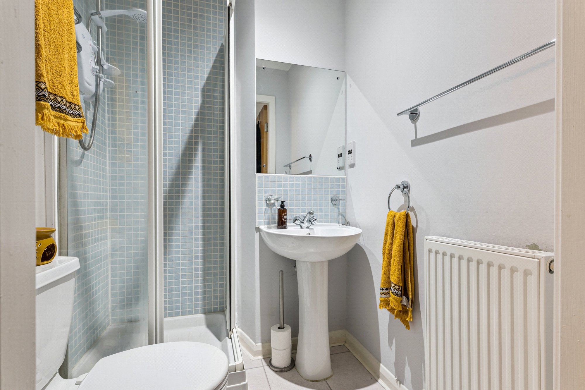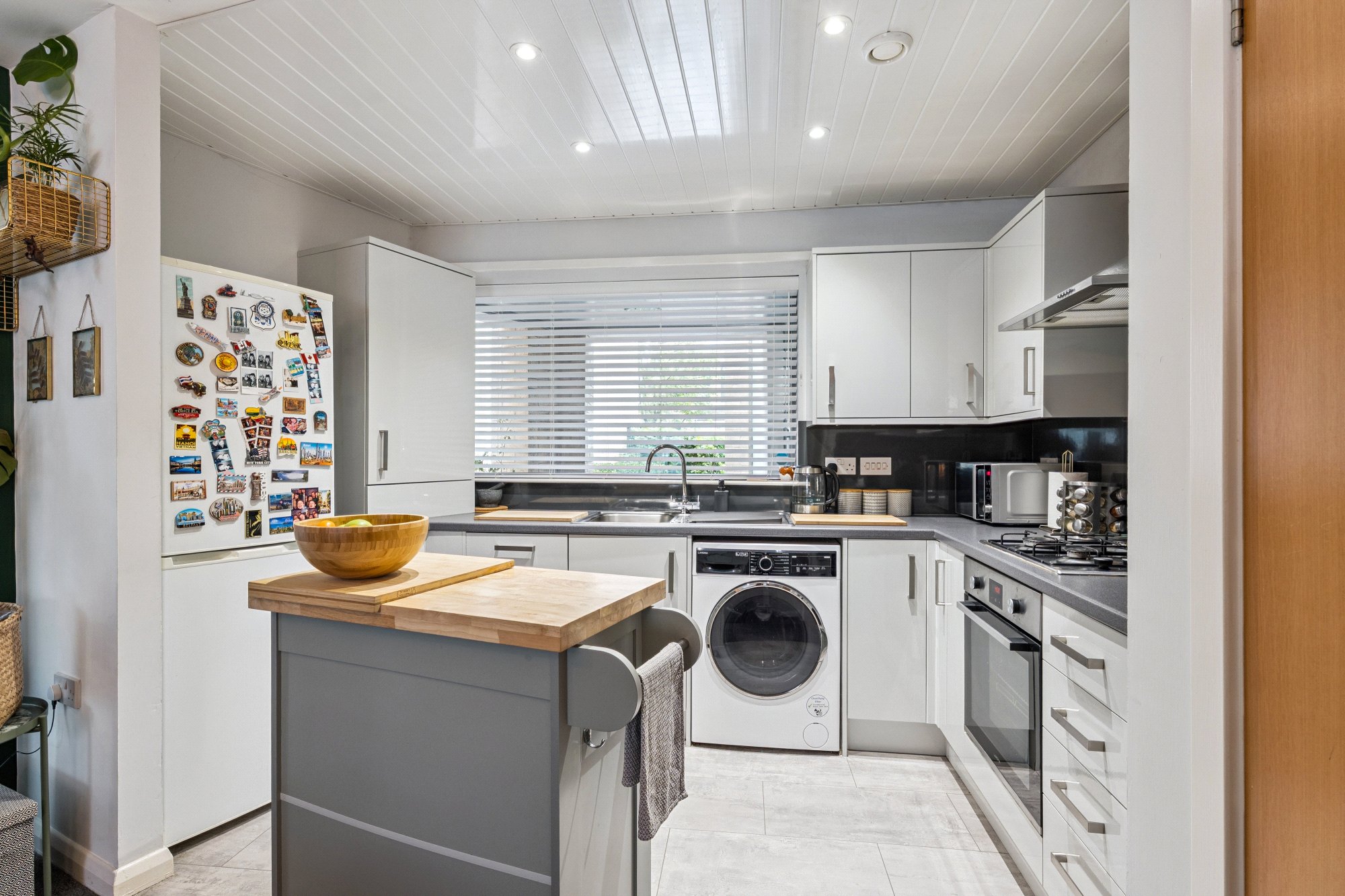 Accessed via a secure gate to the developments enclosed courtyard, with a paved walkway to front porch and entrance, the property benefits from main door access and extends to a generous 739 sq ft with aspects towards the gardens from the open plan fitted kitchen. The property benefits from great storage and residents parking on street. Comprising of a welcoming reception hallway with a very large storage cupboard, a generous angled walled living room offering lots of natural light with its 270-degree windows and space for dining. Set back from the living space is an open plan re-fitted modern kitchen with a range of base and tall wall mounted units, and integrated appliances. There are two double bedroom both with carpeted floor coverings, and with bedroom one having integrated wardrobes and modern en suite shower room. There is a main bathroom with three-piece white suite, and over bath shower. The property has great storage, double glazing, gas central heating, lovely residents’ courtyard gardens to the rear and ample parking in marked bays around the building.