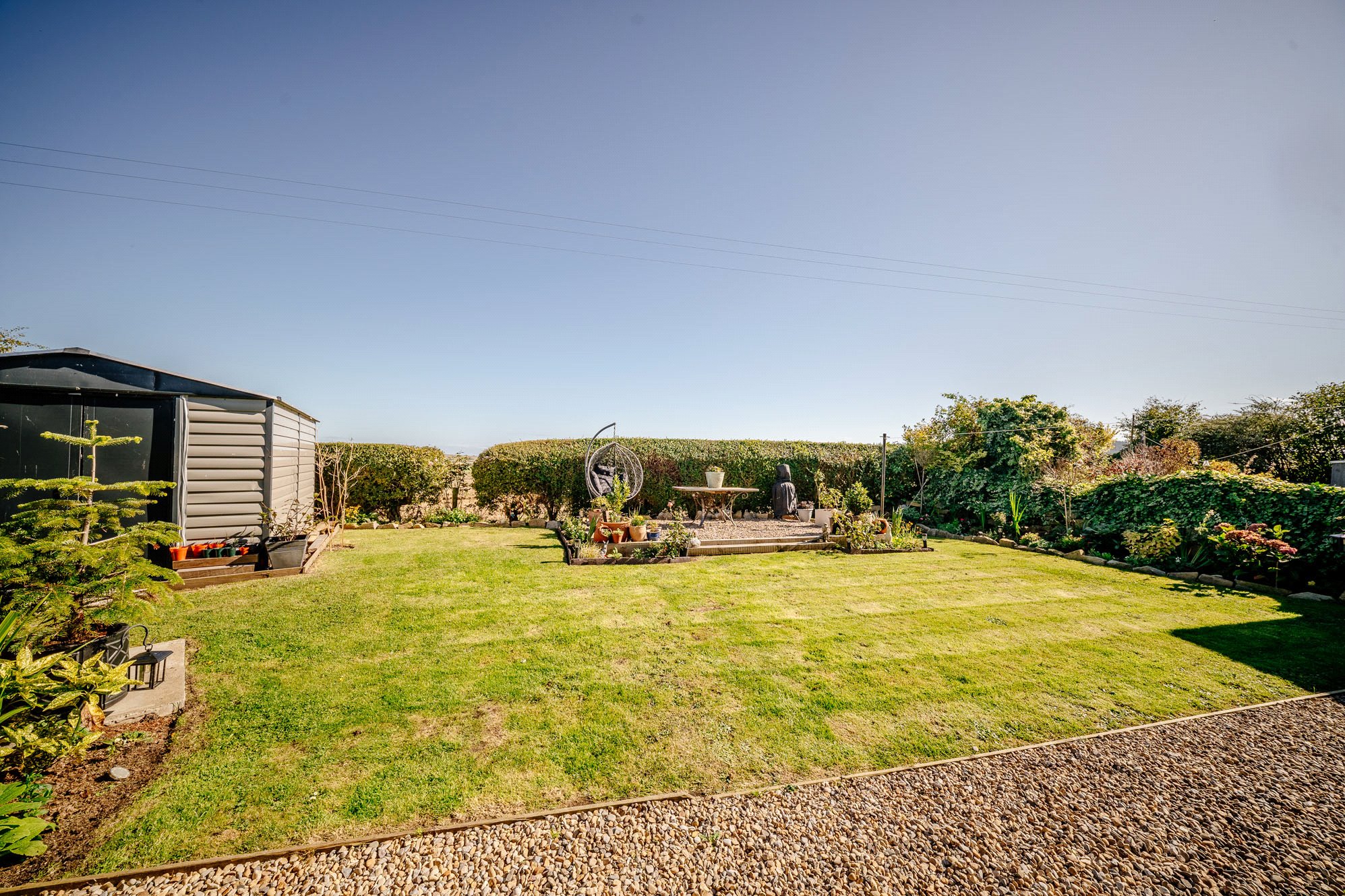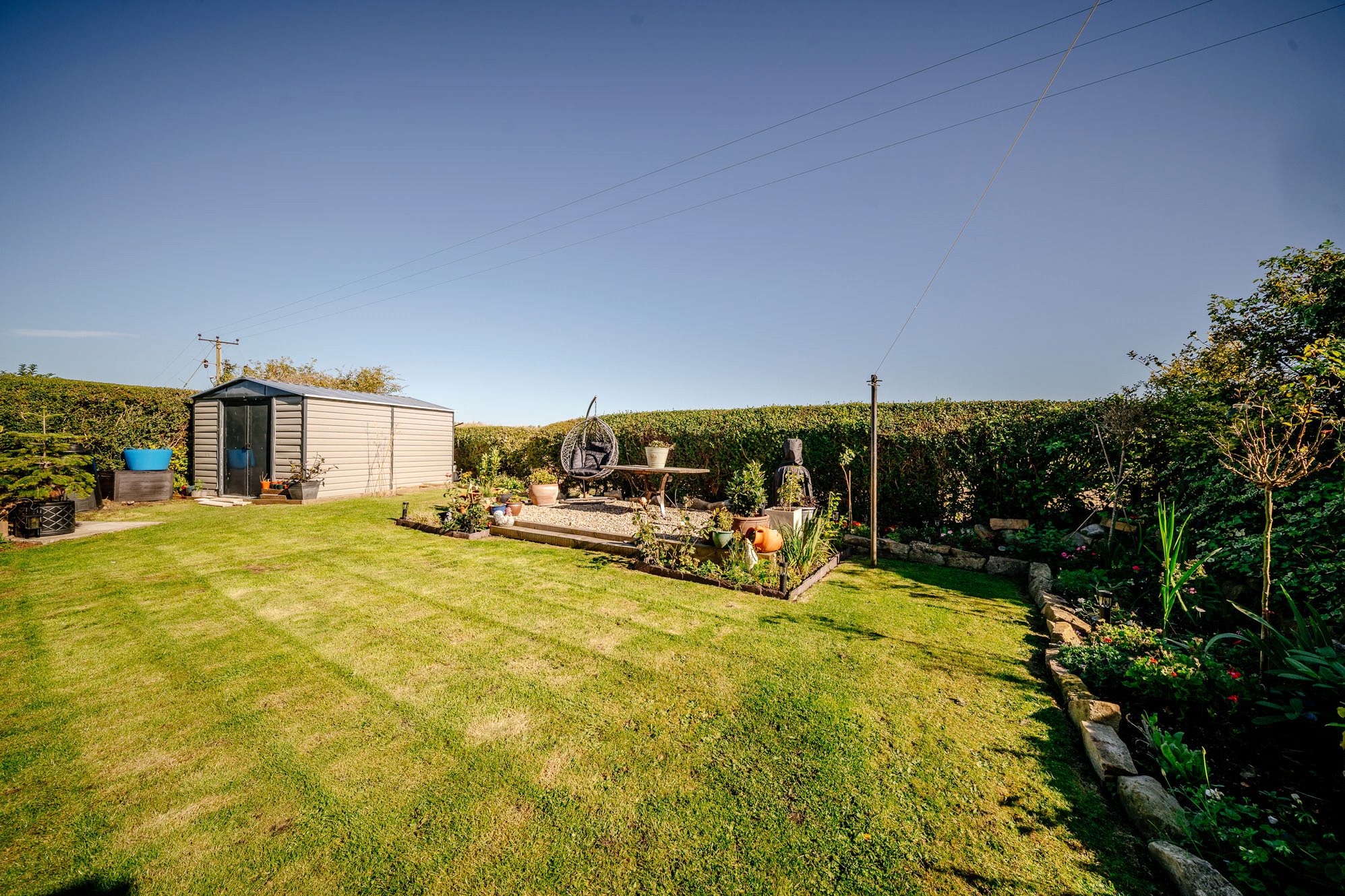 Parking on a driveway at the front of the house for two cars and a large enclosed rear lawn garden with a timber shed.