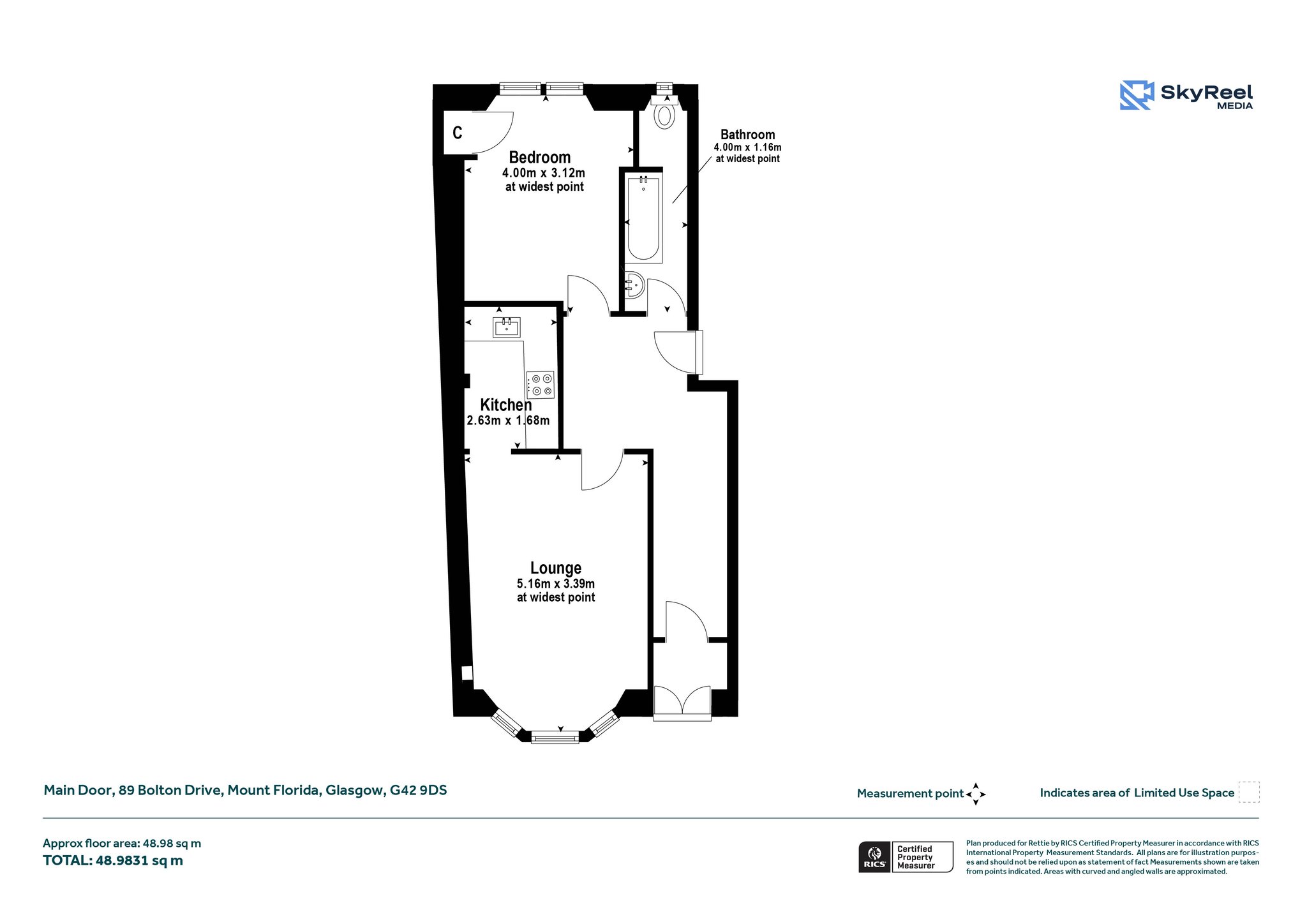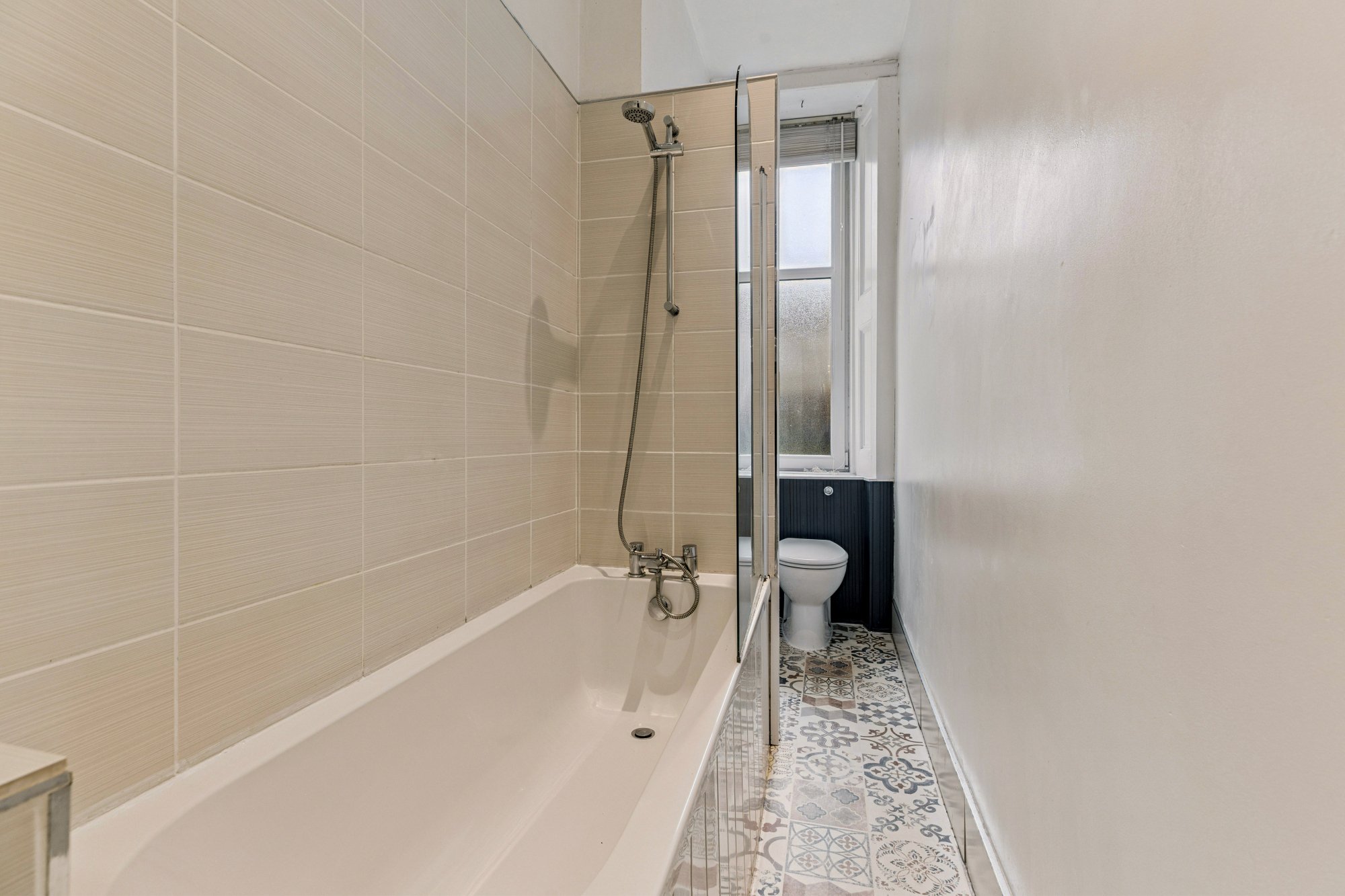The flat is entered via its own main door access. The accommodation of the flat itself comprises a spacious hallway, bay windowed lounge with cornice plaster and modern kitchen off the back which has white high gloss doors, wooden worktop and a range of base and wall mounted units, oven and hob. There is a double sized bedroom with a small storage cupboard off which houses the boiler and tiled bathroom with white three-piece suite.