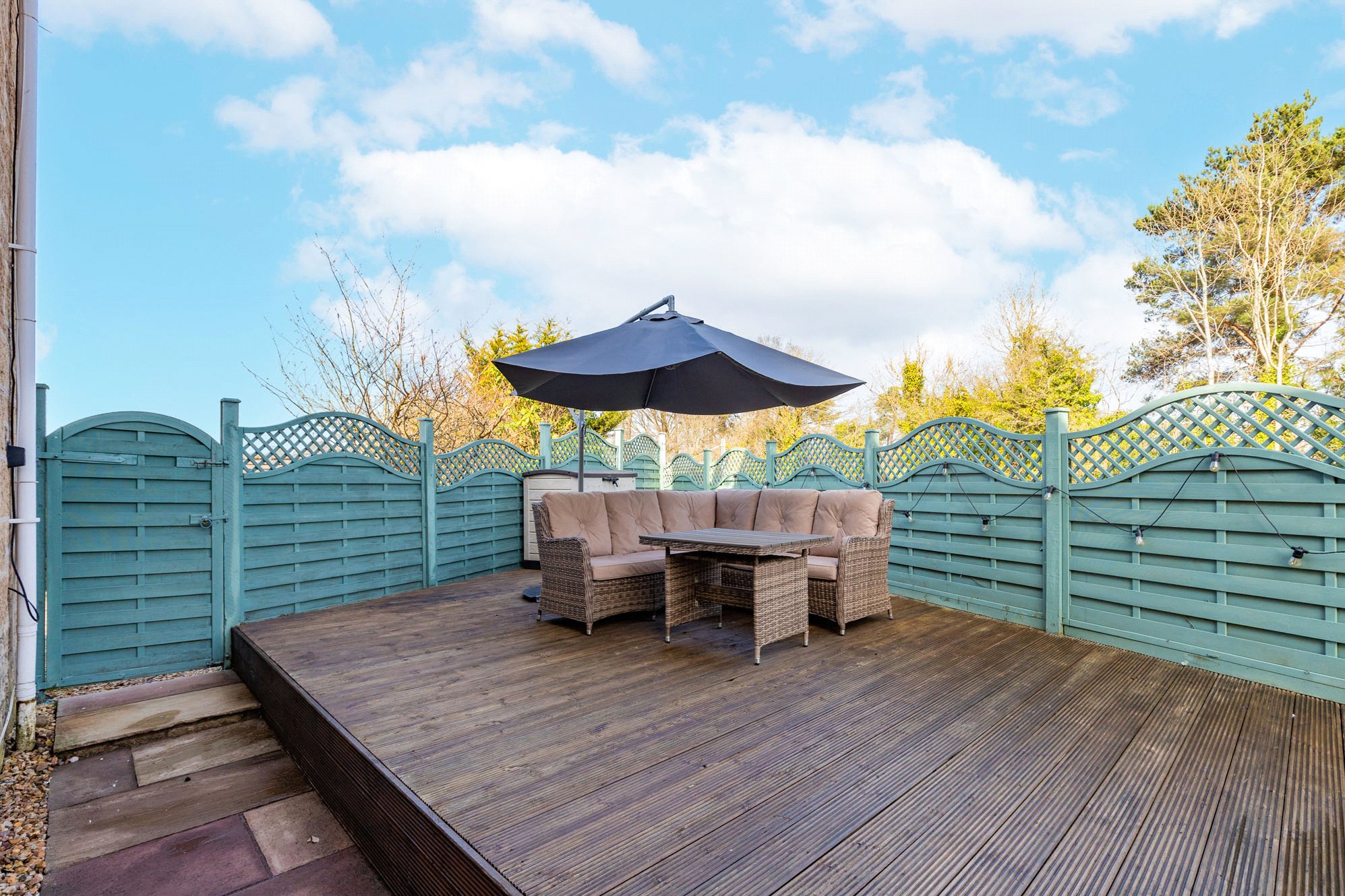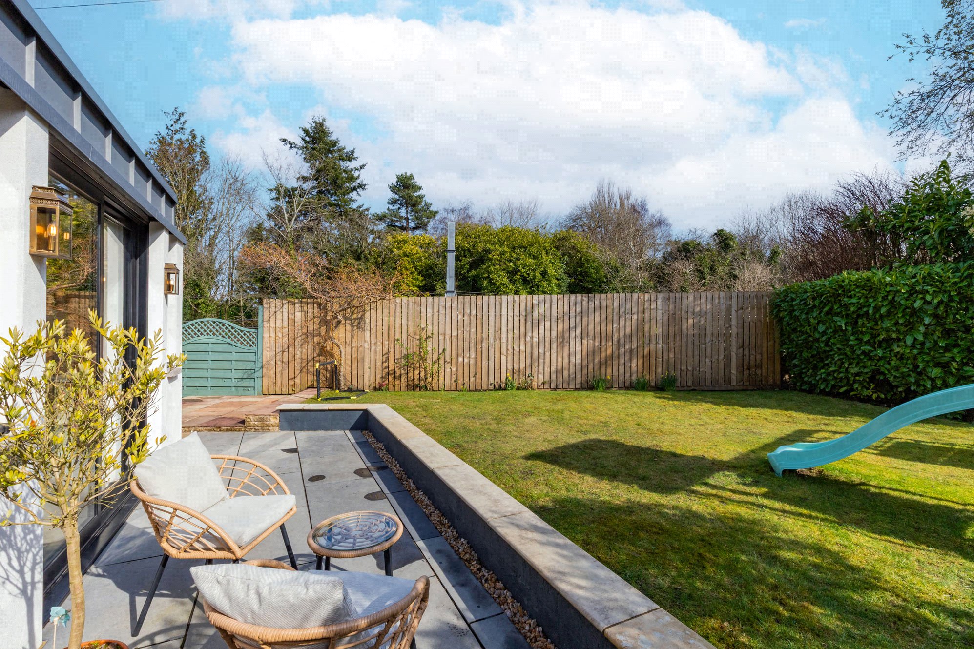 Externally, the property benefits from its end-terrace position, allowing for added light and a sense of openness. The gardens include generous patio and decked areas perfect for al-fresco dining and a lovely lawned area with mature trees. At the front this property benefits from its end of cul-de-sac position providing a large gravel driveway and detached garage providing excellent storage or secure parking.