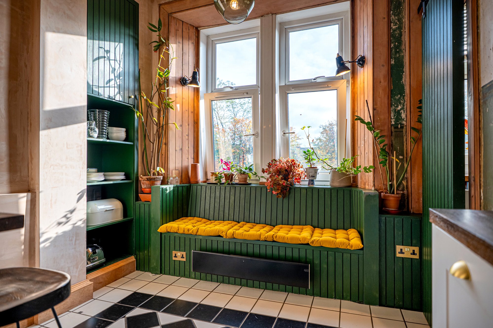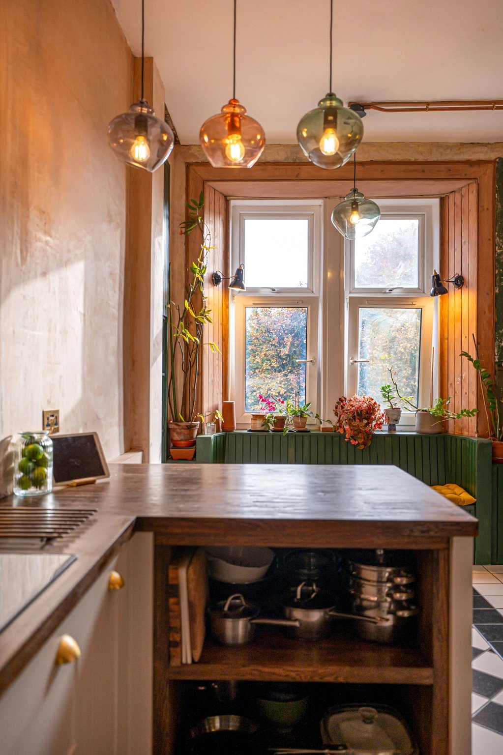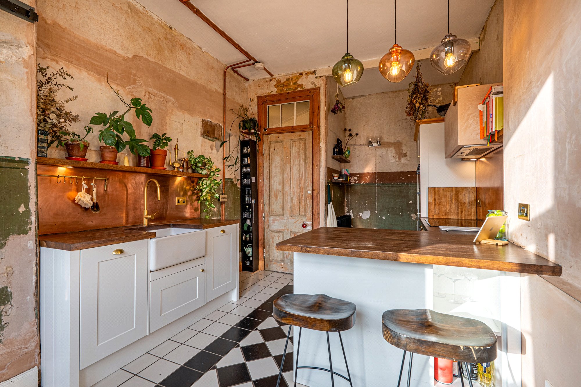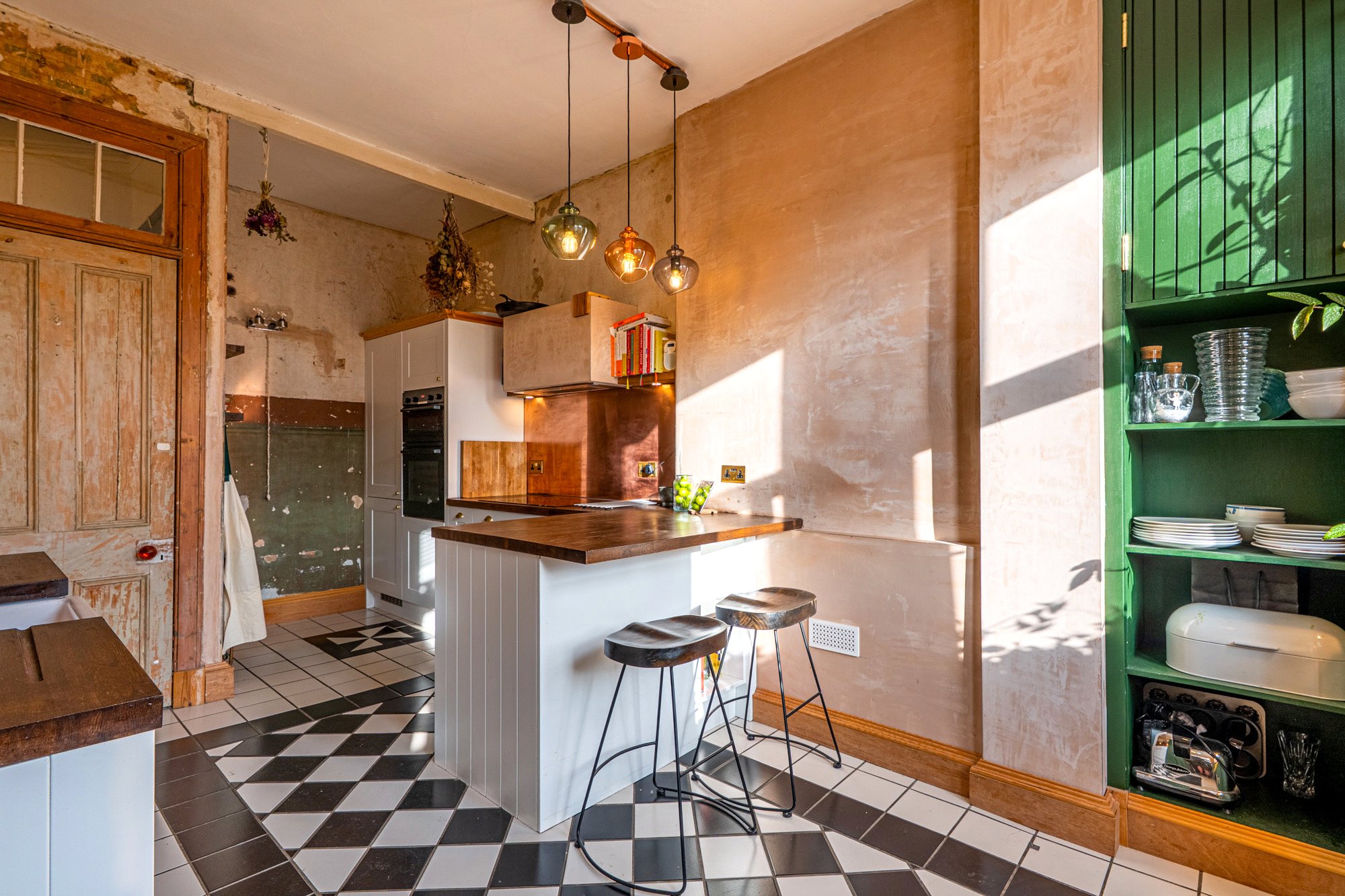 - Dining kitchen with butcher block countertops, contemporary units, ceramic “Belfast” sink, integrated appliances, breakfasting peninsula with pendant lighting, chequerboard tiled floor, bespoke joinery window seat, double window, and invaluable utility “neuk” behind sliding door.