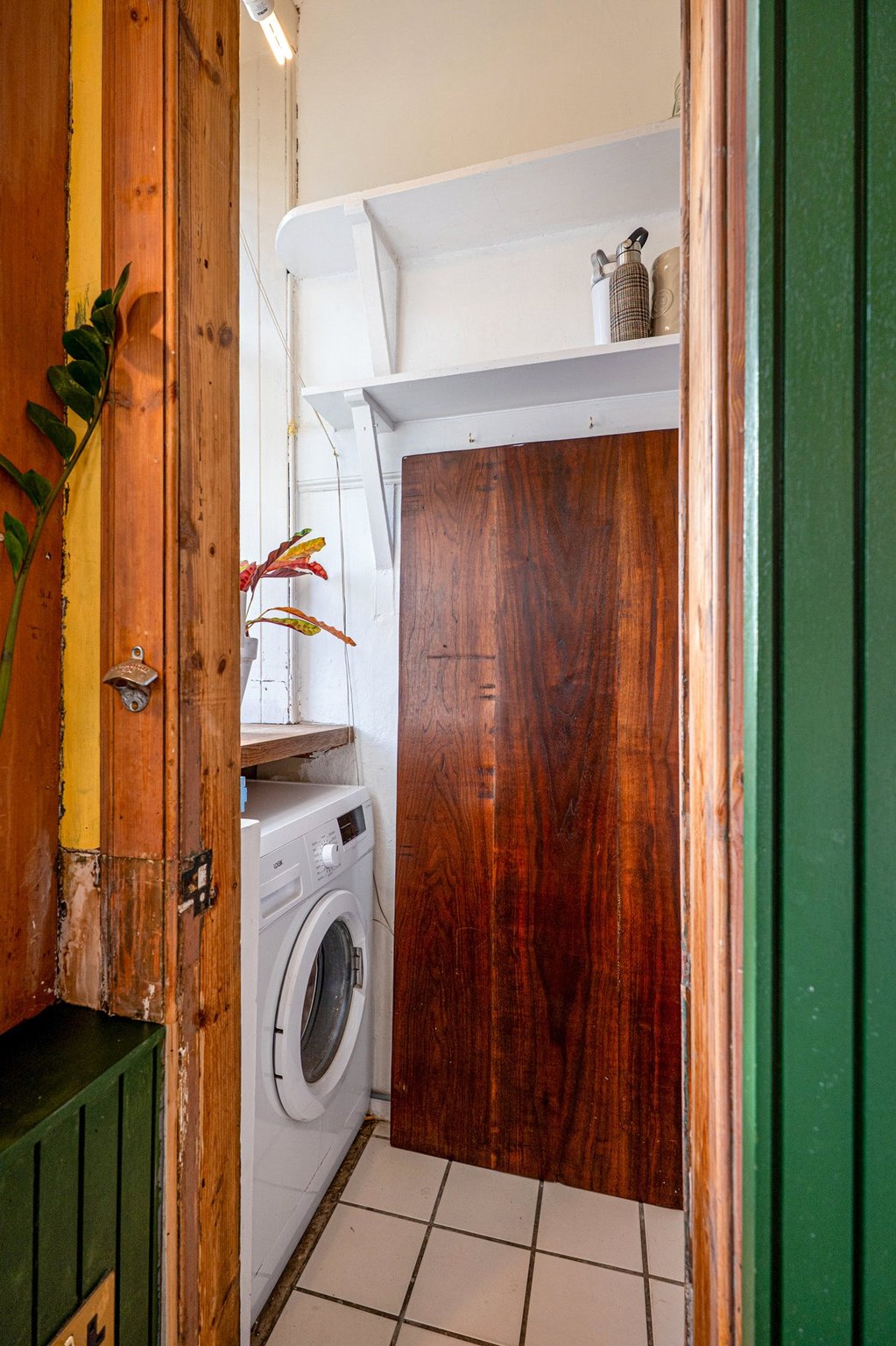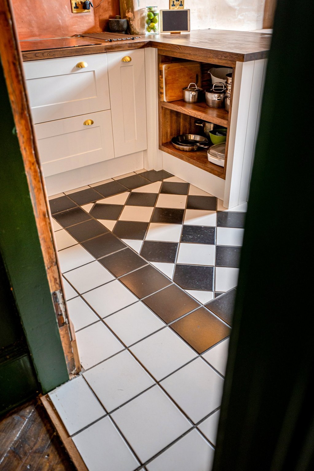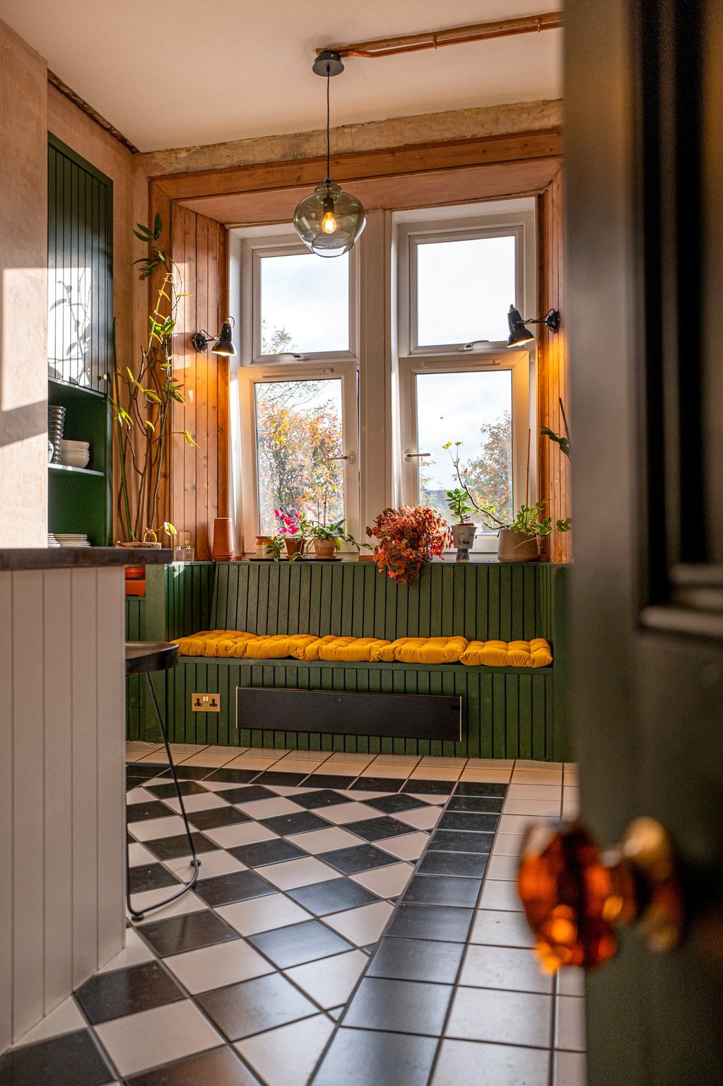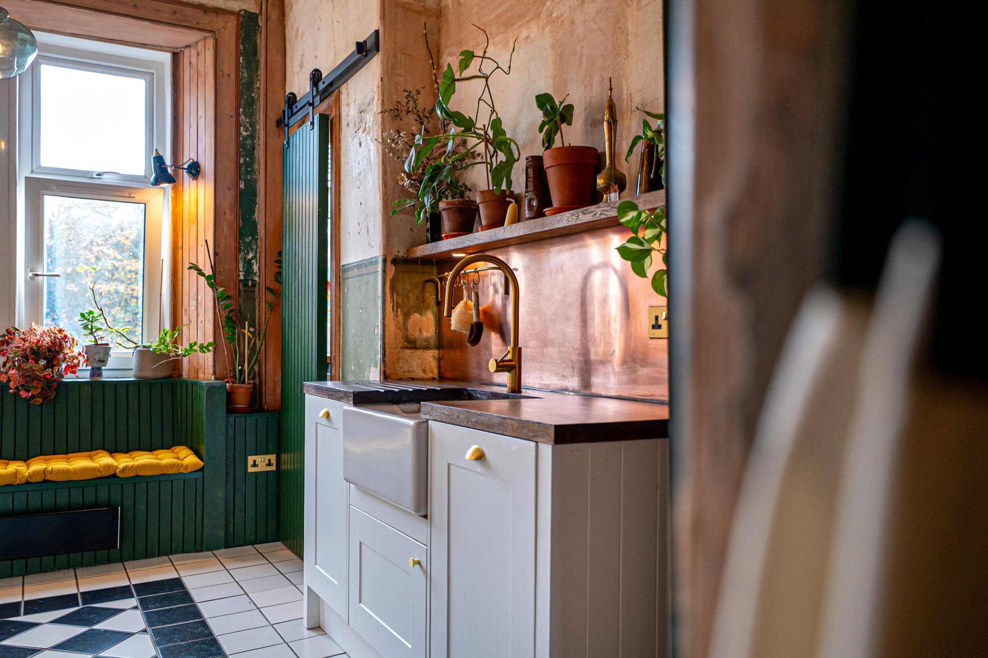- Dining kitchen with butcher block countertops, contemporary units, ceramic “Belfast” sink, integrated appliances, breakfasting peninsula with pendant lighting, chequerboard tiled floor, bespoke joinery window seat, double window, and invaluable utility “neuk” behind sliding door.