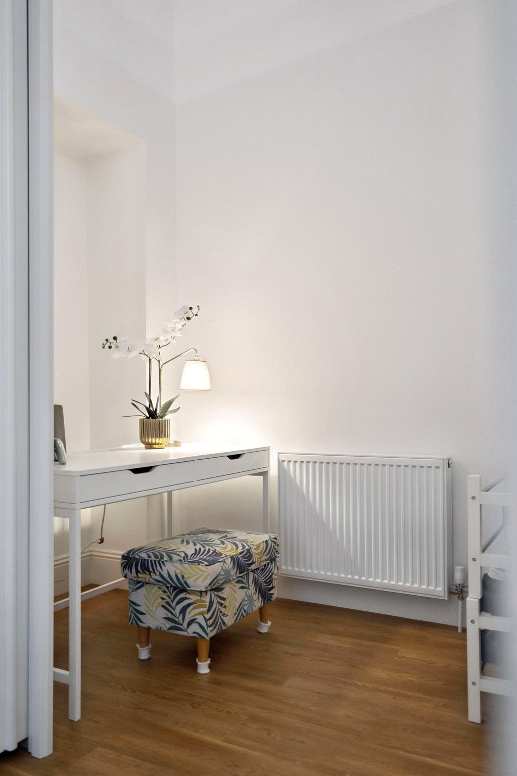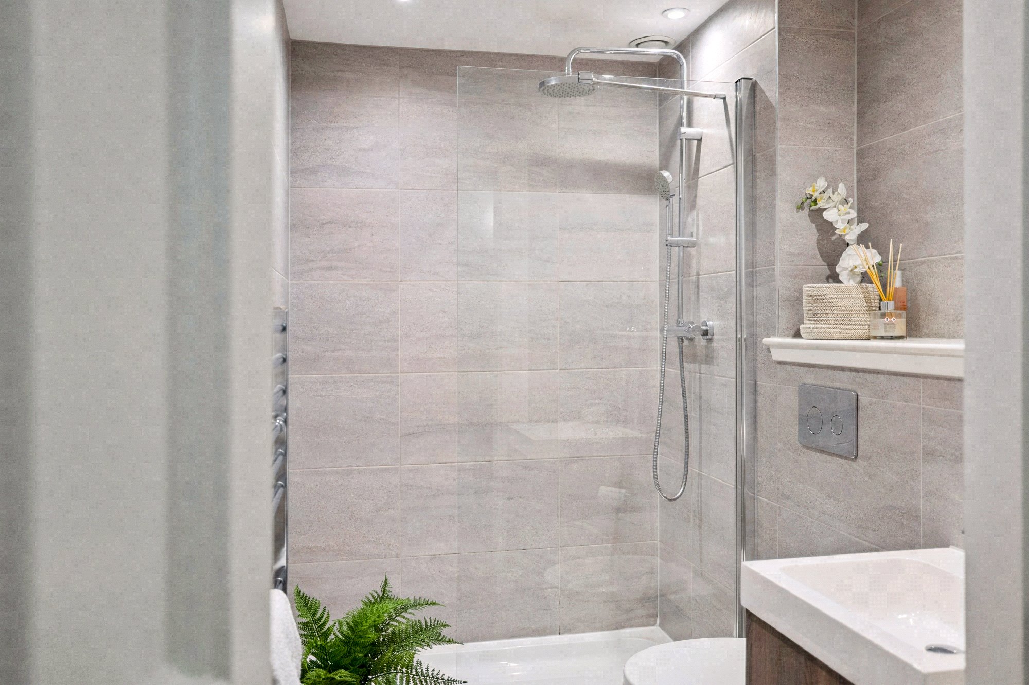 In brief, the accommodation extends to: a long welcoming reception hallway giving access to all principal apartments and featuring both a large storage cupboard and a separate utility cupboard; an elegant bay-windowed drawing room with convector fireplace; a spacious dining kitchen with full complement of fitted appliances; principal bedroom with bay window, dressing area including fitted wardrobes and a well-appointed en-suite shower room with vanity mirror; second double bedroom positioned quietly to the rear elevation with integrated wardrobe; and a highly versatile third room, which has been used as a single bedroom, study and exercise space, and is complemented by a beautifully finished adjacent shower room. Some purchasers may choose to utilise this space as a dressing room and en-suite for bedroom two — a testament to the flexibility of the layout.