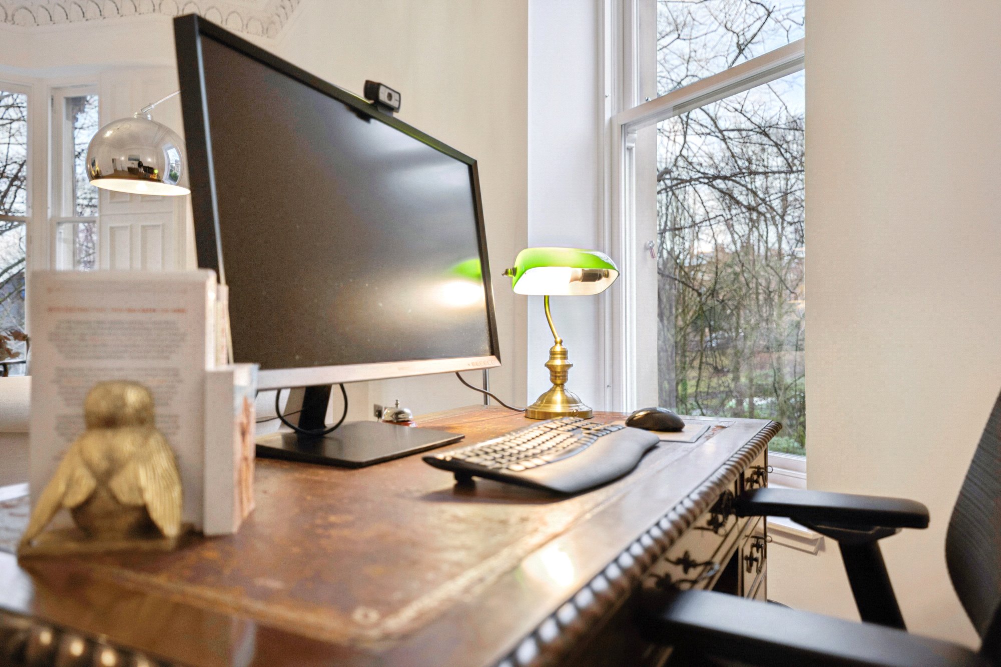 Benefitting from a highly central situation within one of Dowanhill’s most sought-after addresses — adjacent to The Botanic Gardens and approximately 0.3 miles from Byres Road’s cafés, boutiques, bars and restaurants, with Glasgow University also within easy walking distance — this particularly substantial two-bedroom first floor drawing room conversion occupies an enviable gable-end position within an elegant grand sandstone terrace, offering luxurious living quarters with the added benefits of secure private parking space, private bike store and access to impressive shared resident’s garden spaces.
