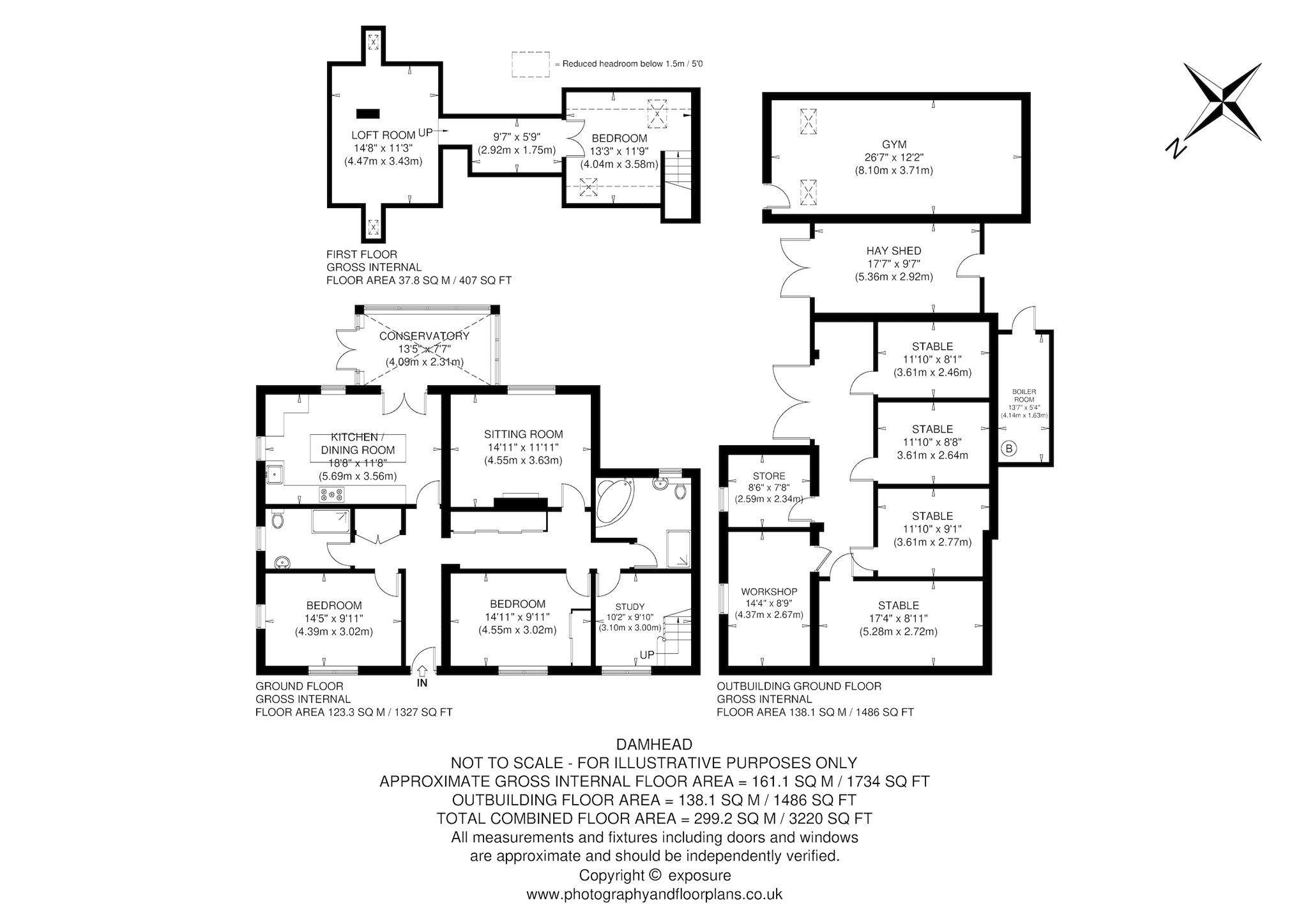Outbuildings: Extensive outbuildings, consist of a stable block with four loose boxes, a tack room and feed store, adjacent is a storeroom currently used for storing logs, with garden shed behind and a separate home gym.