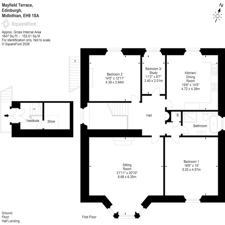 Vestibule, Store, Central Hallway, Sitting Room, Kitchen/Dining Room, Principal Bedroom, Second Bedroom, Third Bedroom/Study, Bathroom