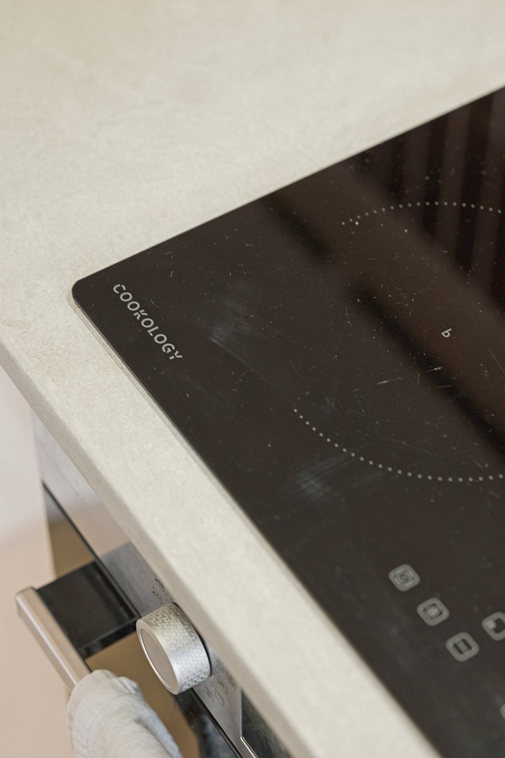 - Open-plan kitchen off the corner of the living room, featuring sleek modern units, an induction hob, and integrated appliances, including a recessed fridge