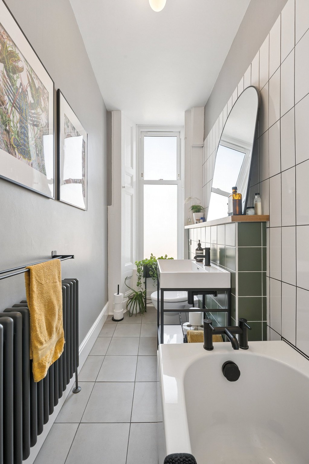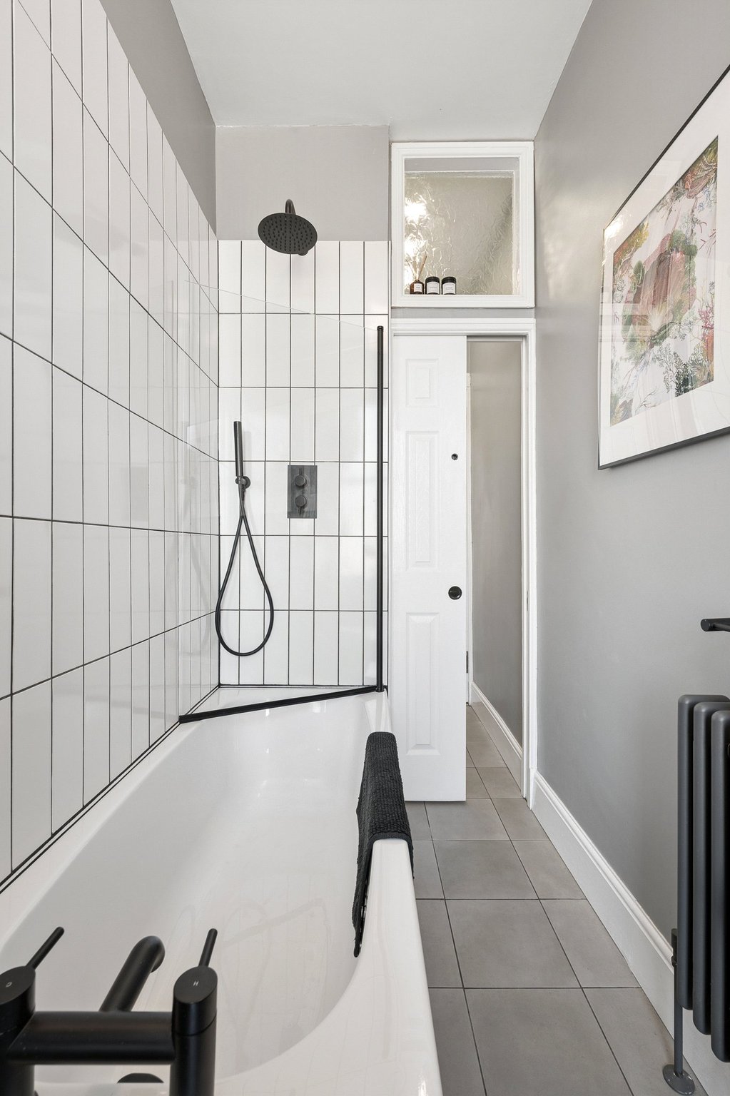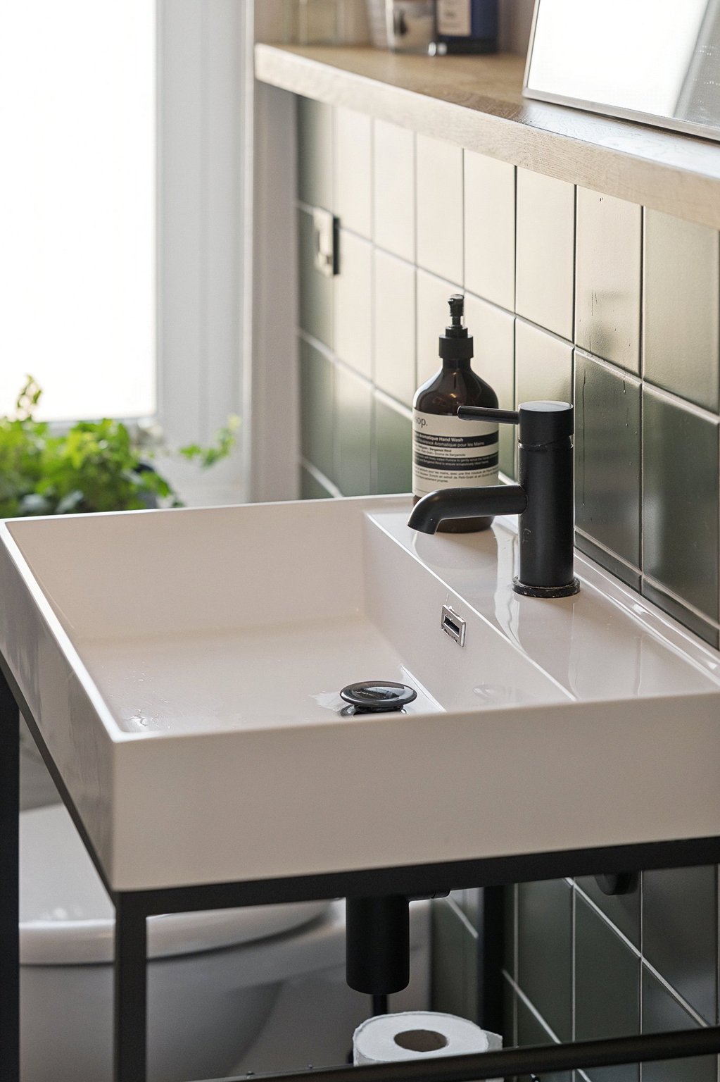 - Stunning bathroom with flat-profile subway tiling and contrasting black fixtures, including a beautiful wash hand basin stand