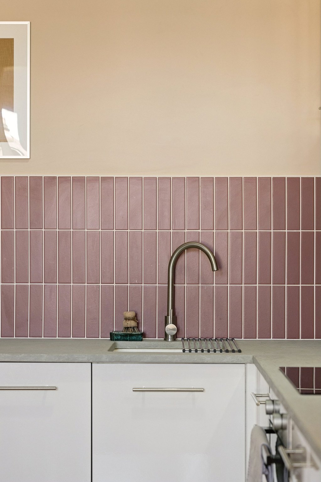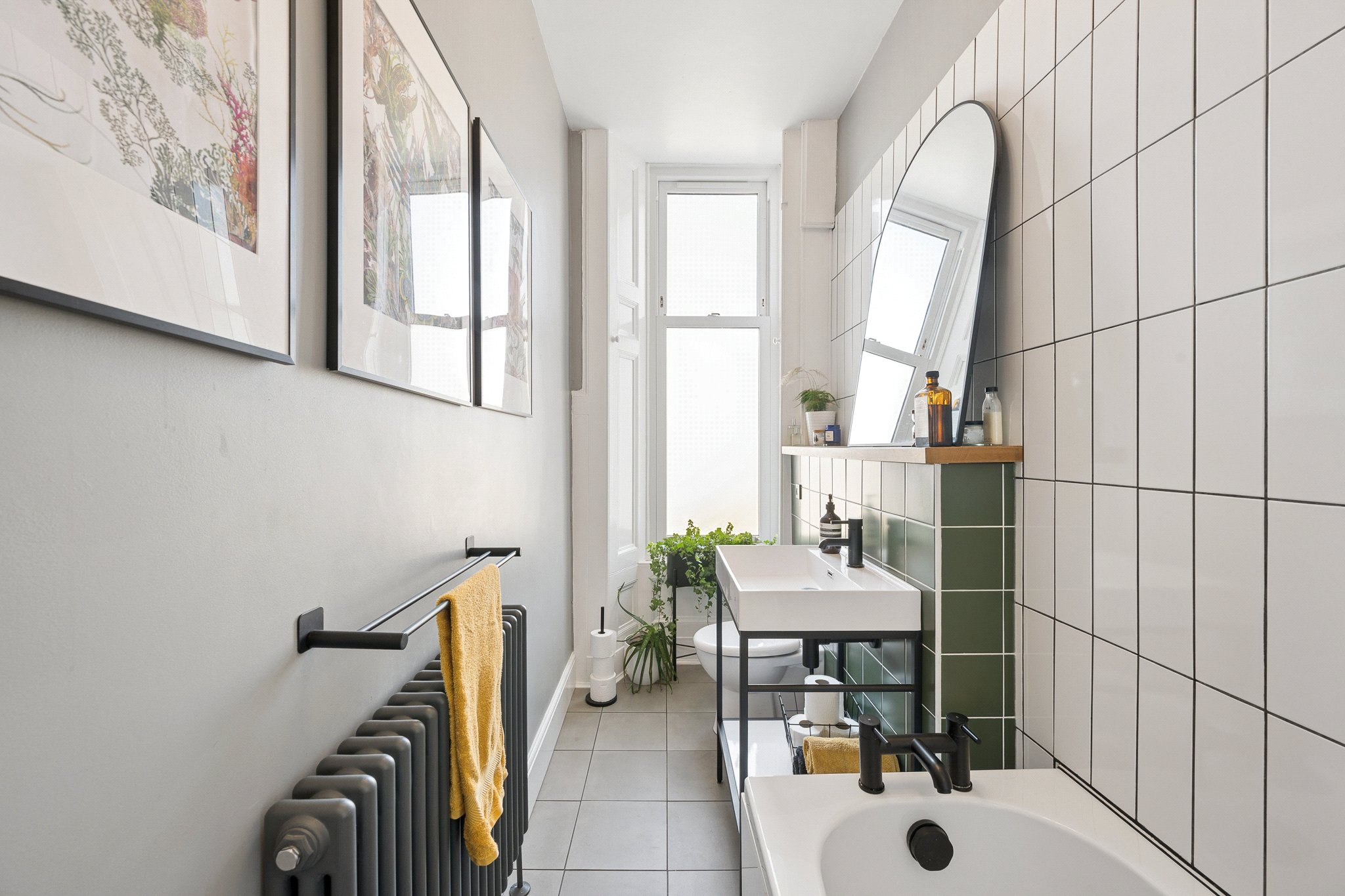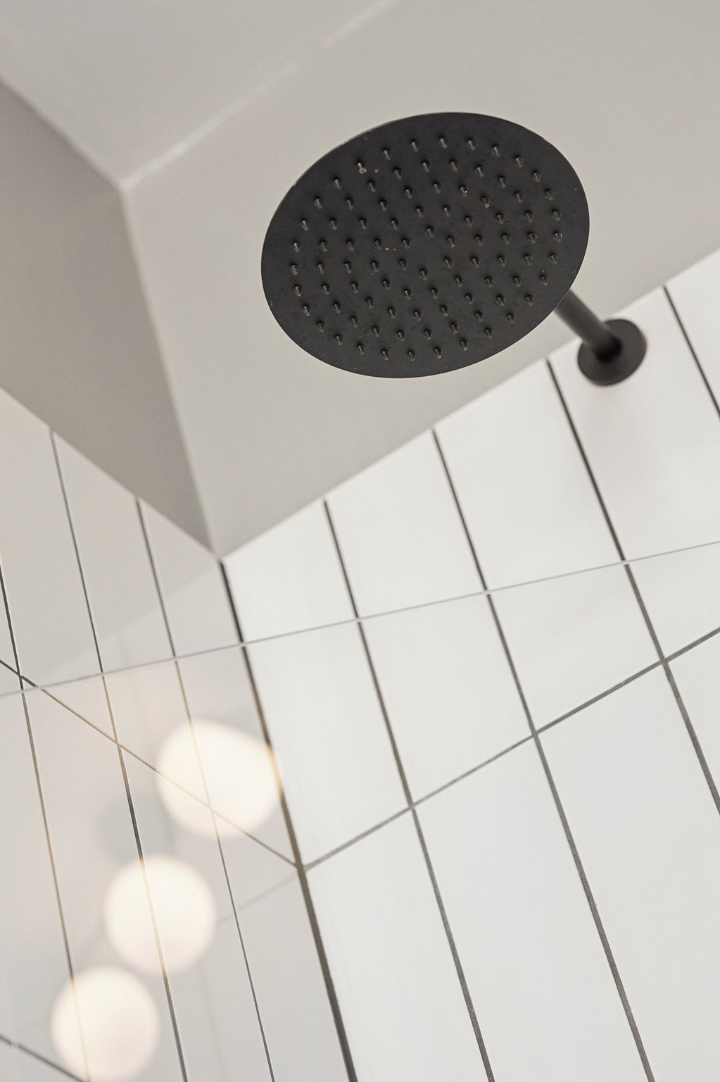 - Stunning bathroom with flat-profile subway tiling and contrasting black fixtures, including a beautiful wash hand basin stand