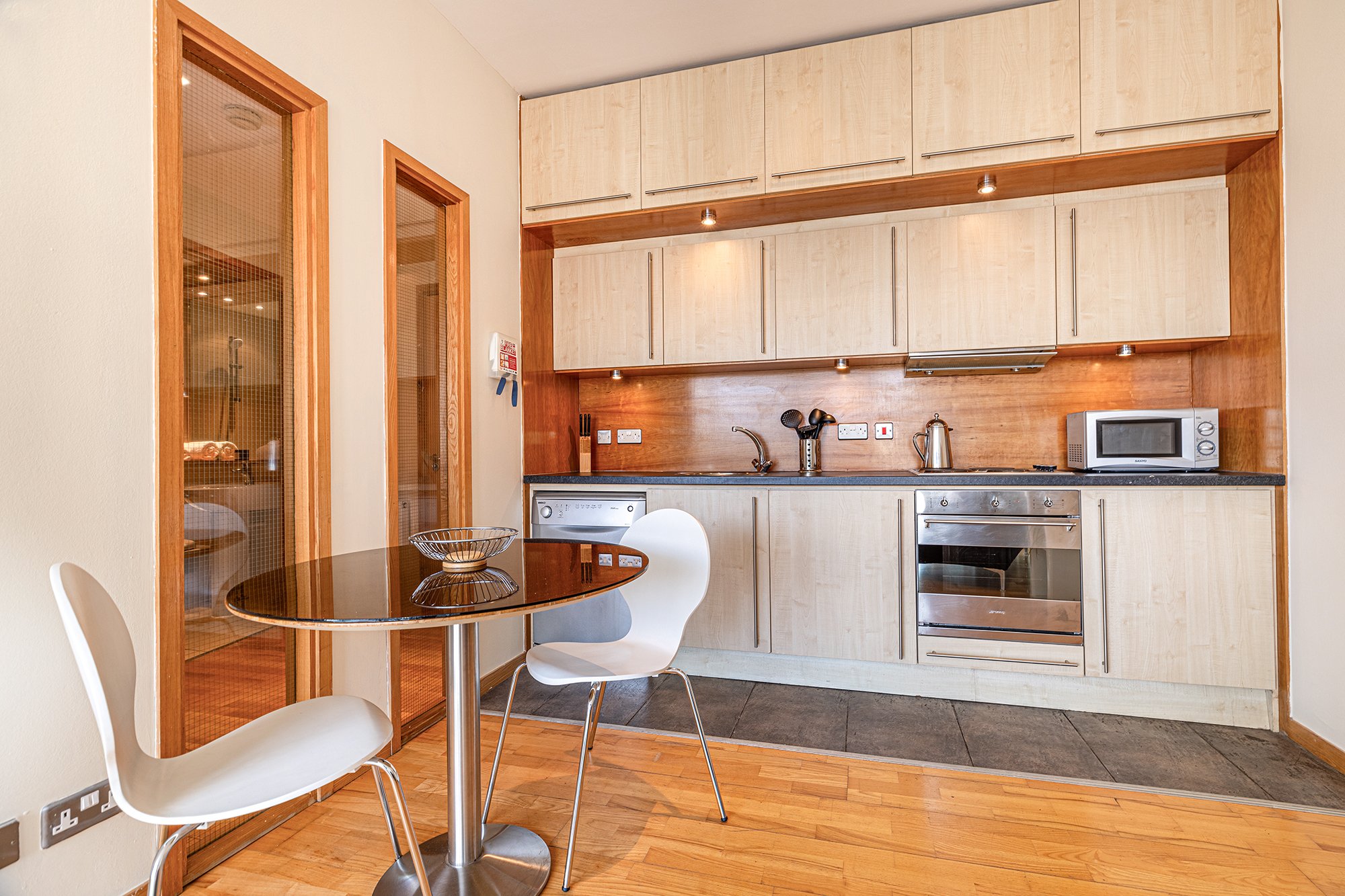 - Galley style kitchen area complete with a range of base and wall units to full height, and under counter dishwasher and integrated appliances.